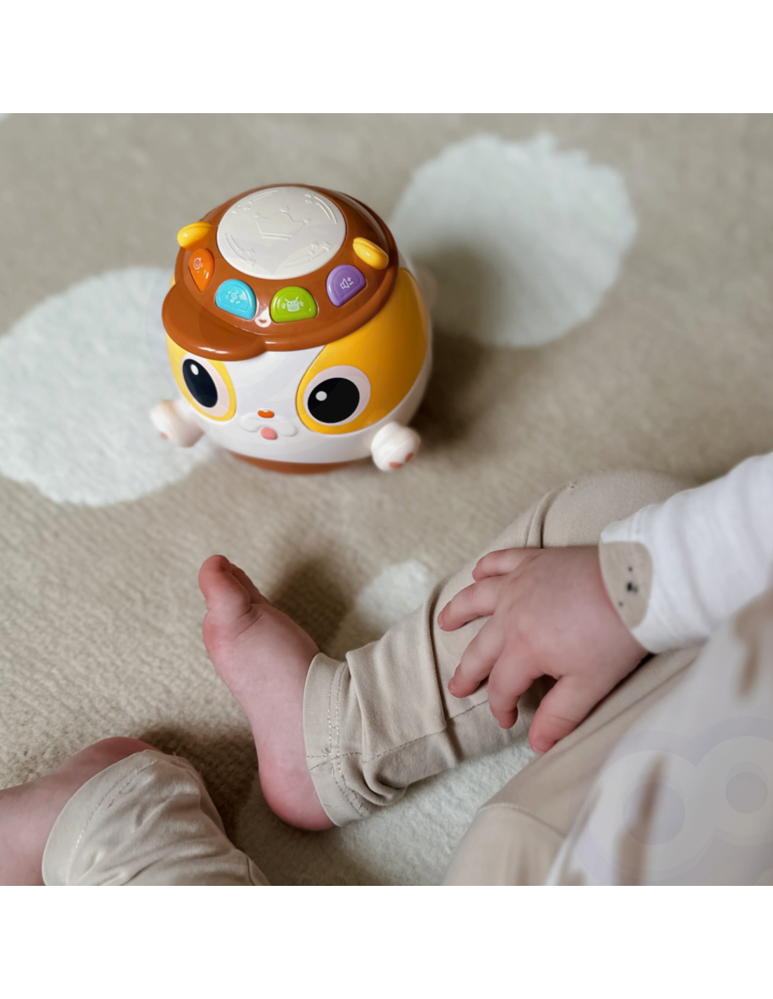 The Musical Ball Dog is an interactive toy from the WOOPIE brand. The musical ball has buttons that, when pressed, activate sounds that stimulate the sense of hearing . The musical dog is perfect for children from 18 months of age, made of safe plastic, and also has stimulating light effects. visual development . It is very useful in developing children's motor skills .
