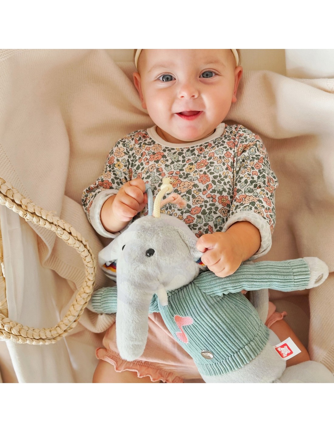 The interactive cuddly elephant from WOOPIE will soothe and lull your child to sleep. It's both a charming, soft and cuddly companion and a great companion for games and play.