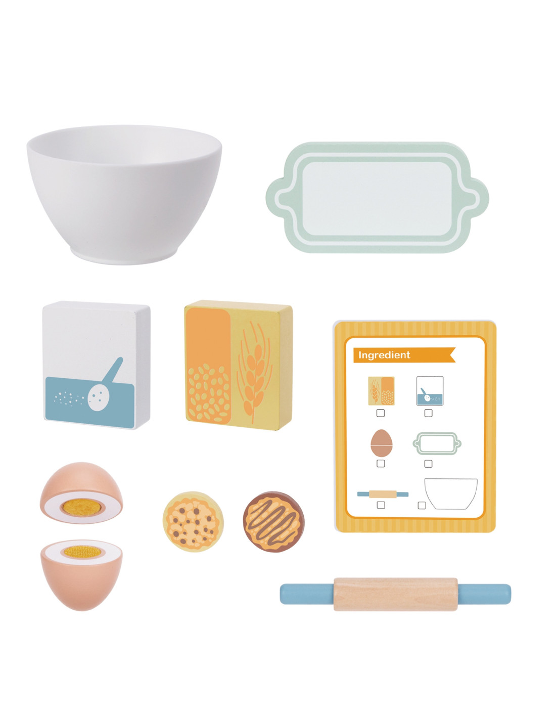 The set includes 11 pieces , including a mixer, bowl, flour, sugar, a Velcro egg, cookies, and many other accessories that will add variety to any playtime and encourage your child to role-play. This ensures boredom is never an option!
