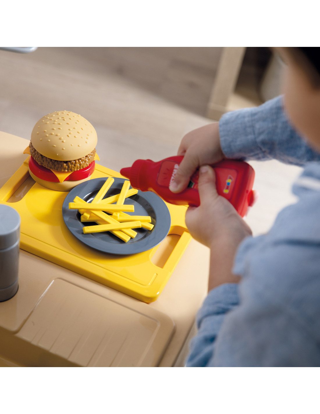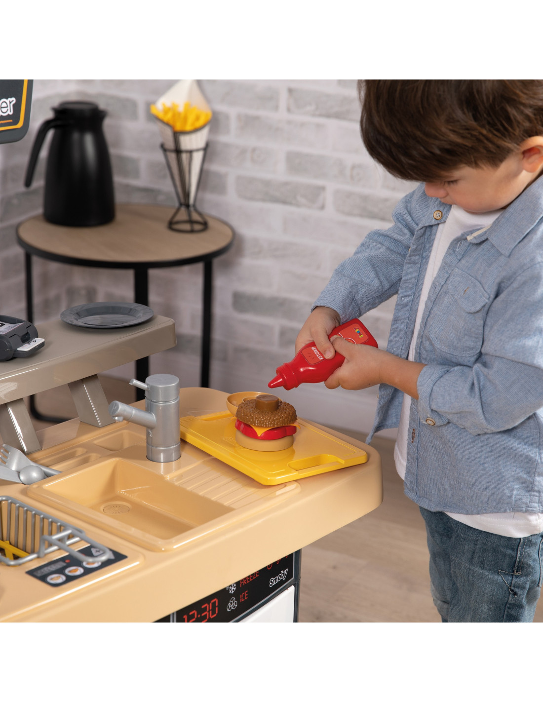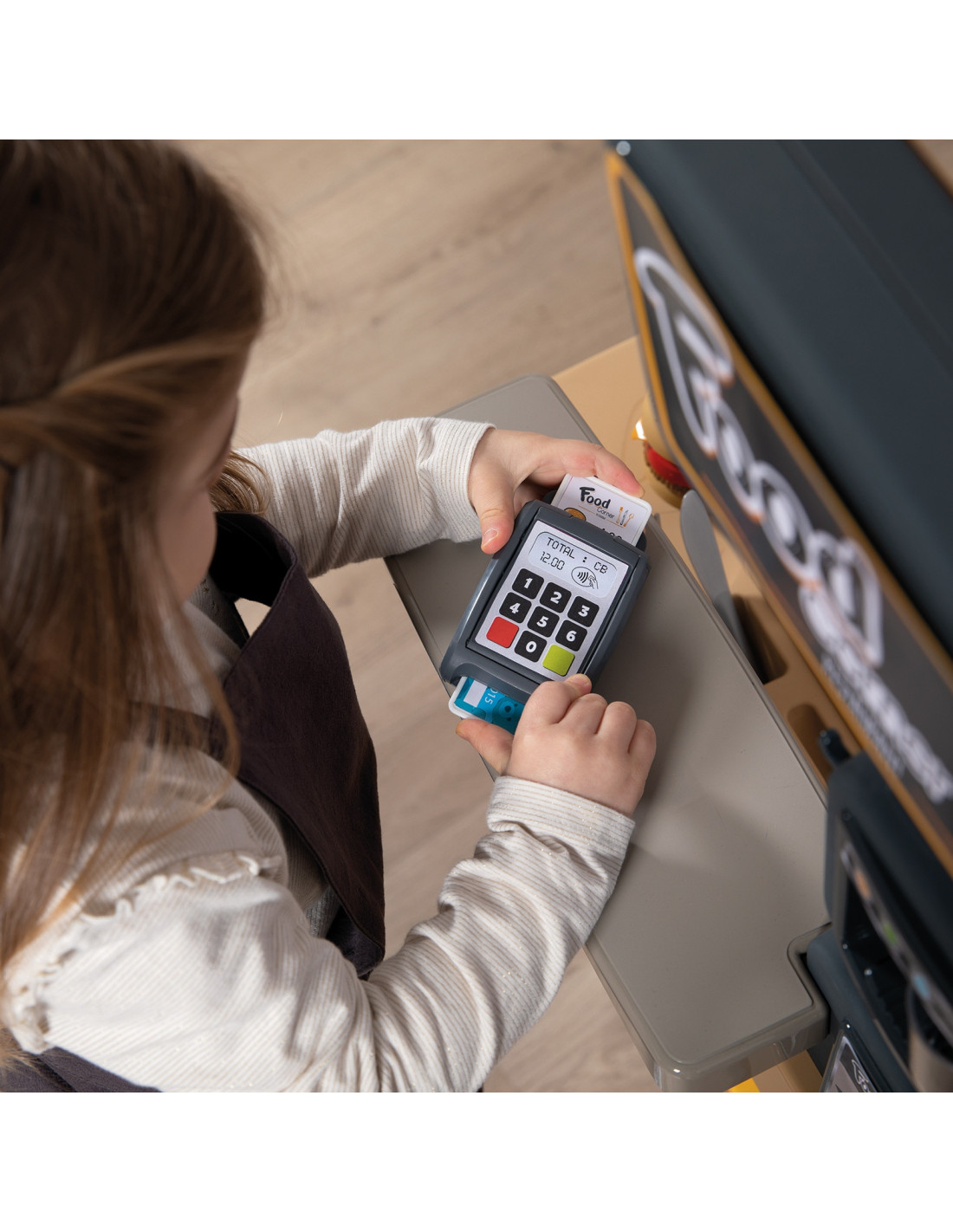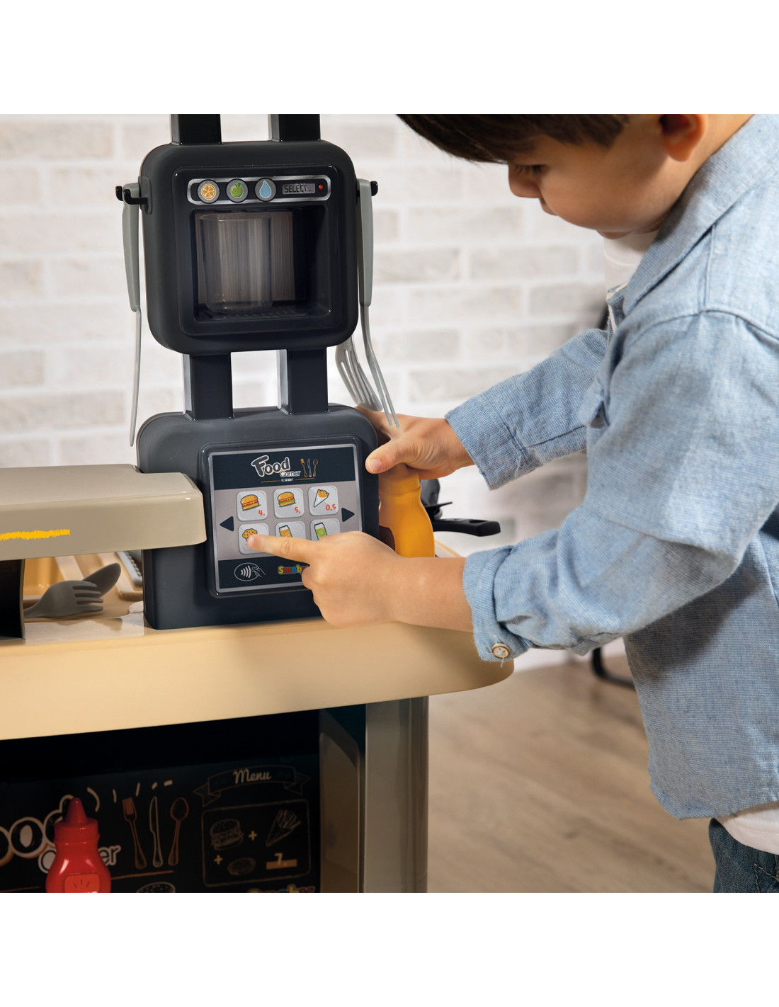 The Chef's Bar is the perfect set for children to play and role-play. It develops their imagination and teaches teamwork. It features two play areas: a food preparation area and a customer service area with a cash register and payment terminal.