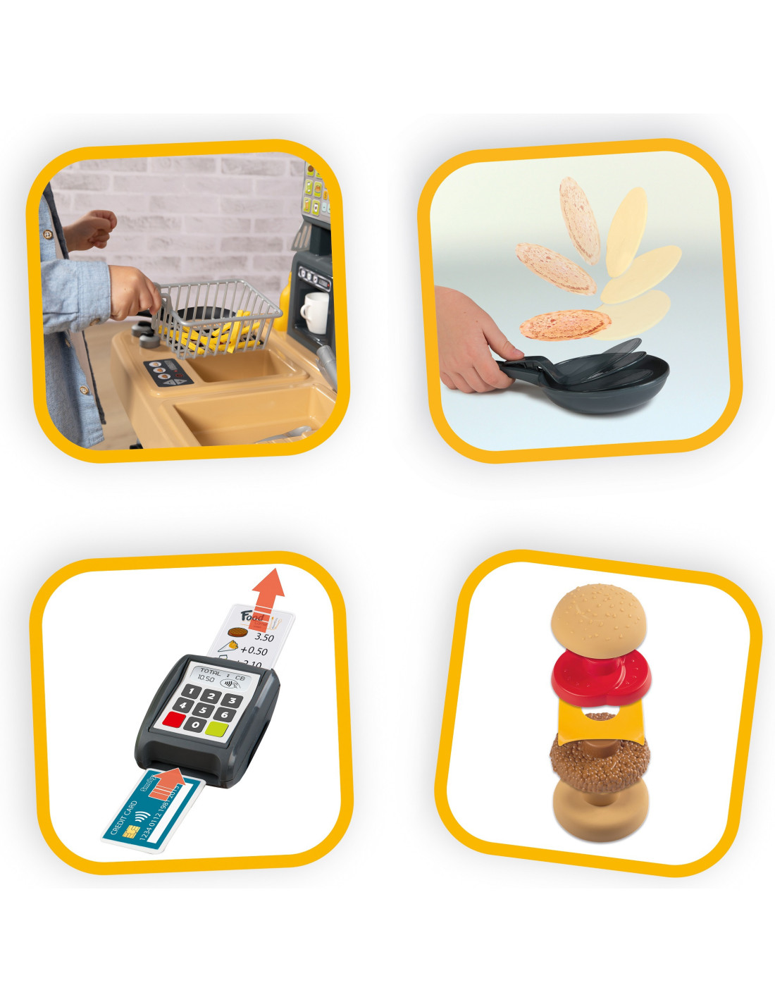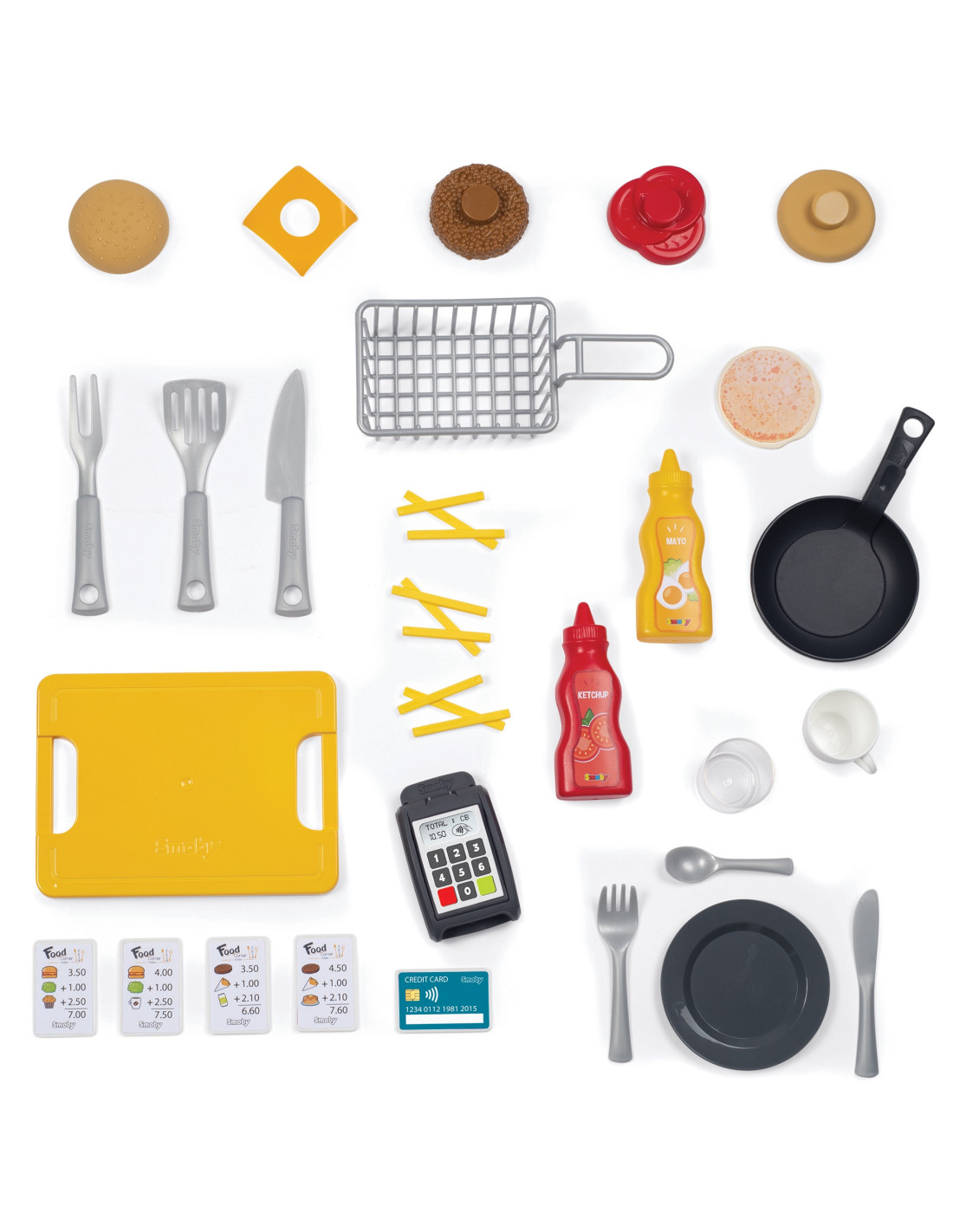 - - the set includes 29 accessories - a frying pan, a cutting board, a plate, cutlery, a glass, a mug, a basket, kitchen utensils, a hamburger, fries, a pancake (changes color when turned over in the pan), sauces, receipts, a credit card.