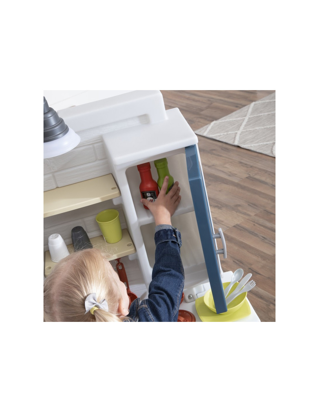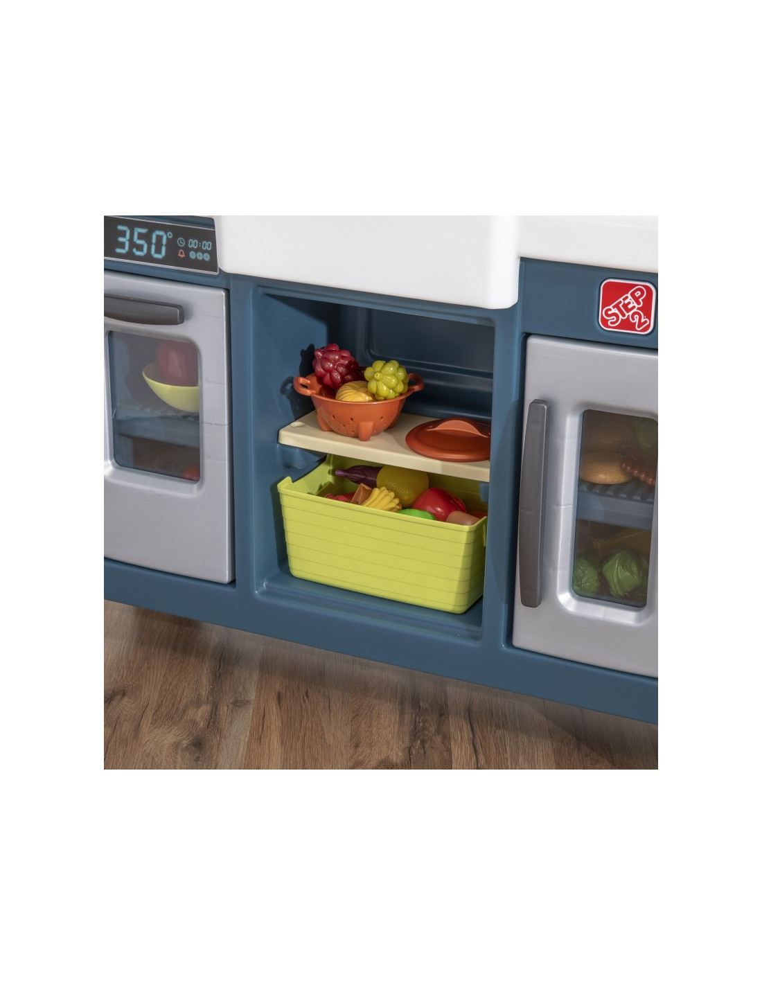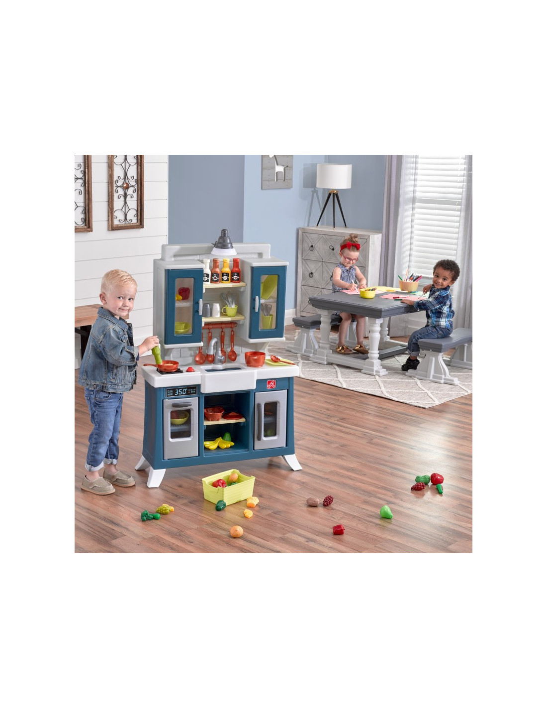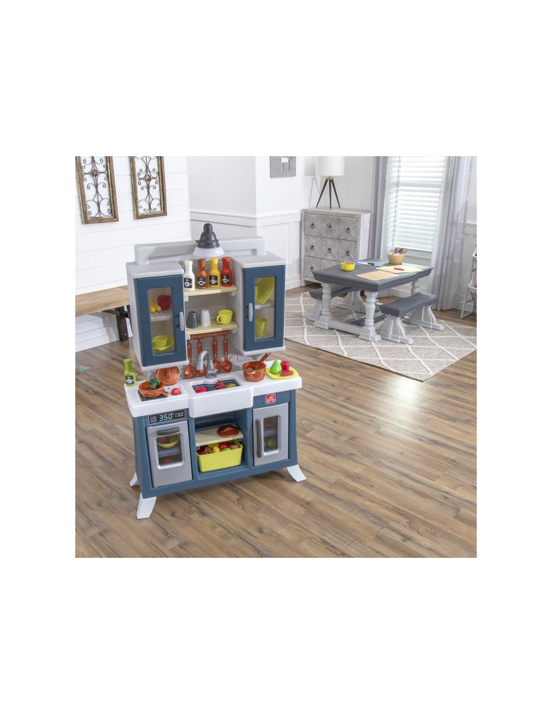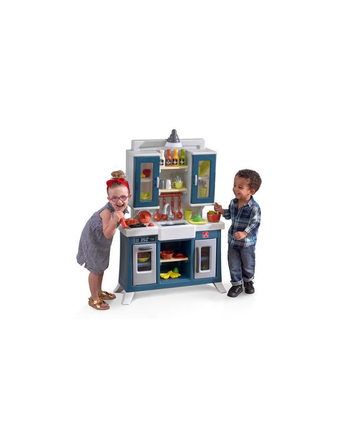 This Step2 children's play kitchen features a realistic farmhouse-chic aesthetic with modern functionality and plenty of storage! Prepare meals on the large faux granite countertop. Reach for the upper cabinets with shelves for cups and plates to set the table. The toy features a farmhouse-style sink with faucet and a realistic "copper" hanging rail for storage. This kitchen is a stylish addition to any play space. The electronic burner features fun lights and realistic sizzling sounds, and a working pendant lamp above the sink brings kitchen play to life. Requires 2 "AA" and 2 "AAA" batteries (not included).