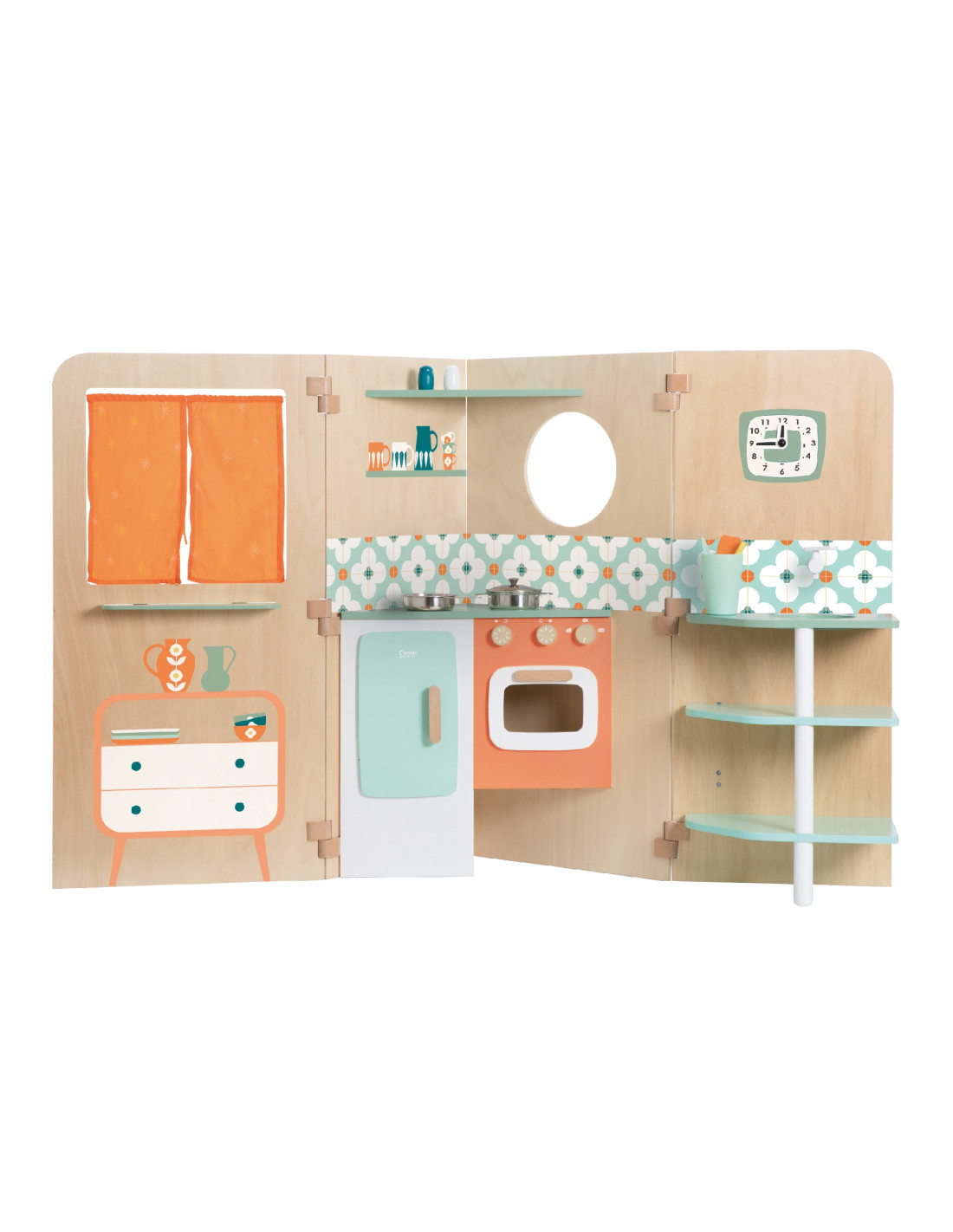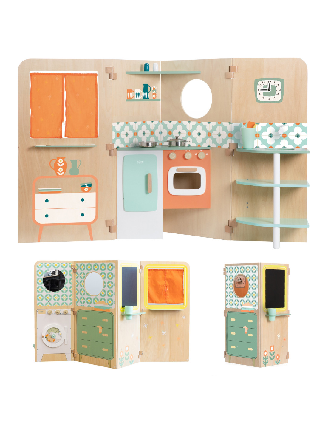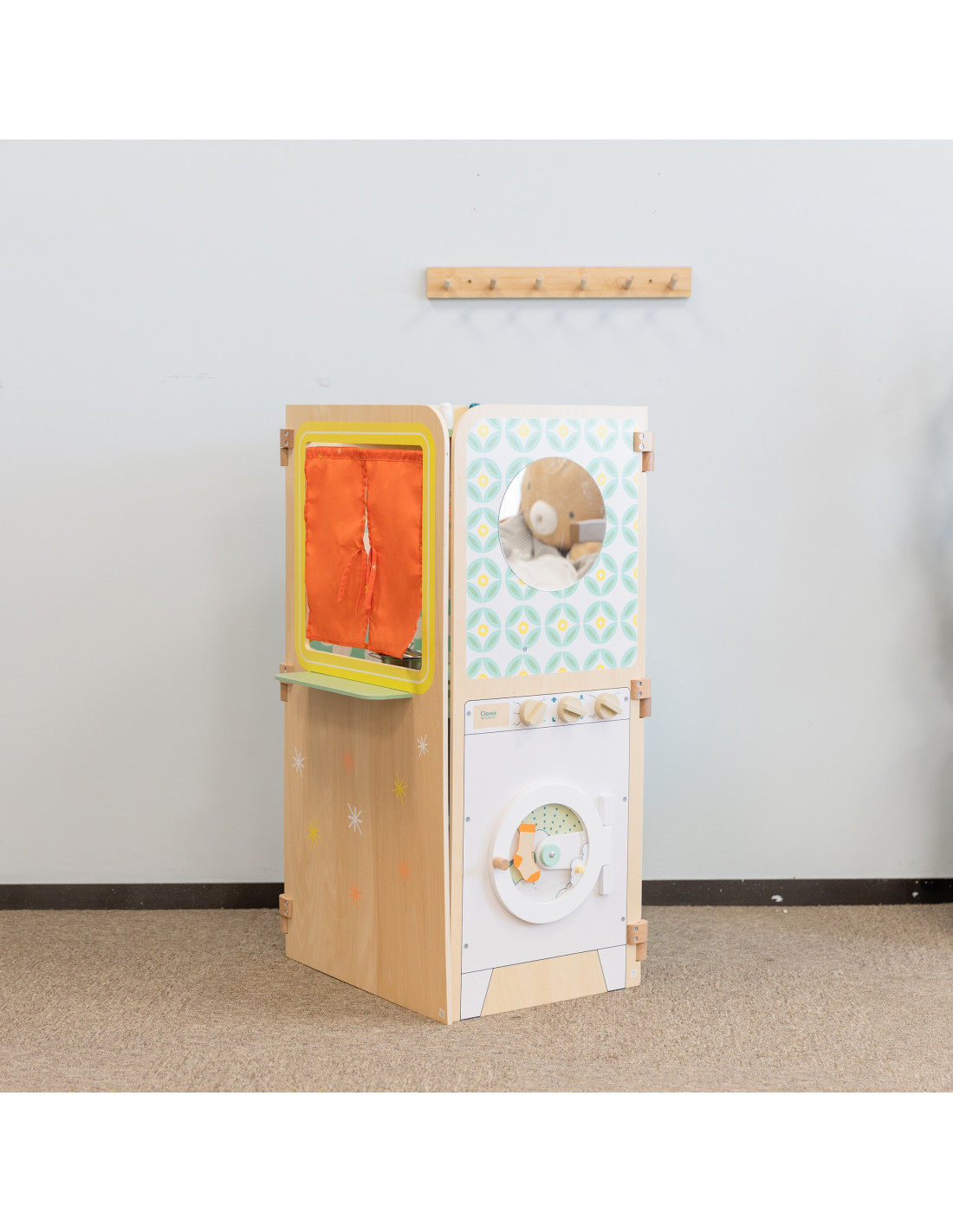 The multifunctional foldable playhouse from CLASSIC WORLD offers endless play possibilities. It reveals various play areas, such as a kitchen , a laundry room with a washing machine , a magnetic board , and a window . It can also be used as a puppet theater . Children can play "outside" and "inside" while looking out the window. The foldable playhouse is very compact and, thanks to its easy opening and folding system, takes up little space.