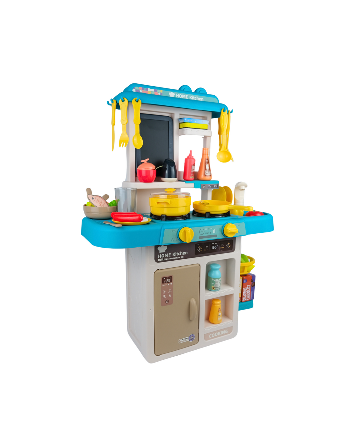 The amazing WOOPIE Children's Kitchen is a fantastic and creative experience for your child. Thanks to its beautifully detailed features , your child will feel like they're actually cooking! Our kitchen features a functional faucet that can dispense real water . Thanks to the closed-loop system, the water flows back into the sink, allowing your child to enjoy washing vegetables, fruit, dishes, and even their little hands. With two burner control knobs, our kitchen comes alive with lights and sounds. The first knob turns on the first burner, flashing with light , while the second knob activates the second burner, accompanied by flashing lights and frying sounds . Additionally, steam escapes from the pot lid, just like real cooking! It's not just a toy – it's an interactive educational tool that positively impacts the development of your child's imagination and stimulates their creativity.