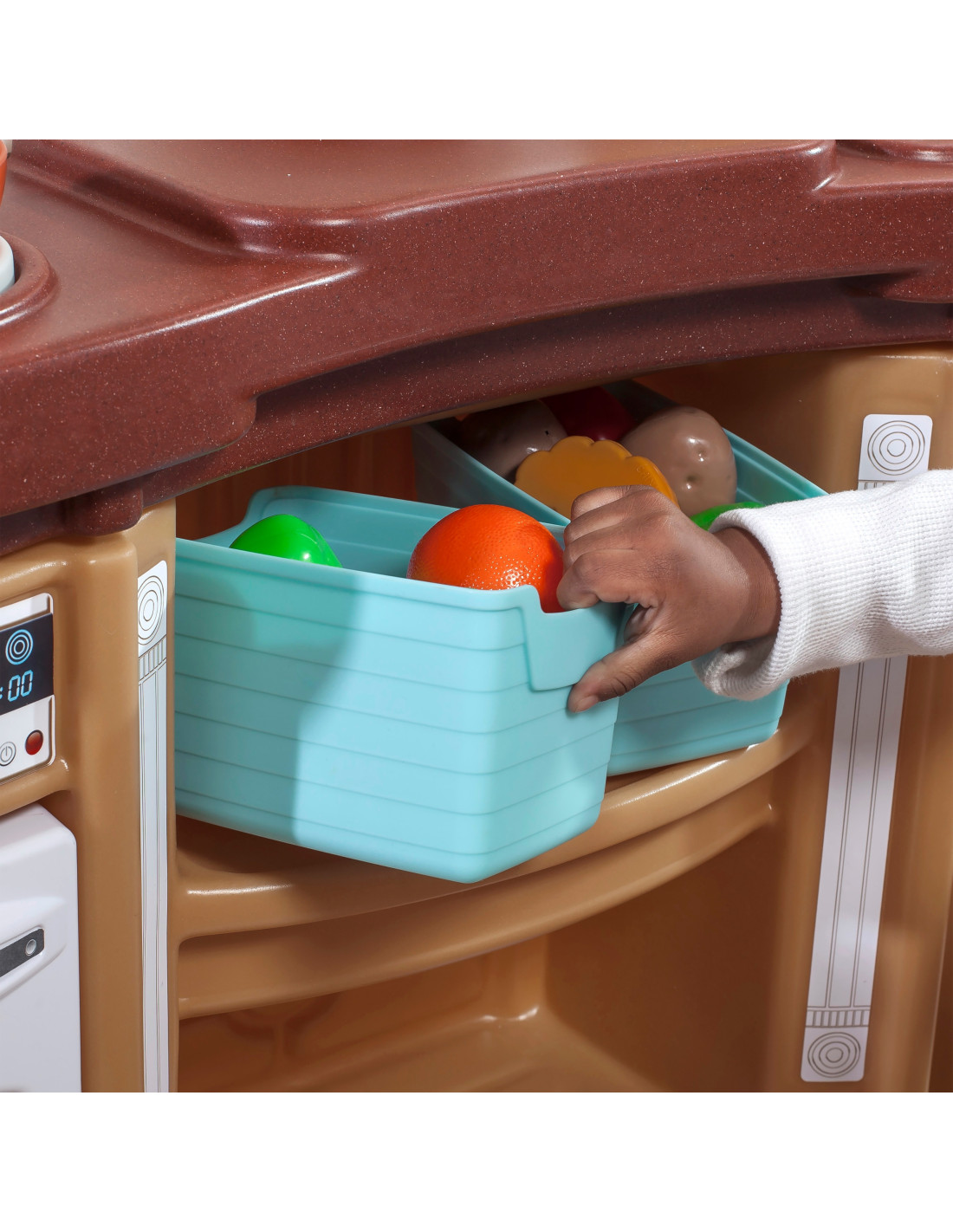 - - Extra storage makes cleanup easier with printed shelves and a bin area, keeping essential kitchen utensils always at hand.