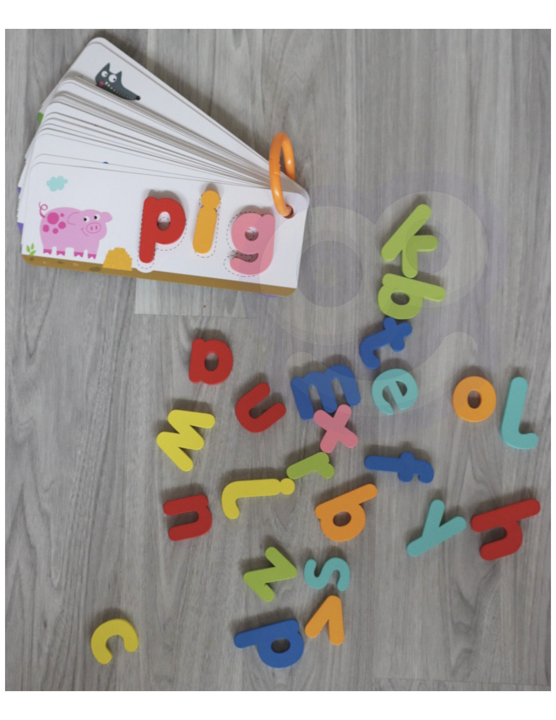 - - the set contains 57 elements : 26 letters/blocks, 30 cards and a ring for assembling the cards,