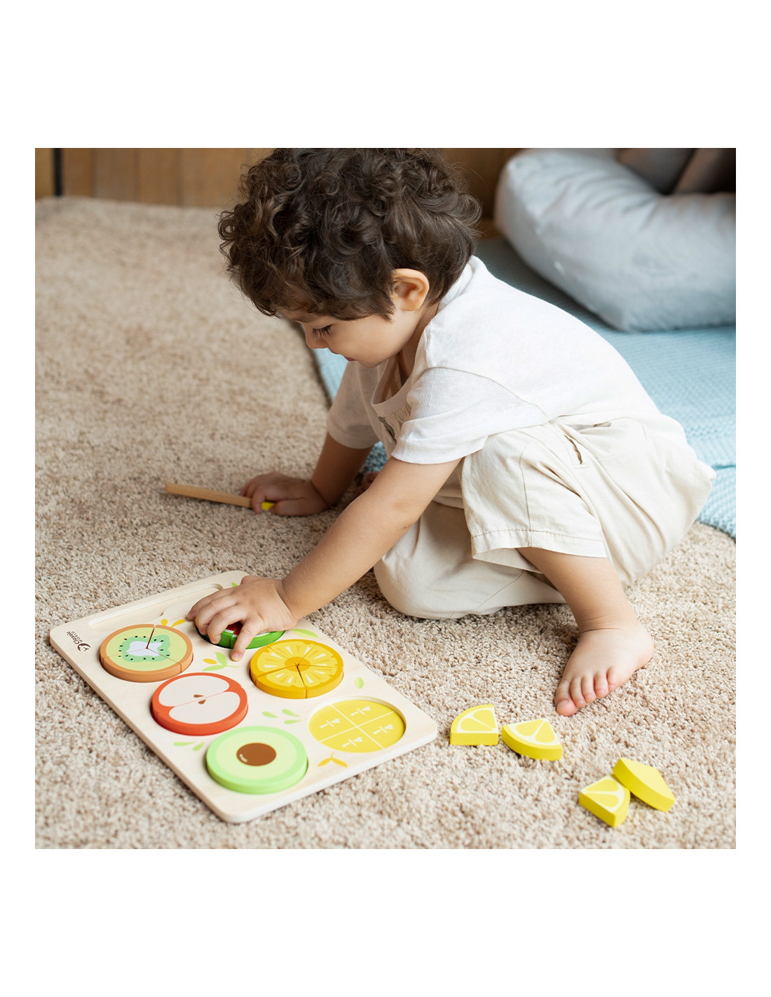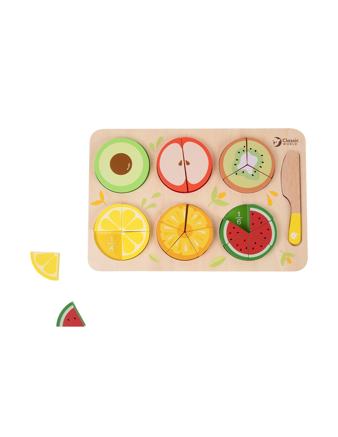 The CLASSIC WORLD fruit chopping set is a great addition to play for little chefs who love playing house or cooking. The set contains 23 pieces. This game allows for role-playing from a young age and serves an educational purpose, including learning fractions and division . This product is a fantastic way to have fun! The beautiful colors and simulated fruit will encourage endless play. Your little one will learn colors and how to distinguish between different fruits . The set is designed with little hands in mind. The absence of sharp edges makes it 100% child-safe.