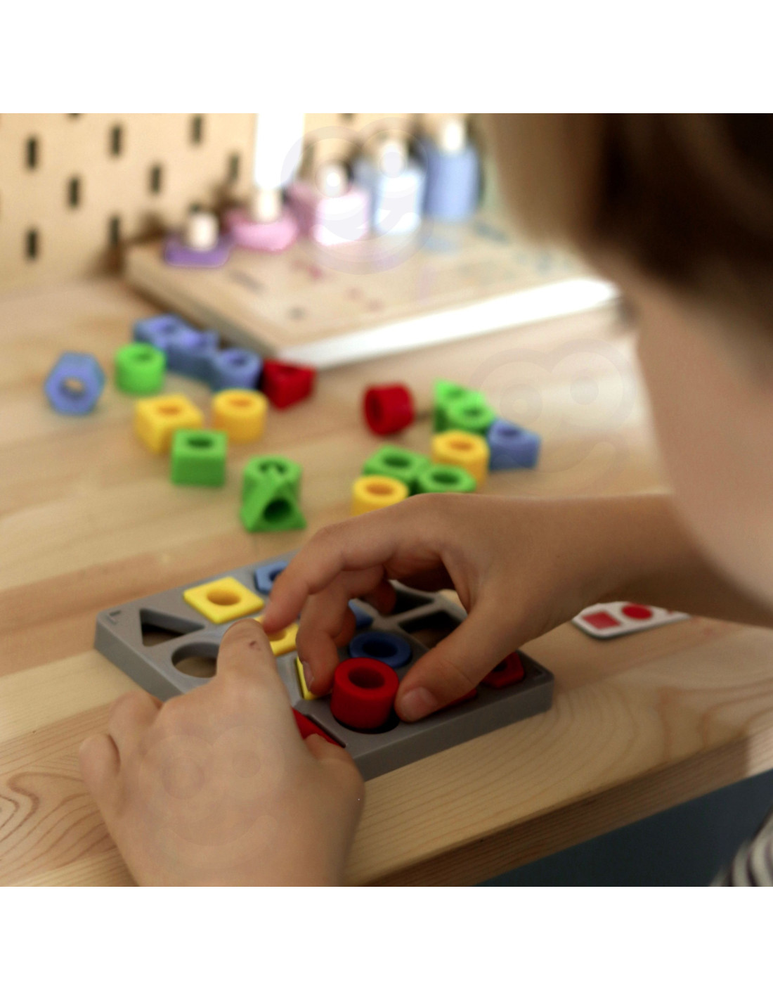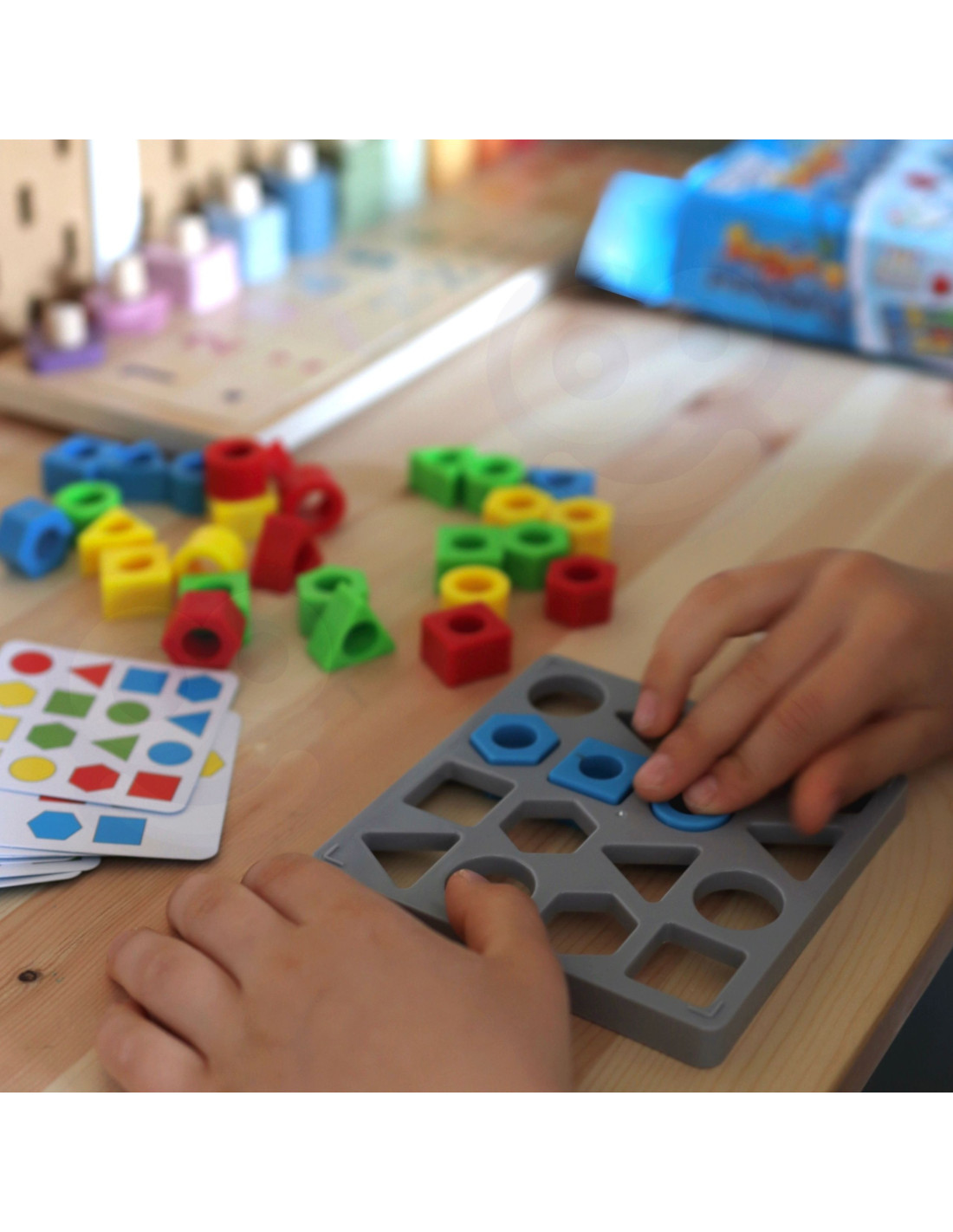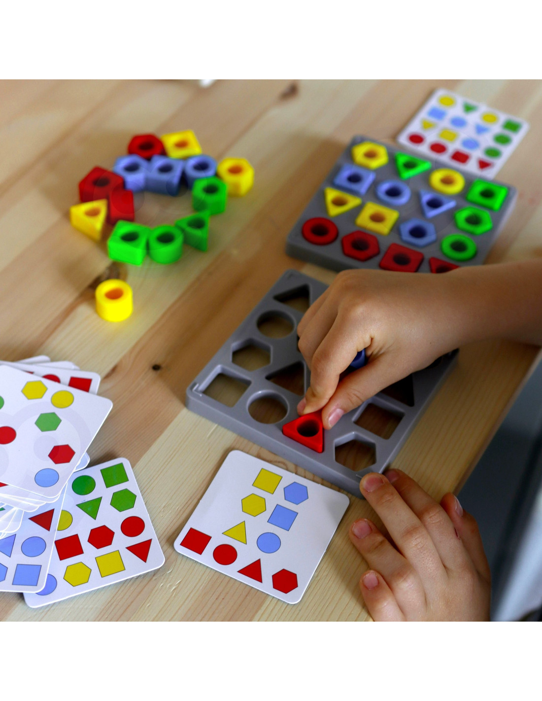The game involves arranging a pattern drawn by the player on a board. Both the arrangement and the colors of the geometric shapes must match.