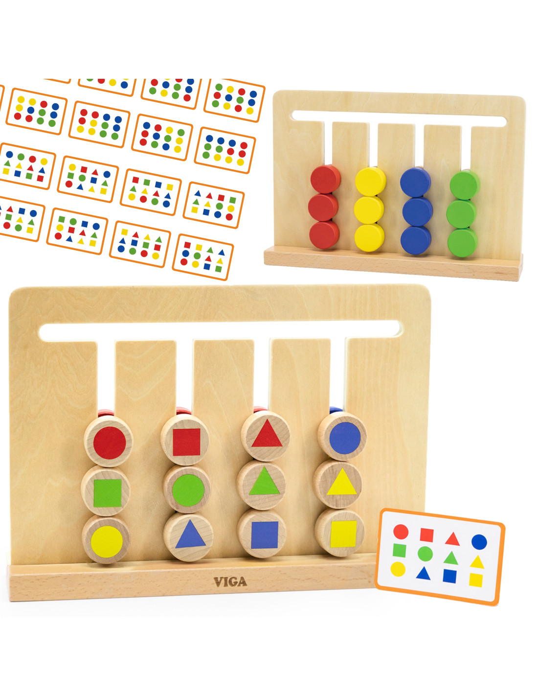 The Color and Shape Puzzle Game from Viga will provide hours of fun! This free-standing game frame features 12 double-sided blocks. Once your child masters the easier side with colored blocks, they can increase the level of difficulty by playing on the other side with colorful geometric shapes . Your child's task is to sort the blocks or copy the pattern on the card, but to do so, they must plan the order of their moves .