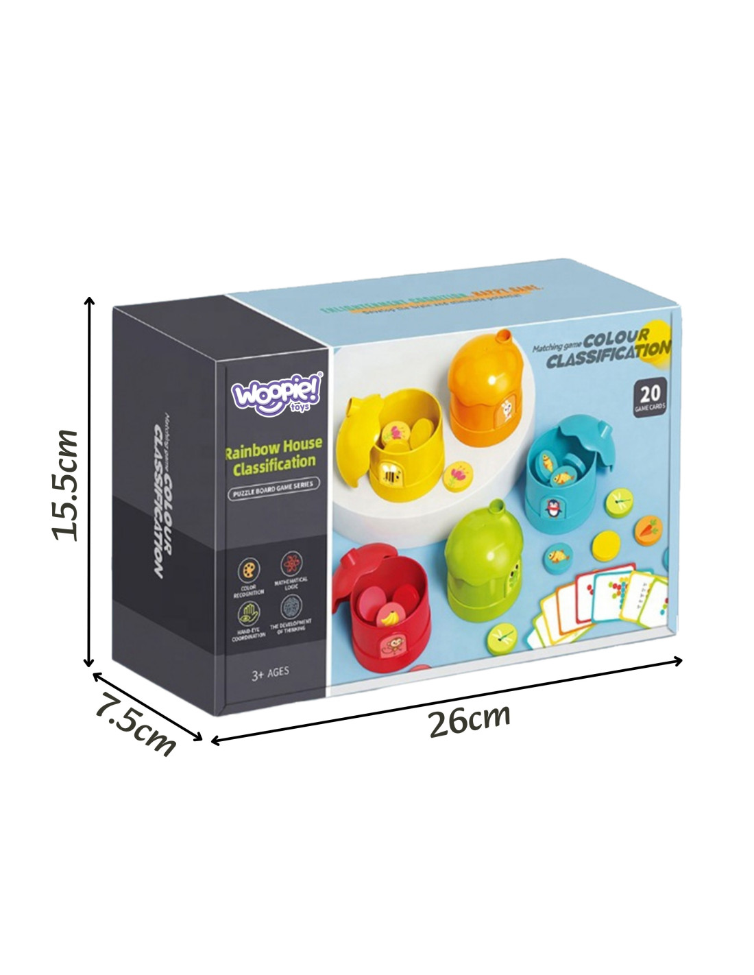 Introduce your child to the world of learning and color recognition with the WOOPIE Feed the Animals Puzzle Sorter Set! This educational matching game is perfect for children aged 3 and up . The set includes five colorful containers – houses for adorable animals and tokens with food stickers – as well as 20 cards with logic puzzles . The main goal is to match the tokens to the correct houses, which develops color recognition, logical thinking, and hand-eye coordination. The houses belong to cute characters like a penguin, a bee, and a monkey , further encouraging play. It's a great way to combine business with pleasure, preparing your little one for math and developing their concentration skills.
