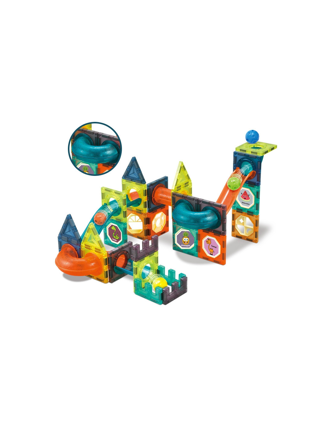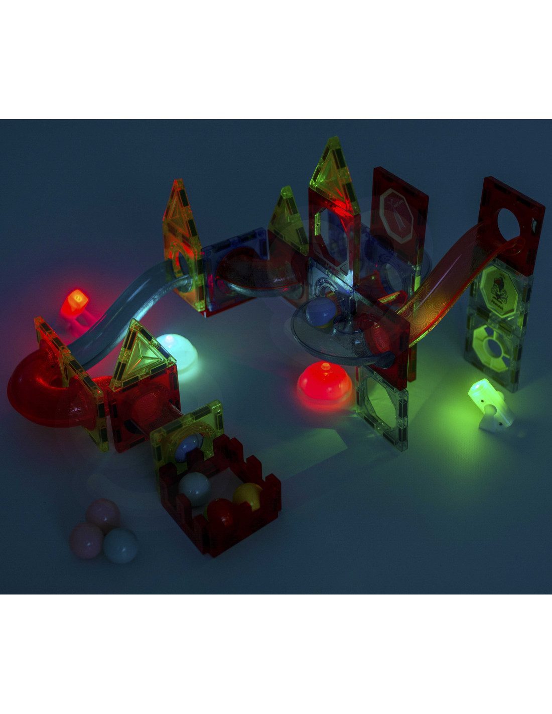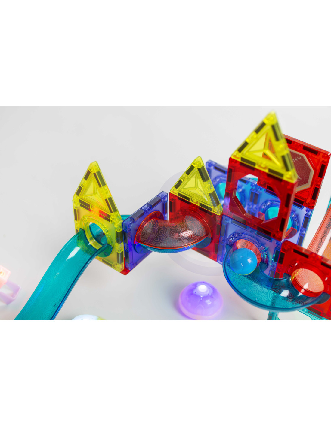 Magnetic blocks from WOOPIE will captivate and fascinate your child. The blocks easily connect and can be used to create wonderful structures with slides, for example, a track for a ball to slide along. The track can be illuminated with the included flashlight for an even more impressive effect, and the child can then observe how the light moves, which develops their perception . Simply arranging the track so that the balls easily reach the end will develop their logical thinking , imagination , and creativity , and will help them concentrate while building structures. By arranging the blocks, the child learns shapes and colors and develops fine motor skills.