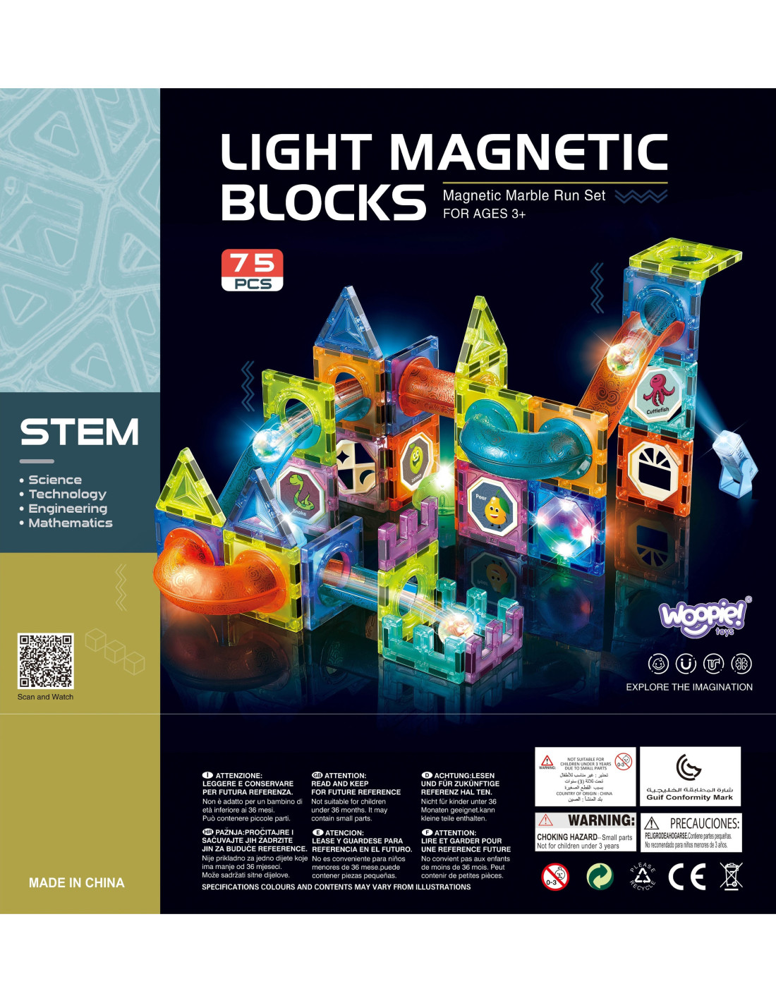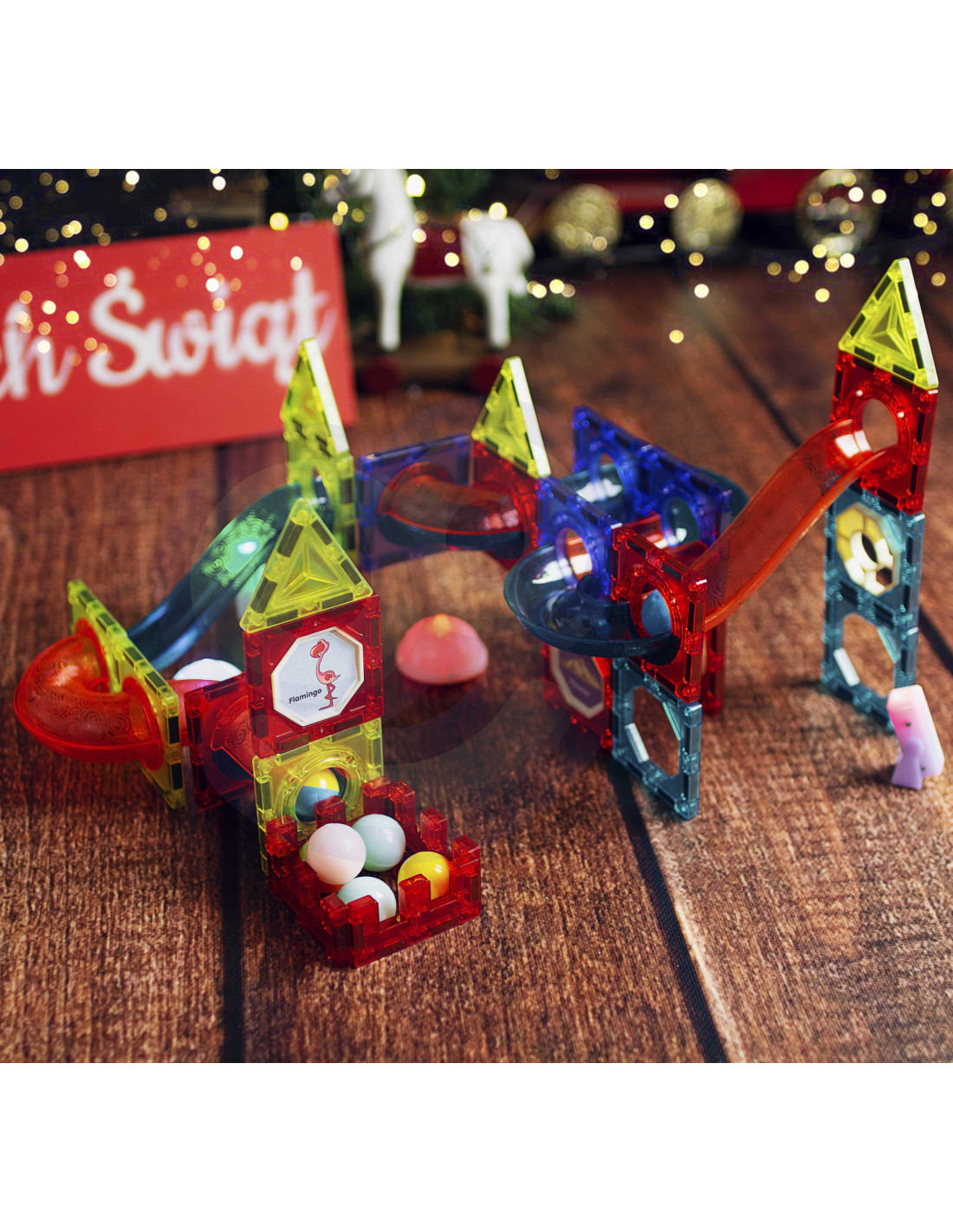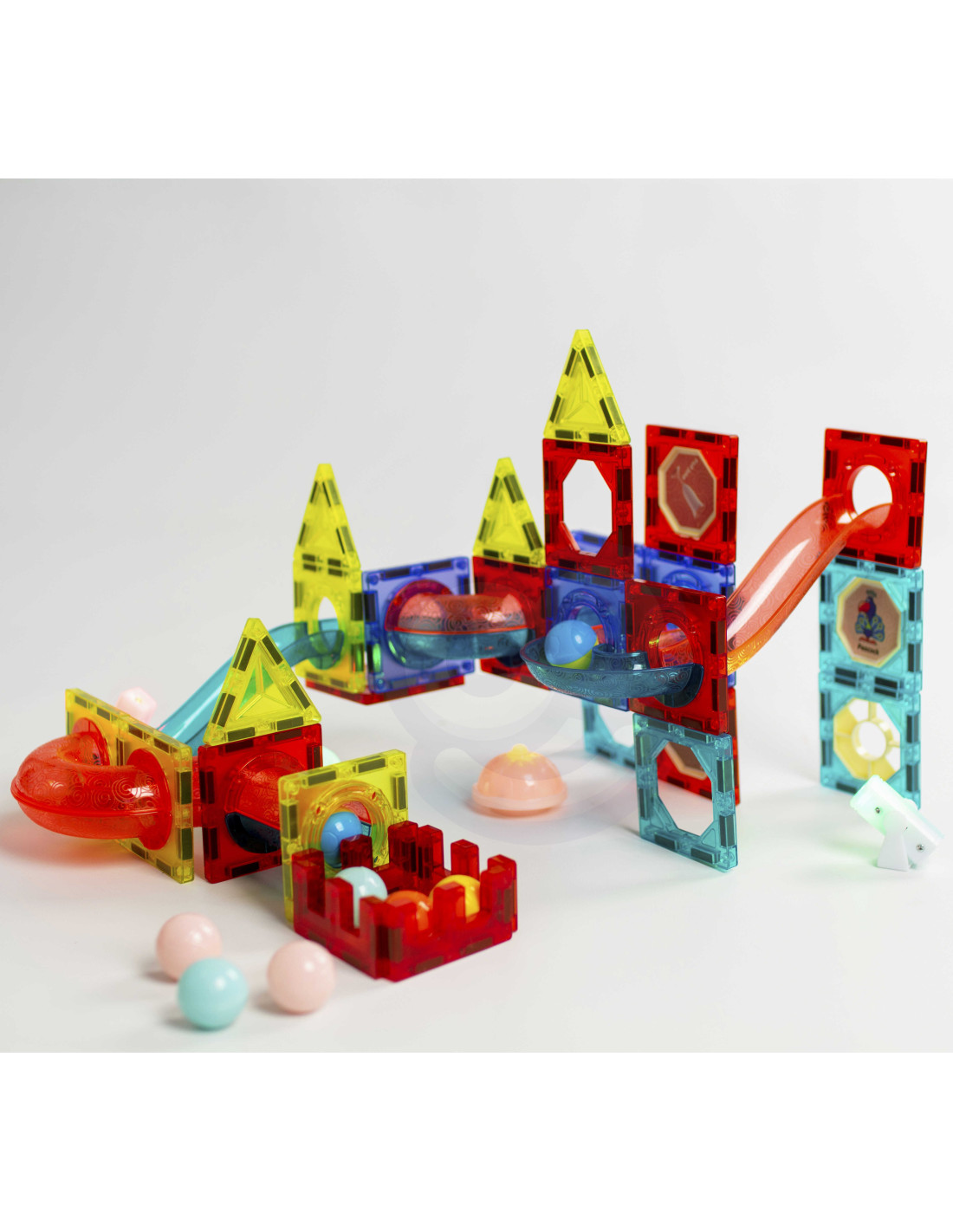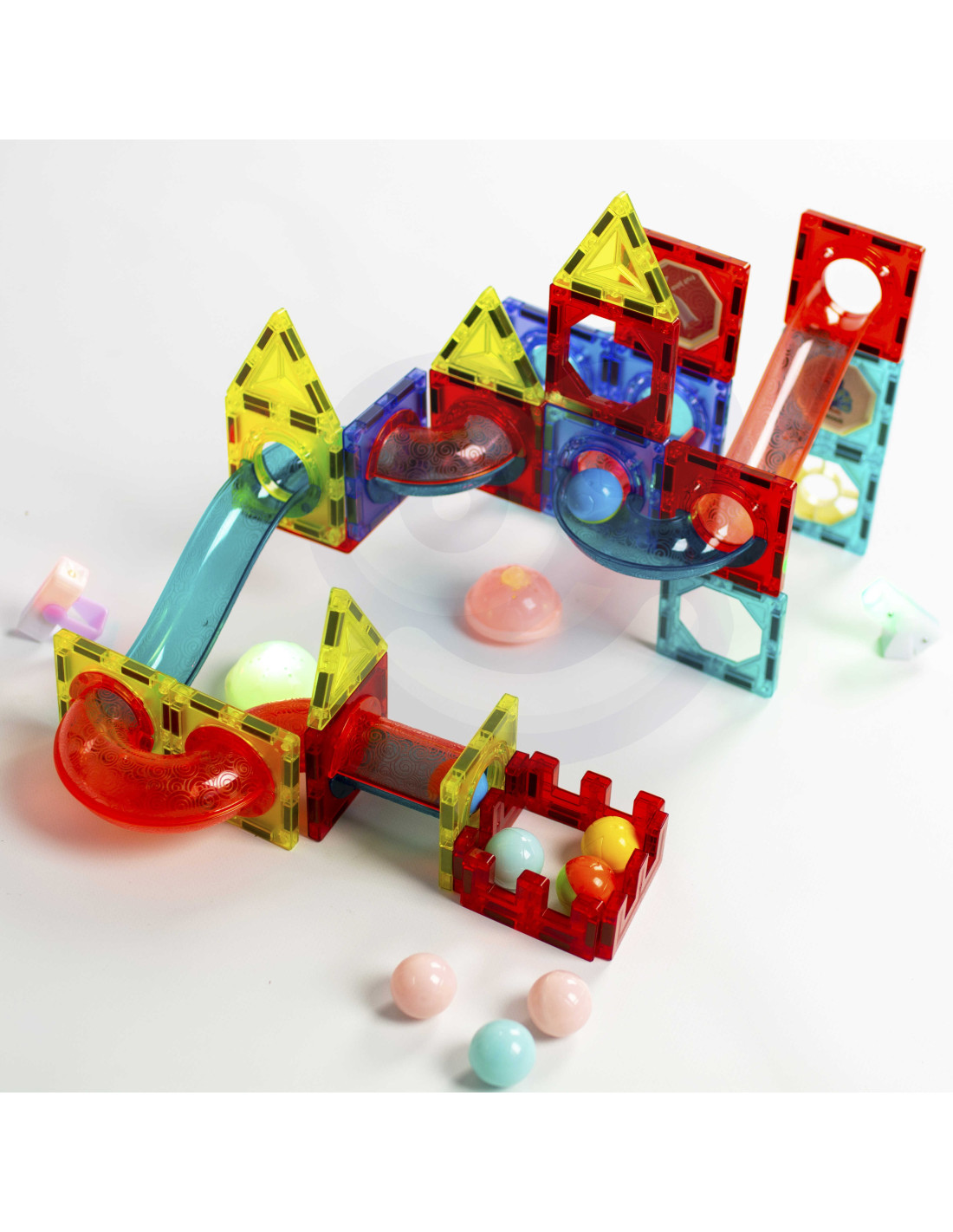 Magnetic blocks from WOOPIE will captivate and fascinate your child. The blocks easily connect and can be used to create wonderful structures with slides, for example, a track for a ball to slide along. The track can be illuminated with the included flashlight for an even more impressive effect, and the child can then observe how the light moves, which develops their perception . Simply arranging the track so that the balls easily reach the end will develop their logical thinking , imagination , and creativity , and will help them concentrate while building structures. By arranging the blocks, the child learns shapes and colors and develops fine motor skills.