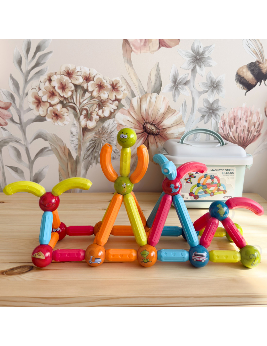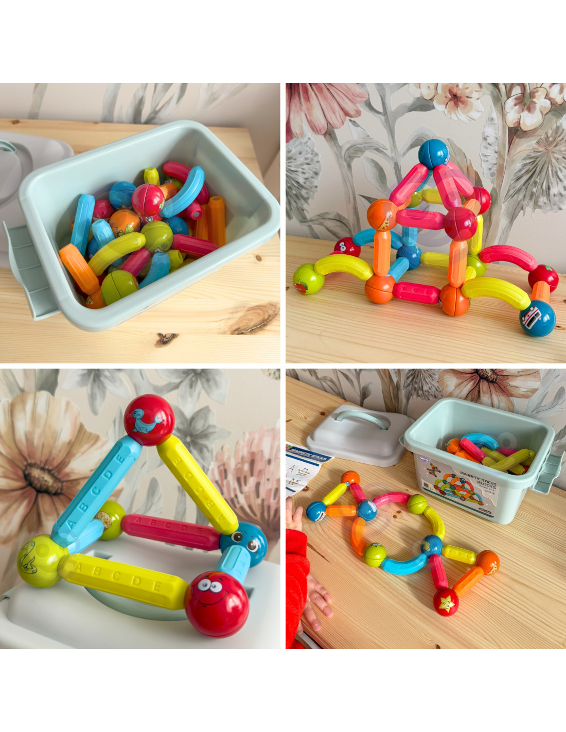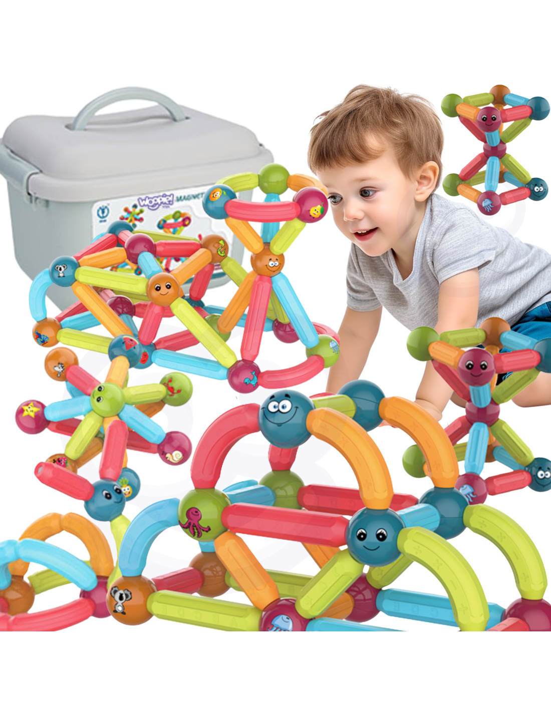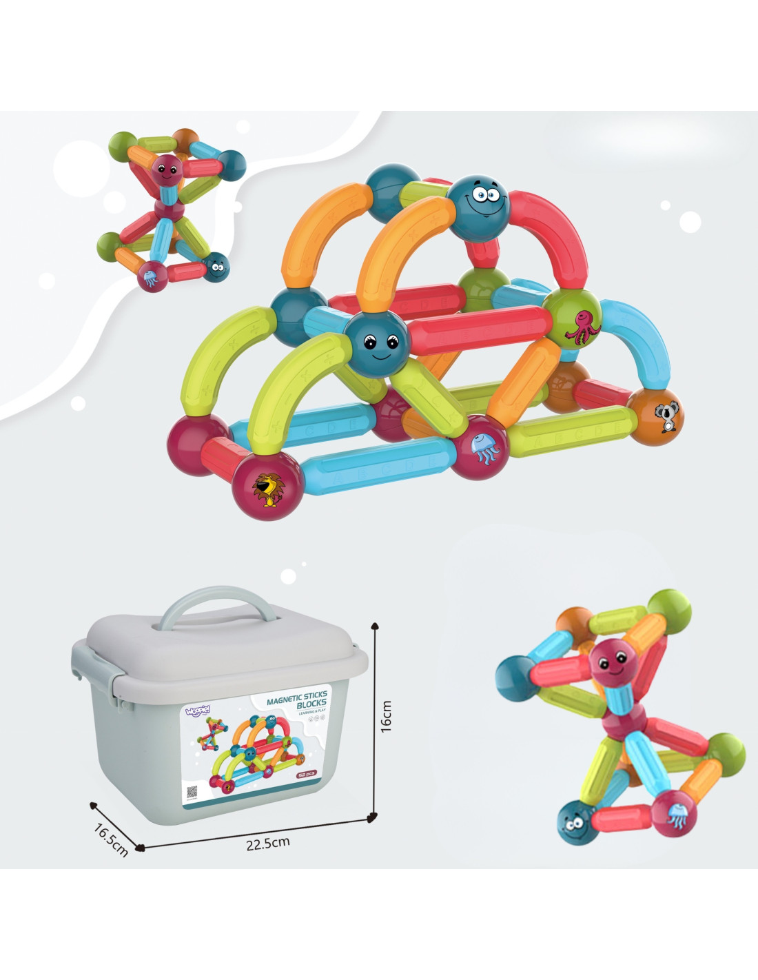 This set of thick magnetic blocks from WOOPIE combines fun and learning ! Just connect the pieces and start creating elaborate structures and many other arrangements, such as geometric shapes or a mini house! The only limit is your imagination . The set includes 52 pieces and a pattern card. The blocks are thick , colorful , and safe —perfect for little hands. The blocks' educational functions include learning the alphabet, counting, and shapes . The balls feature animals and smiles, among other things. Everything is packaged in a convenient box. Building structures with blocks develops children's creativity , manual skills ("fine motor skills"), spatial imagination , and concentration .