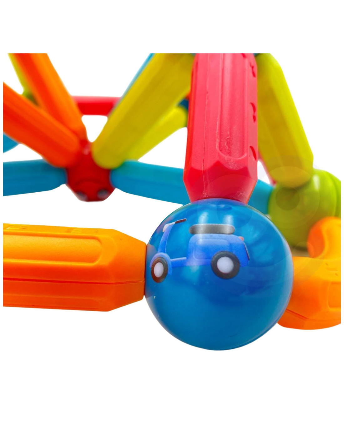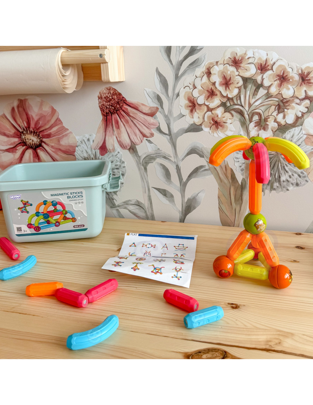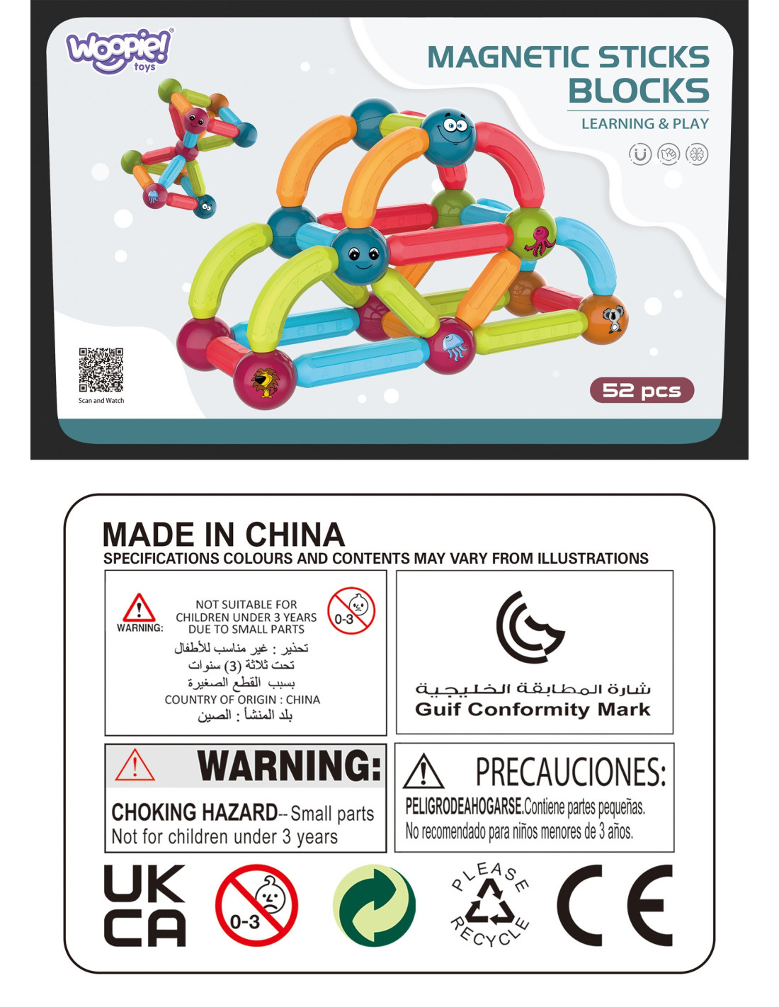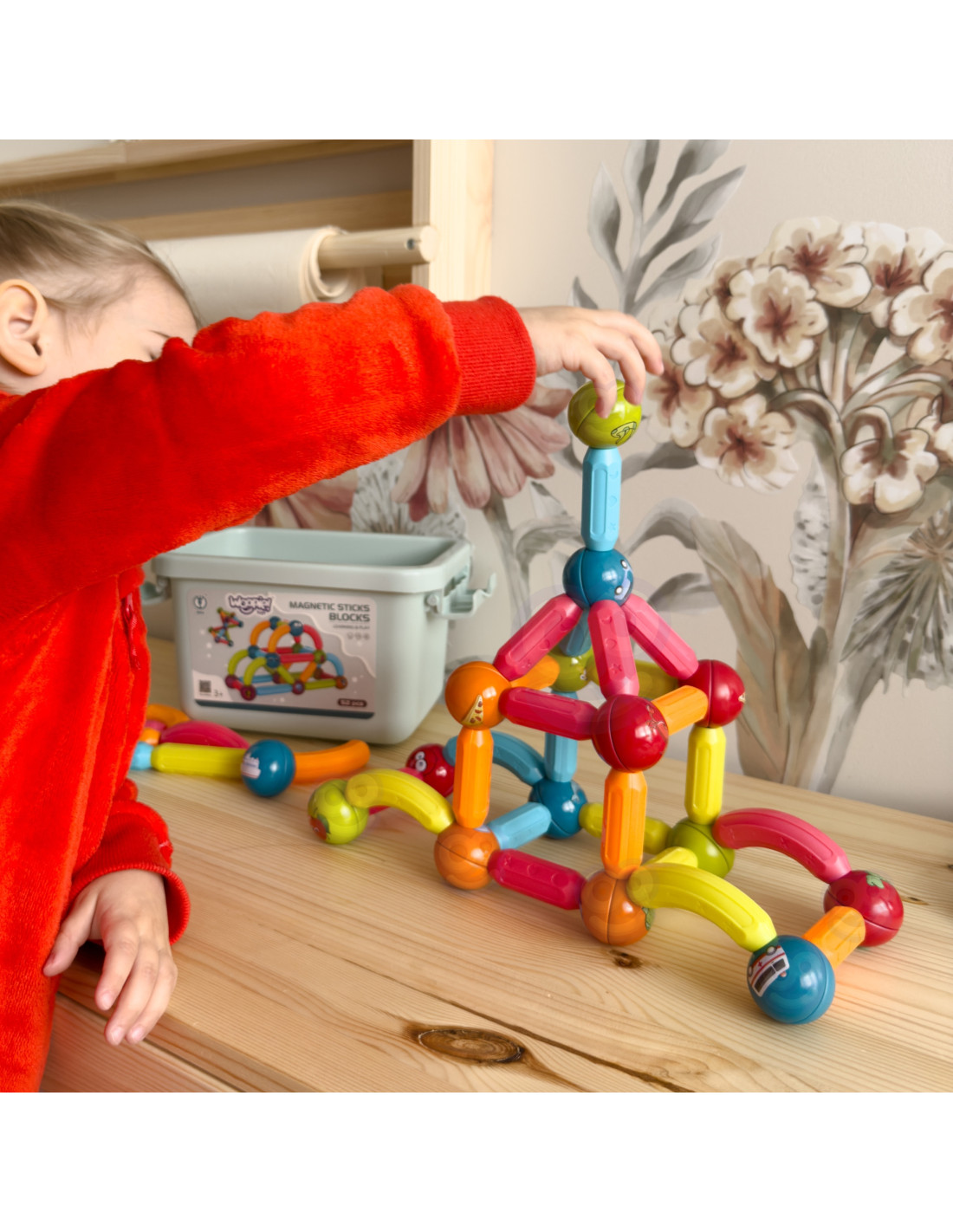 This set of thick magnetic blocks from WOOPIE combines fun and learning ! Just connect the pieces and start creating elaborate structures and many other arrangements, such as geometric shapes or a mini house! The only limit is your imagination . The set includes 52 pieces and a pattern card. The blocks are thick , colorful , and safe —perfect for little hands. The blocks' educational functions include learning the alphabet, counting, and shapes . The balls feature animals and smiles, among other things. Everything is packaged in a convenient box. Building structures with blocks develops children's creativity , manual skills ("fine motor skills"), spatial imagination , and concentration .