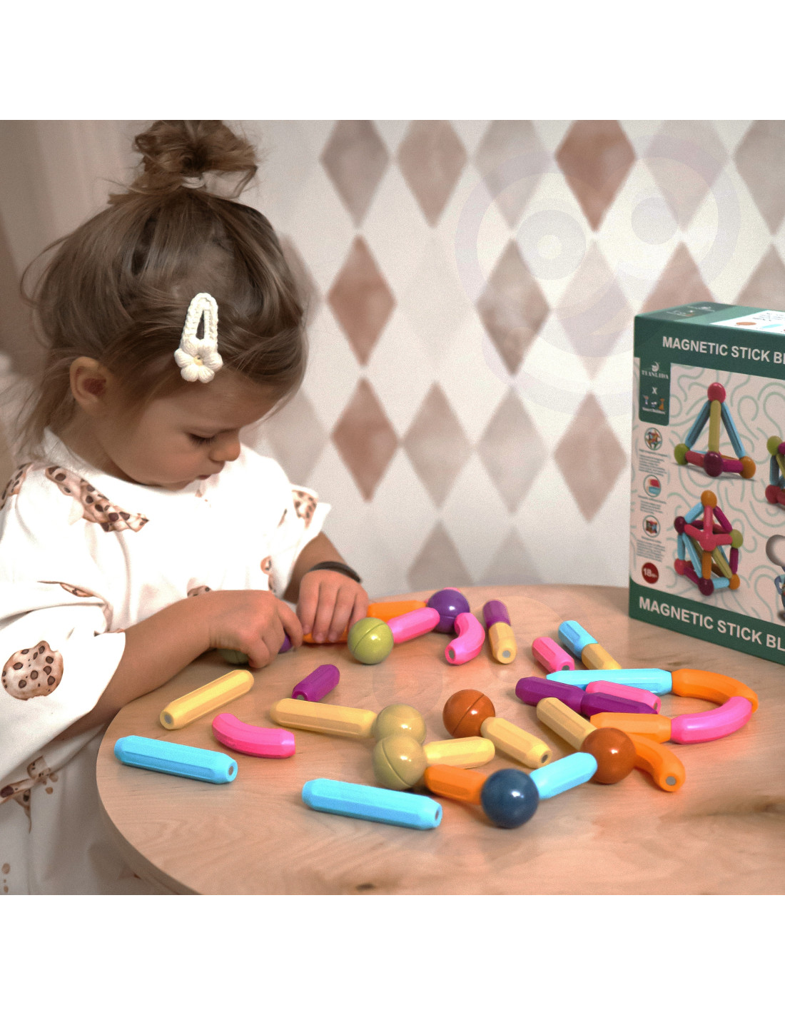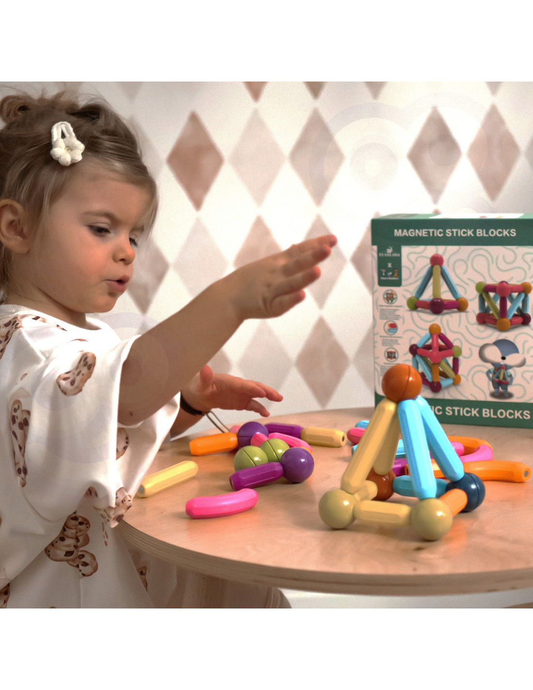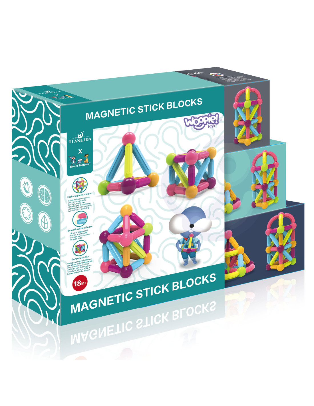 This set of thick magnetic blocks from WOOPIE combines fun and learning ! Just connect the pieces and start creating inventive structures and many other arrangements, such as geometric shapes or a mini house! The only limit is your imagination . The set includes 28 pieces and a booklet with instructions and sample designs . The blocks are thick, colorful, and safe – perfect for small children's hands . Everything is packed in a convenient box. Building structures with blocks develops children's creativity , fine motor skills, spatial imagination , and concentration .