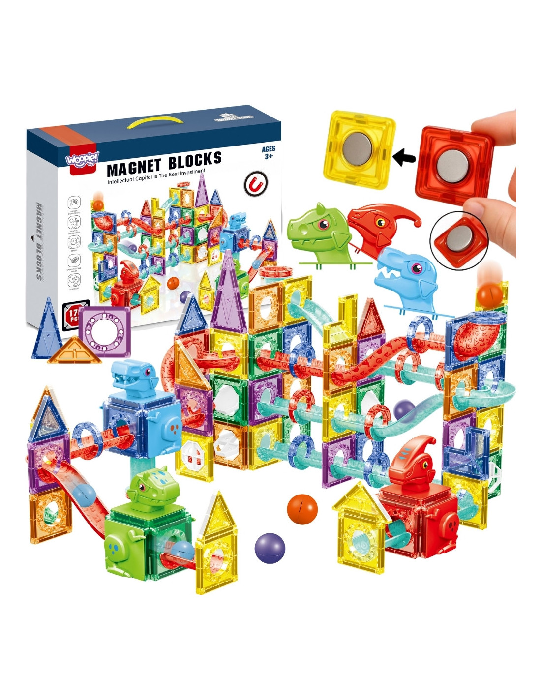 Discover a true paradise of creativity and engineering with the Woopie 3D magnetic building block set! This impressive 170-piece set allows you to build an elaborate, multi-level marble run and fantastic 3D structures. Transparent, magnetic tiles and a variety of brightly colored track pieces guarantee hours of engaging play, while children learn the basics of physics and gravity through hands-on learning. It's the perfect way to develop logical thinking, spatial imagination, and manual dexterity. This set is a gateway to a world of limitless construction possibilities!