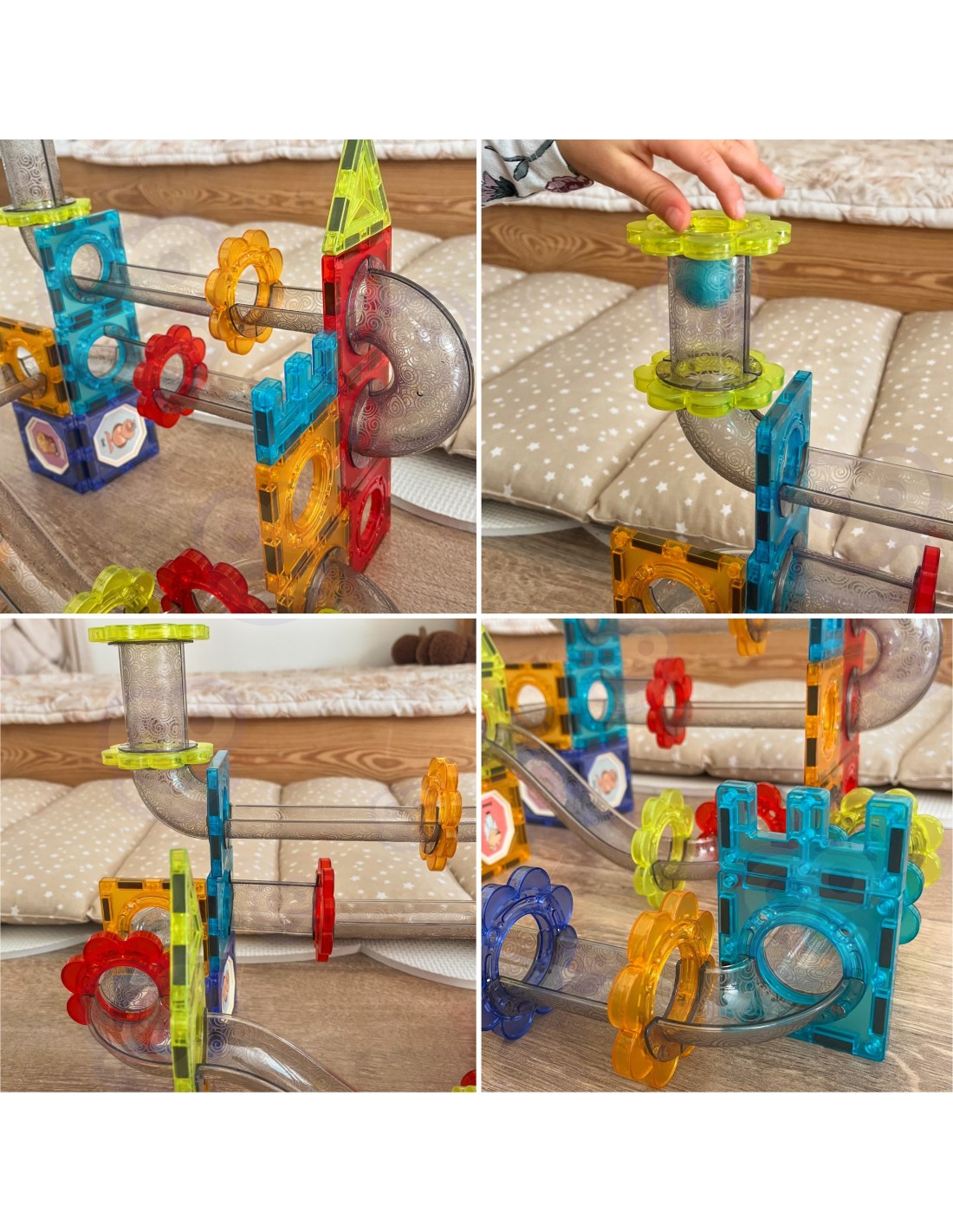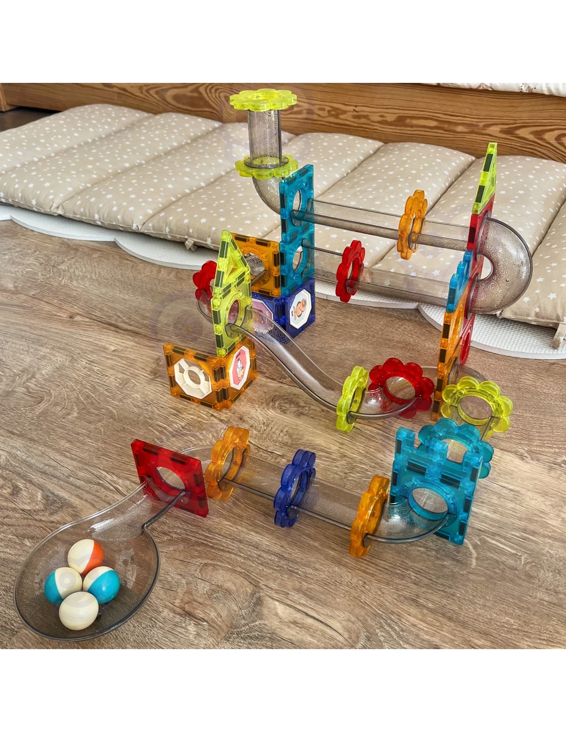 Discover a true paradise of creativity and engineering with the Woopie 3D magnetic building block set! This impressive 113-piece set allows you to build an extensive, multi-level marble run and fantastic 3D structures. Transparent, magnetic tiles and a variety of track elements in vibrant colors guarantee hours of engaging play . While building, children learn the basics of physics and the principles of gravity through hands-on play. It's an ideal way to develop logical thinking , spatial imagination , and manual dexterity . This set is a true gateway to a world of limitless construction possibilities!