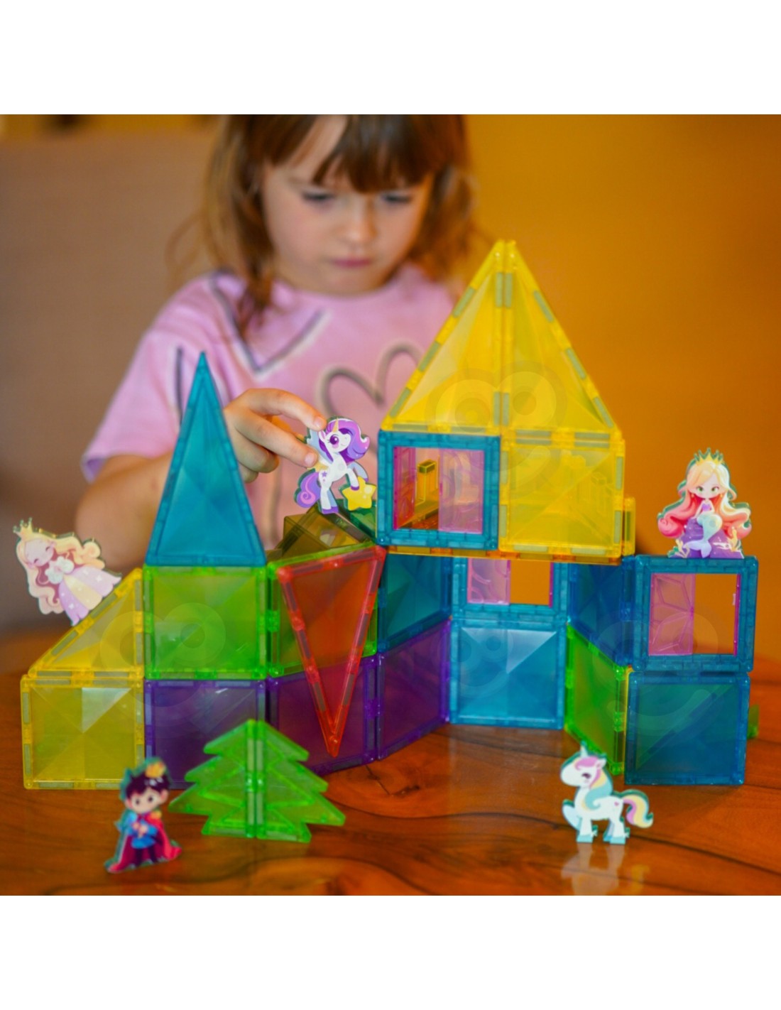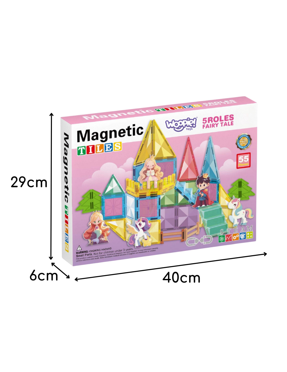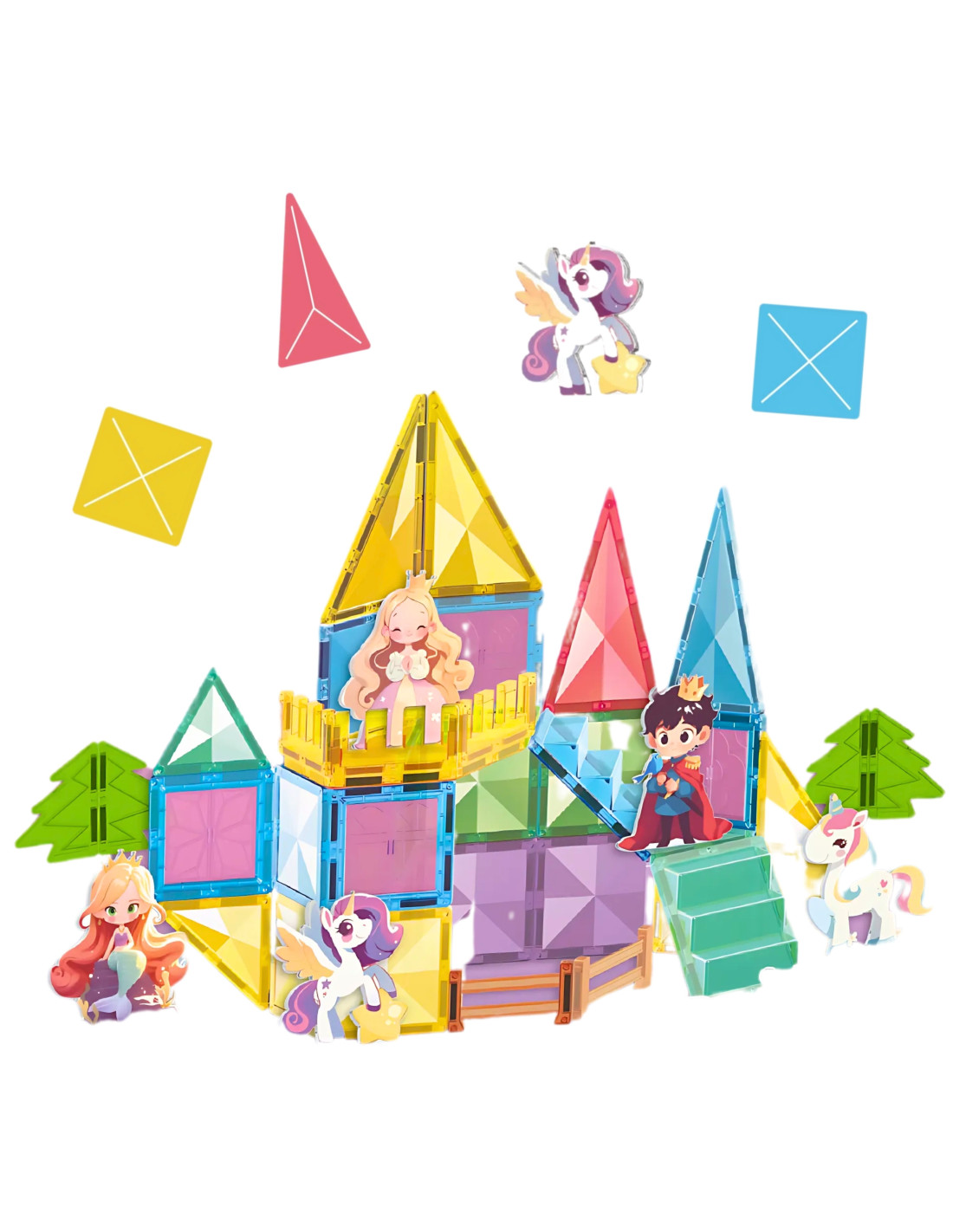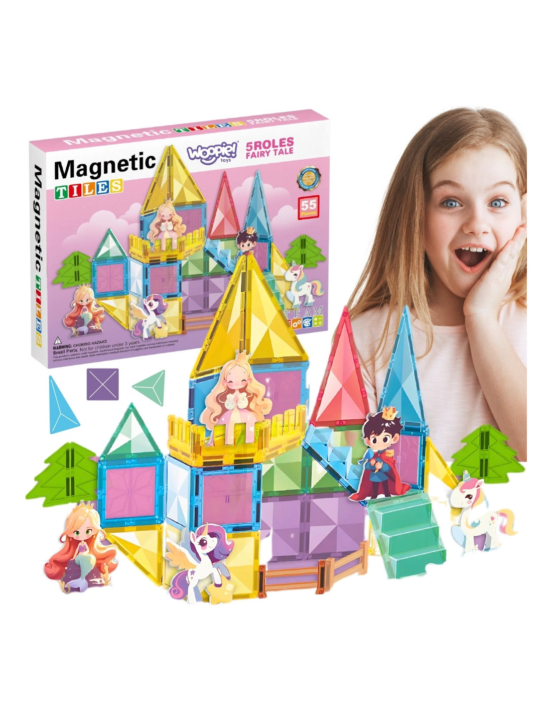 This unique magnetic building set from Woopie will transport your child to a world of creative play and fairy tales! With 55 colorful pieces , including magnetic tiles, stairs, and fences, and adorable figurines, your child can create a magical castle for a princess, prince, and unicorn. Building with magnetic blocks develops manual skills , imagination, and spatial reasoning , while playing with the figurines encourages role-playing.