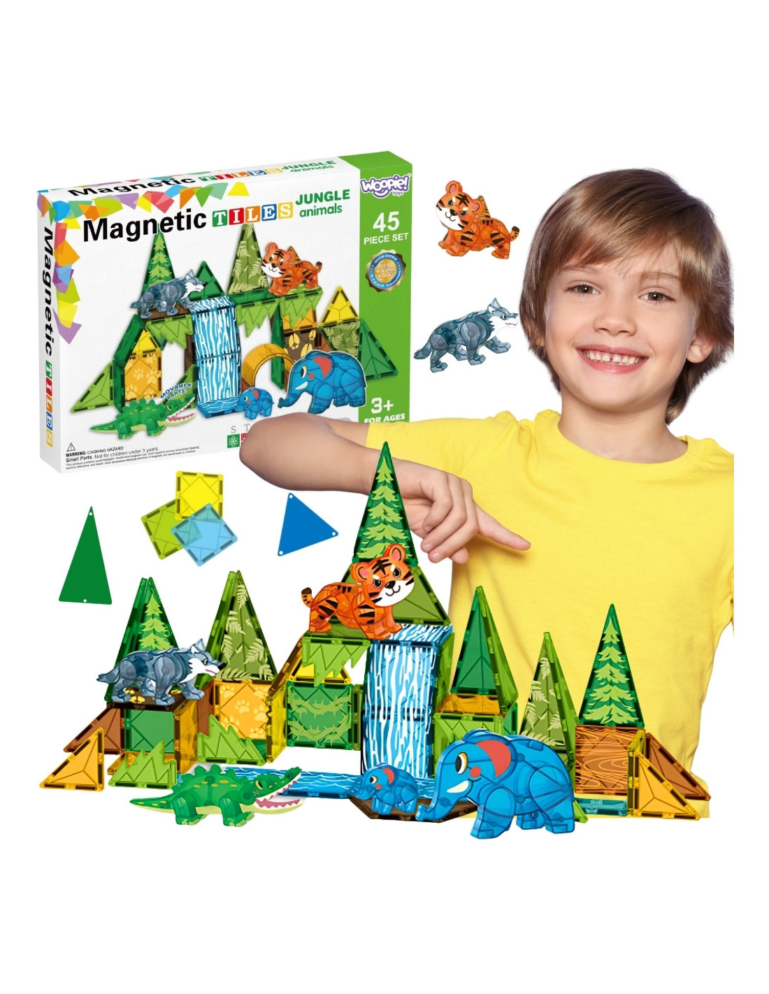 Discover the fascinating world of wildlife with Woopie 's jungle-themed magnetic building blocks . This 45-piece set lets you create amazing structures like waterfalls and caves , populating them with animal figures. The blocks connect easily thanks to strong magnets , and moving parts like the waterfall add to the fun. It's the perfect product for developing imagination and building skills.