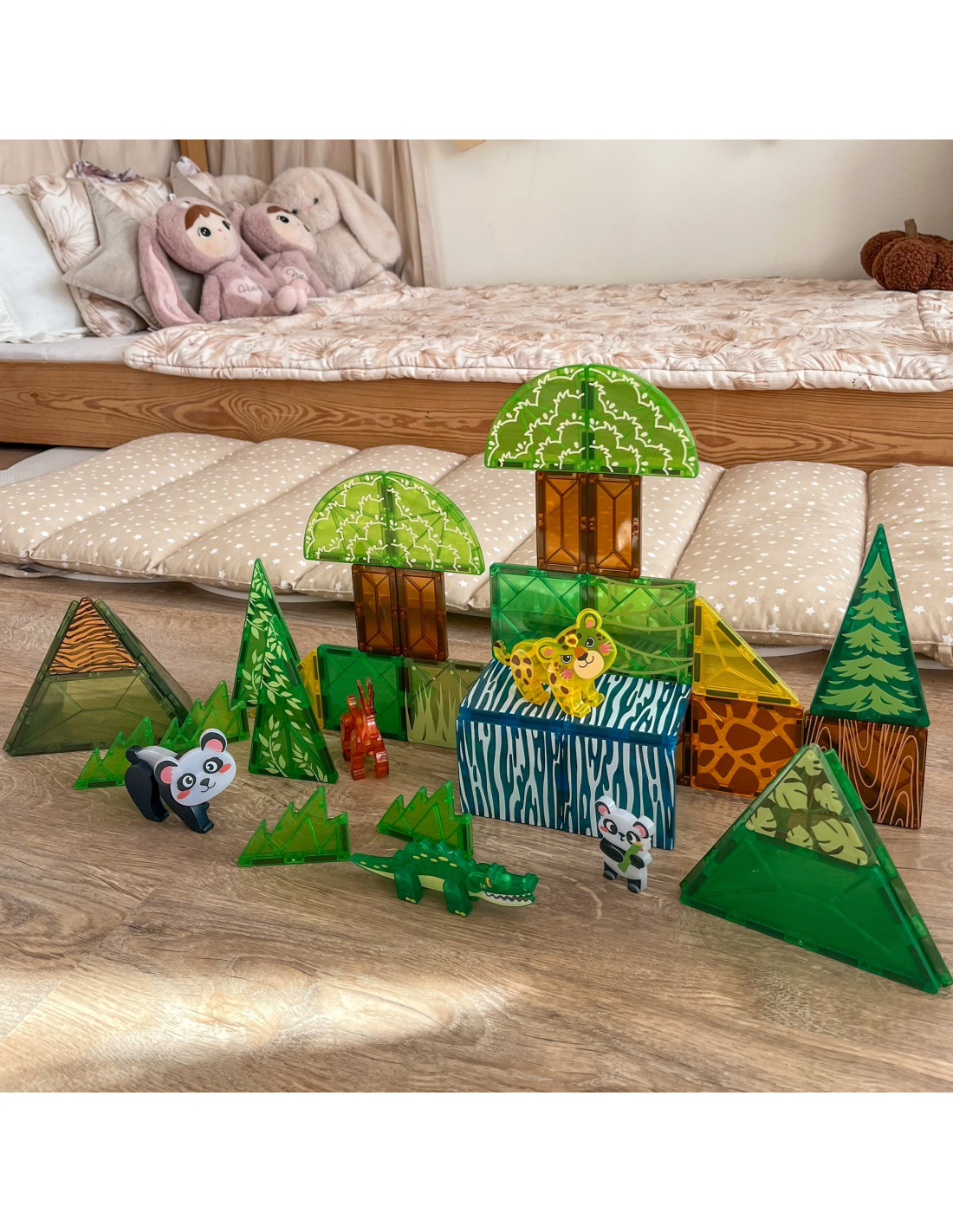 - - The set includes 45 pieces , including magnetic tiles and animal figures.