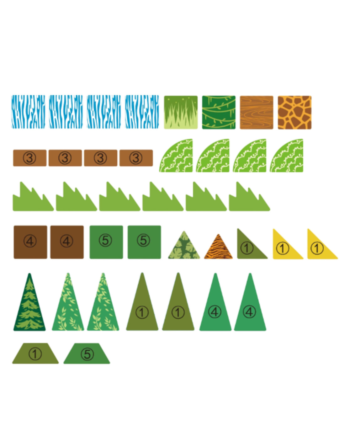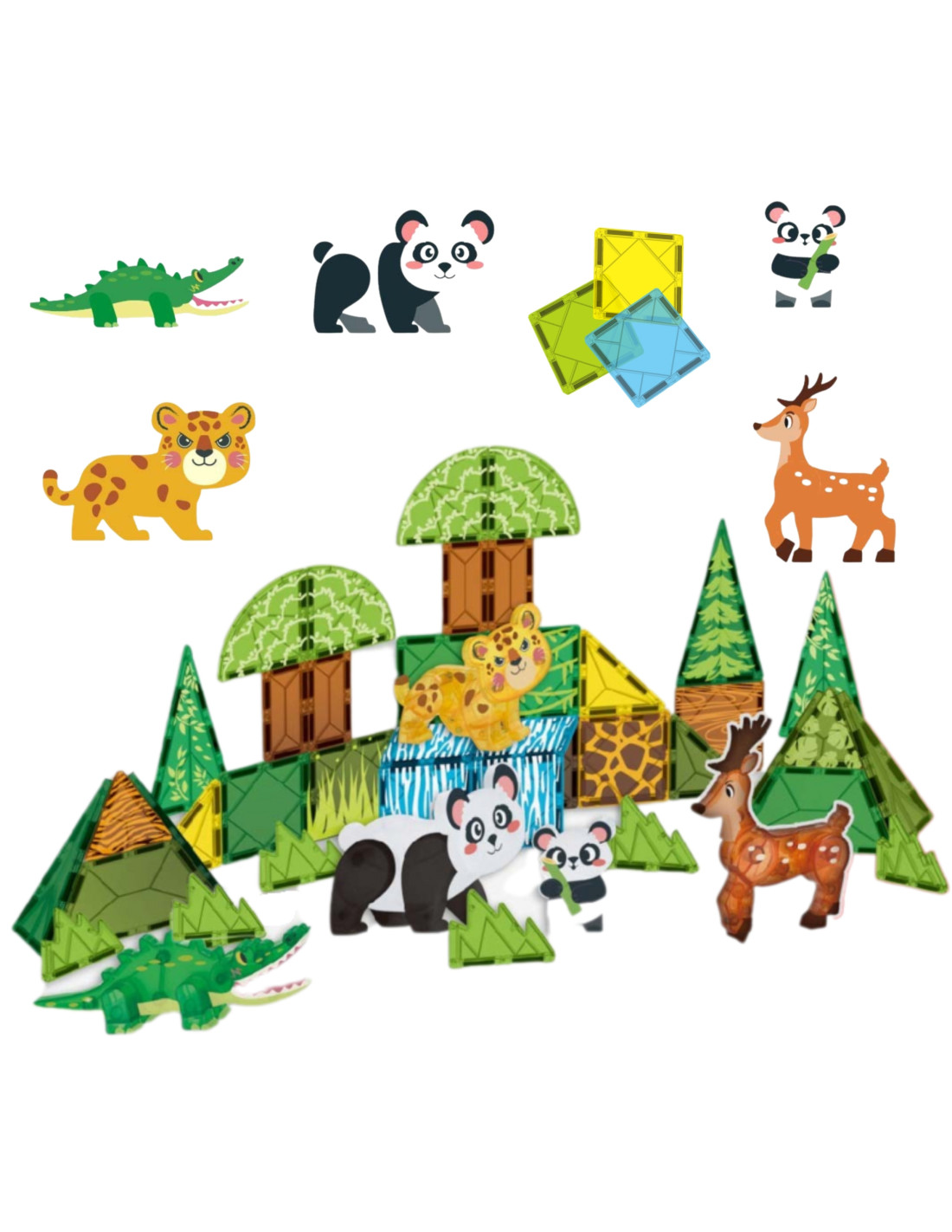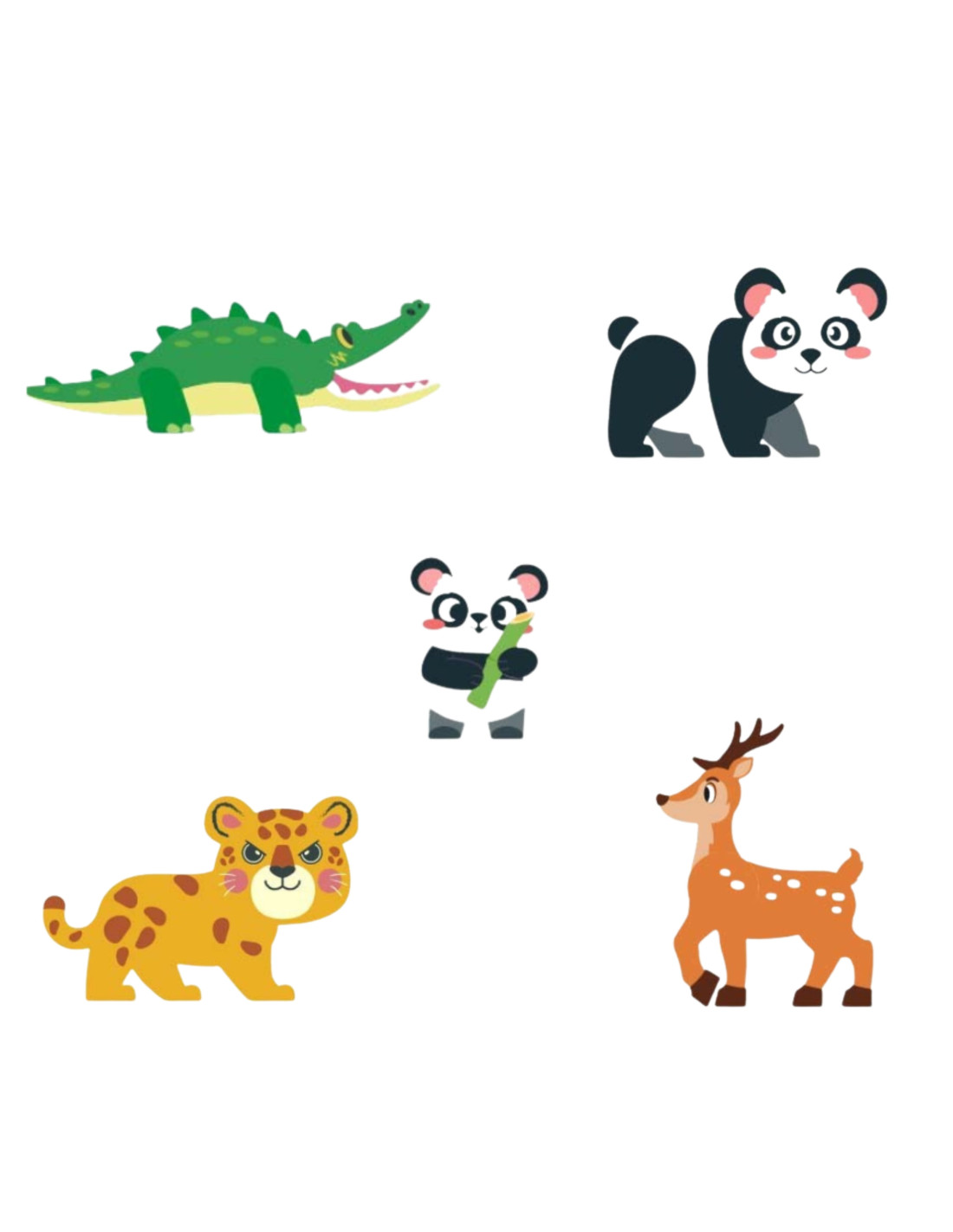 - - Animal figures: 2 x panda, leopard, deer, crocodile.