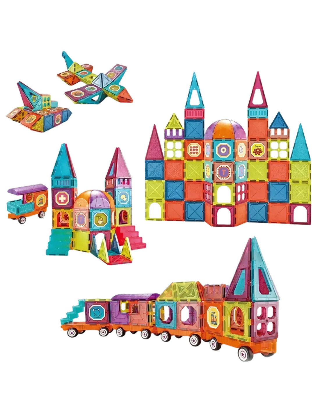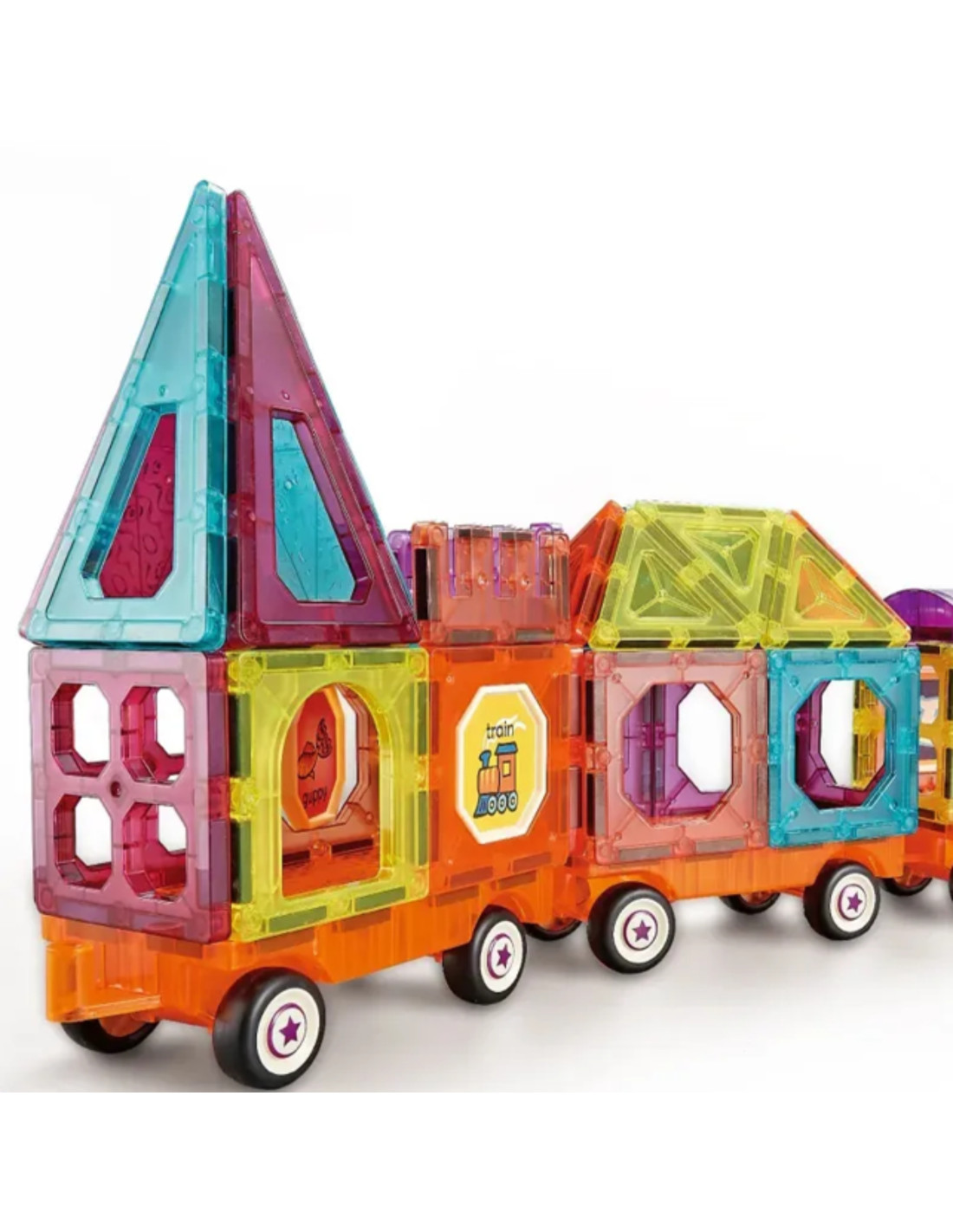 - - The set includes 71 pieces , including magnetic tiles, platforms with wheels and figures.