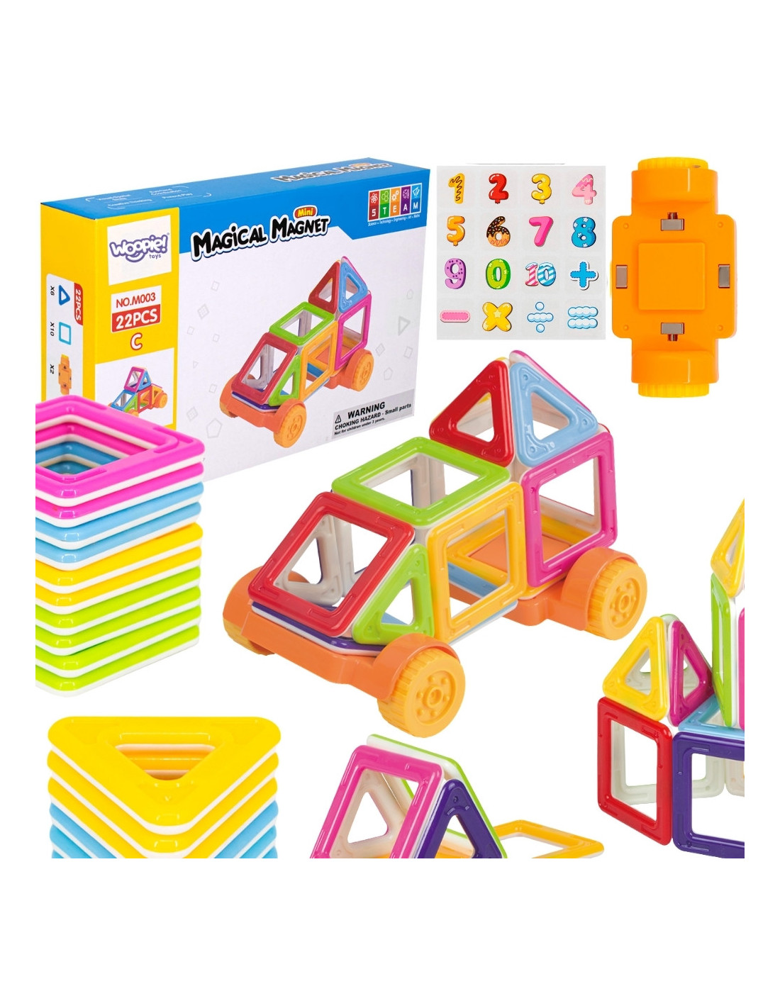 Discover the magic of building with Woopie 's 3D magnetic building block set! This compact set contains 22 colorful pieces , perfect for little builders. The square and triangle- shaped blocks connect with magnets, allowing you to create 3D structures like a house or a vehicle on wheels . Magnetic connections make the structures stable and easy to create and transform , making them ideal for children aged 3 and up . The blocks support STEAM (Science, Technology, Engineering, Art, Math) development, inspiring learning through play. Vibrant, transparent colors attract attention, and play develops spatial imagination and manual skills . This set is a great start to an adventure with magnetic blocks or the perfect addition to a larger collection.