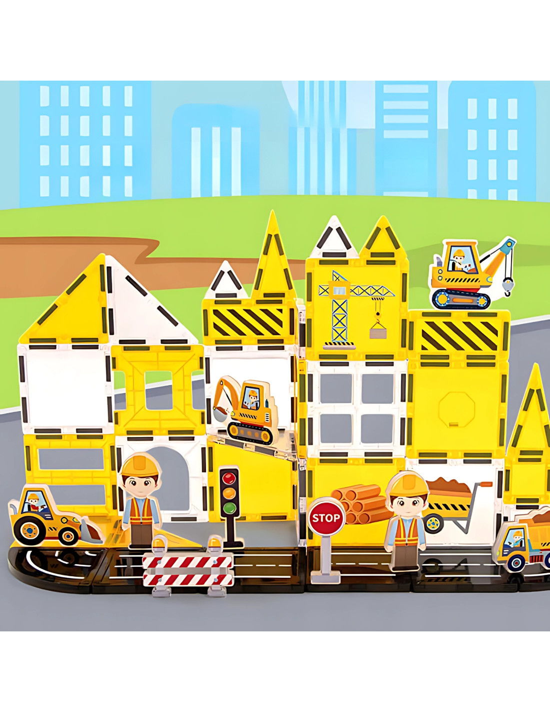 - - Themed construction prints, warning stripes and road elements add realism and inspire construction site scenes.