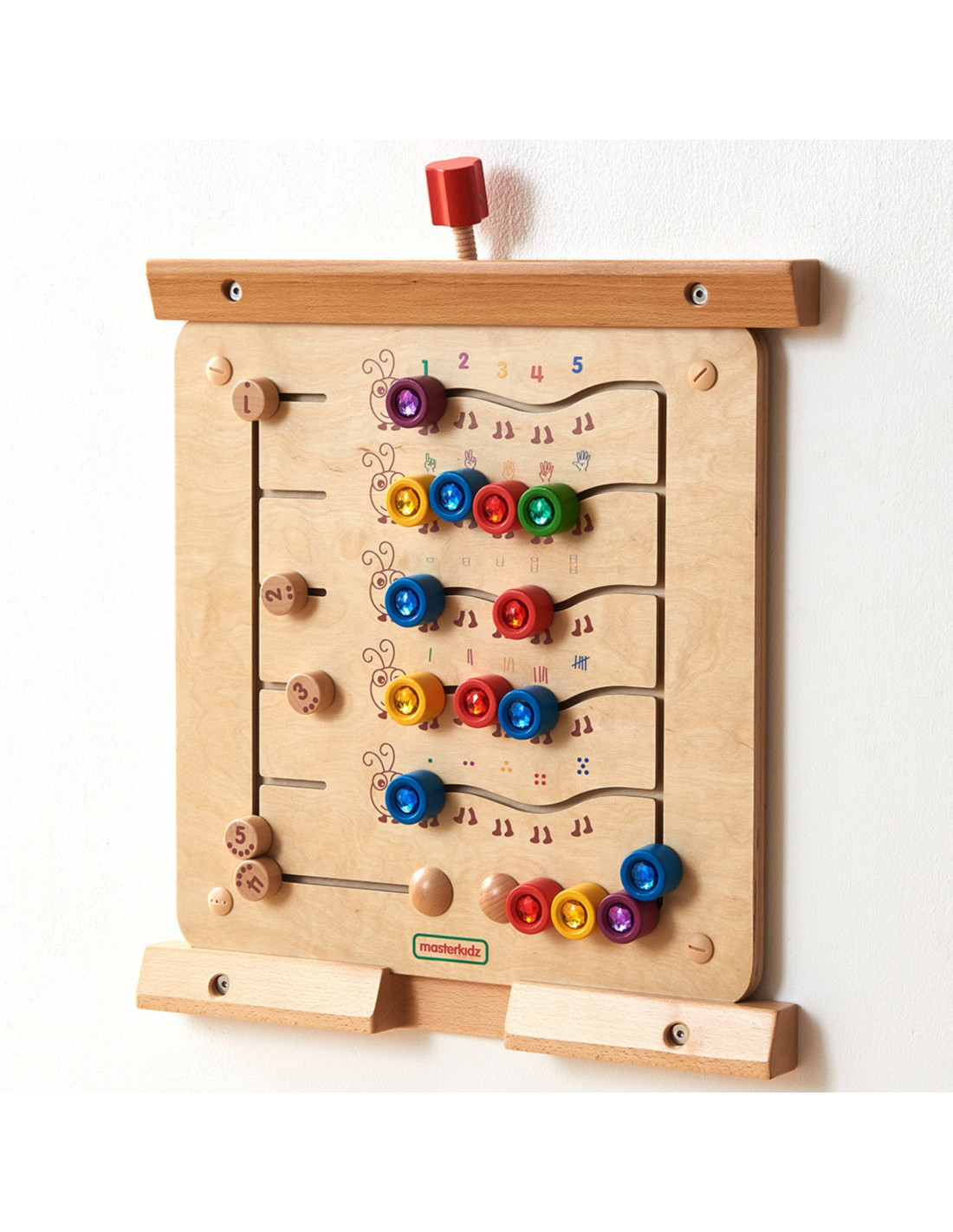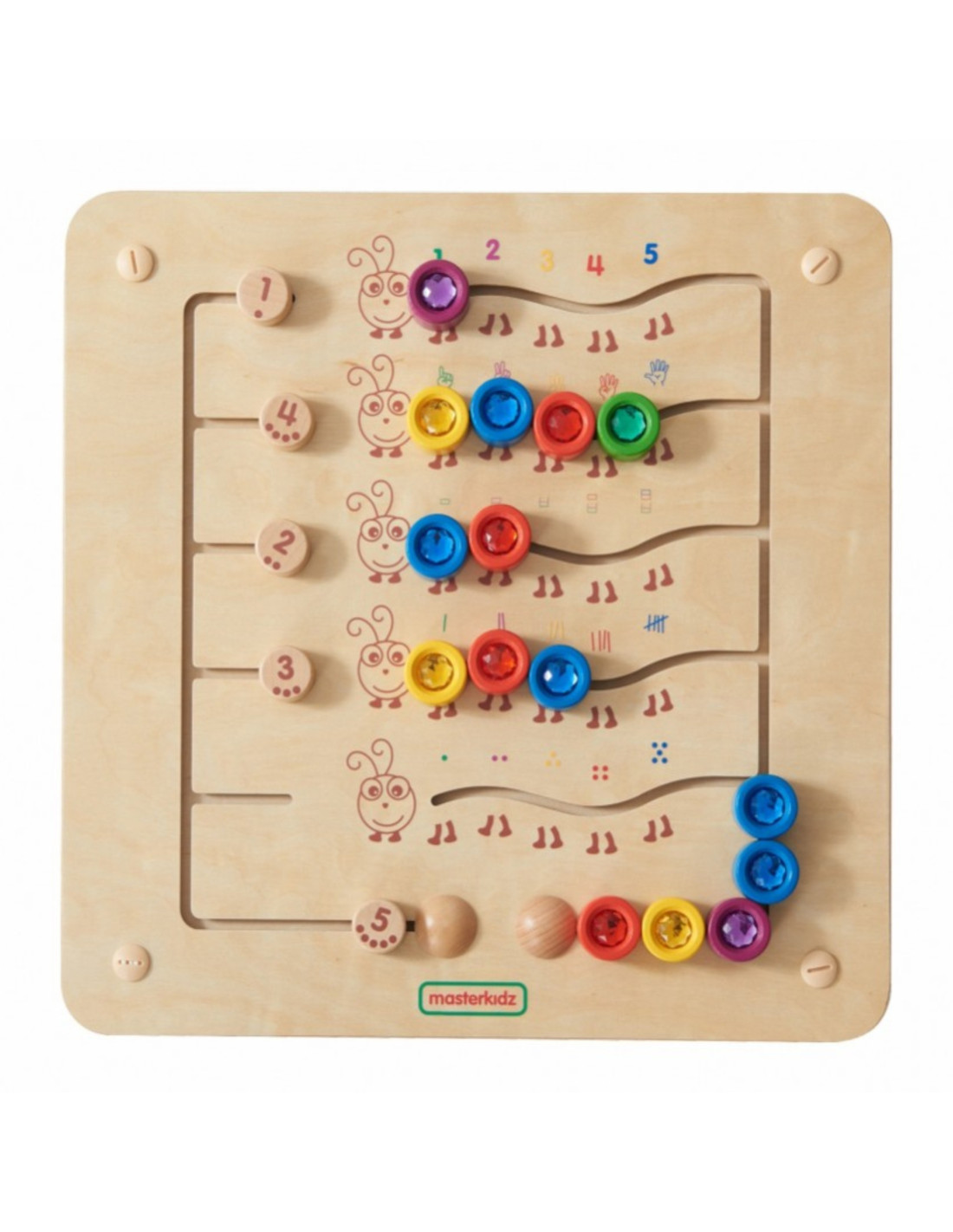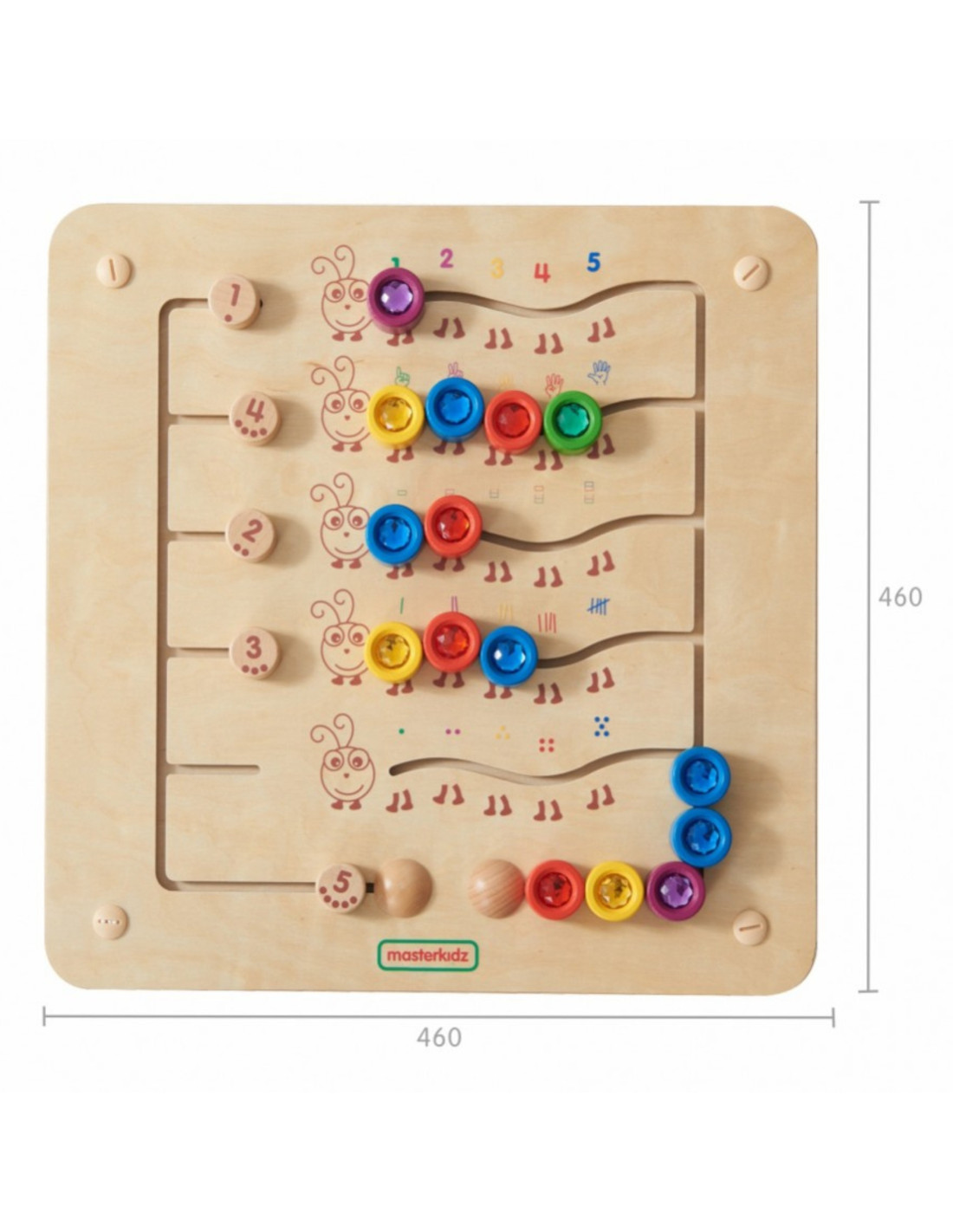 The educational board features 5 colorful caterpillars and 15 counters with diamonds in 5 colors, placed on sliders. Children can move them but not remove them. The board shows 5 number substitutes from 1 to 5 (numbers, fingers, lines, blocks, dots). On the left side, there are sliders for setting challenges. Children can play freely or use the board to learn counting up and down to 5 by sliding the gems into the appropriate positions.