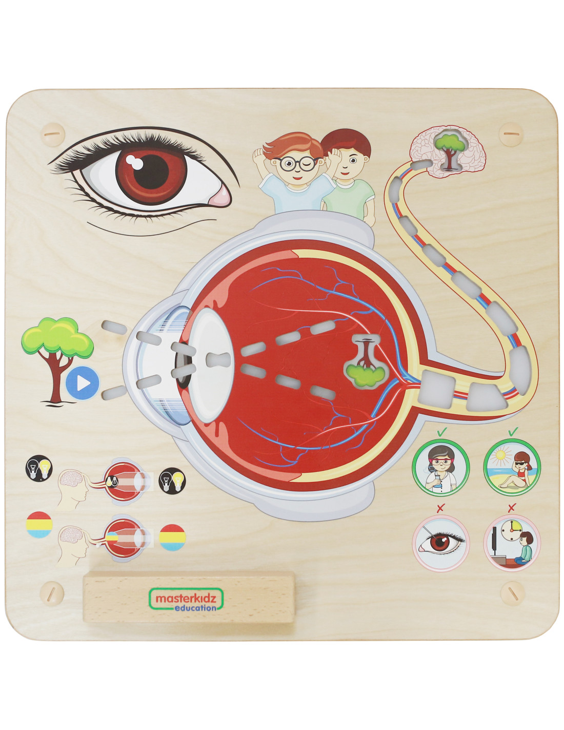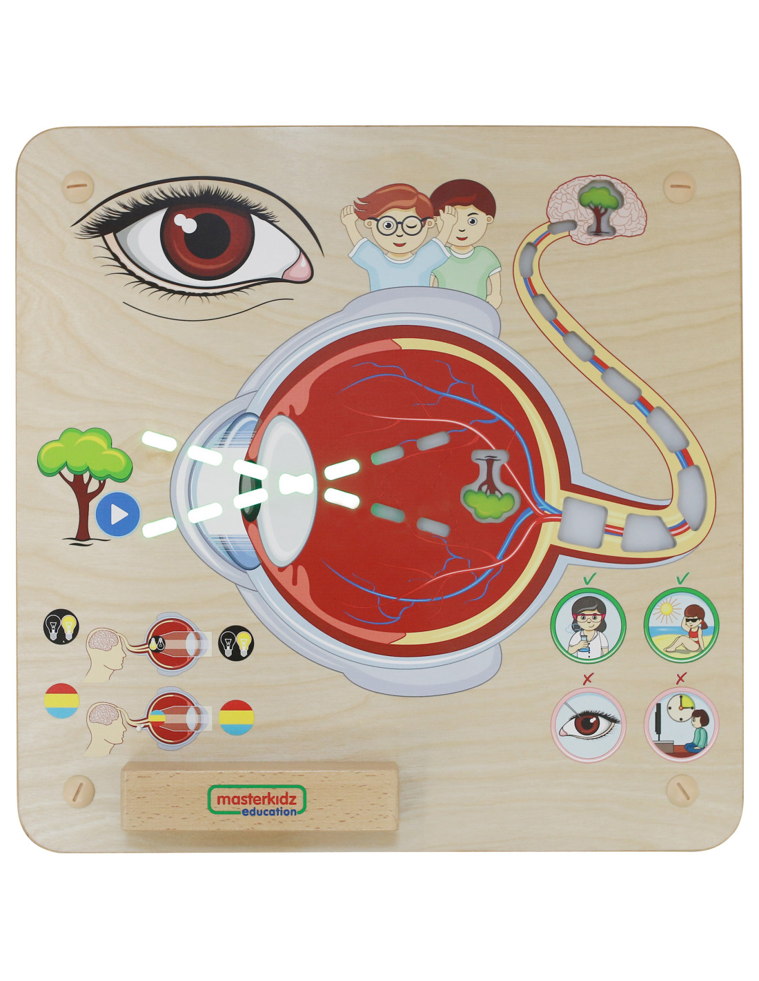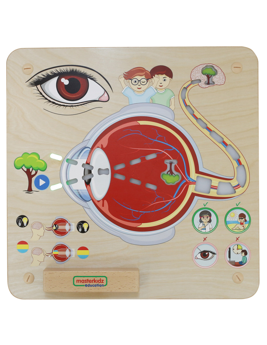 - - the board also teaches children how to take care of their eyesight - do not watch too much TV, do not put anything in their eyes, wear sunglasses when in the sun, and wear protective glasses when using chemicals