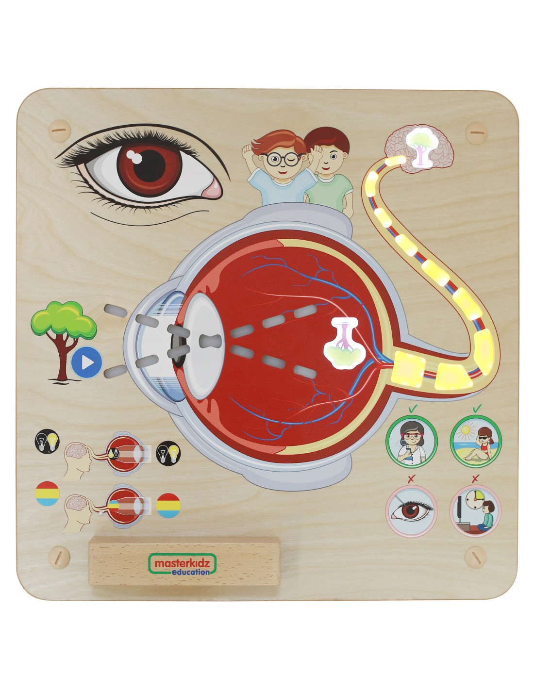 - - the pictures at the bottom of the board show the child that human eyes can recognize shapes, colors and brightness