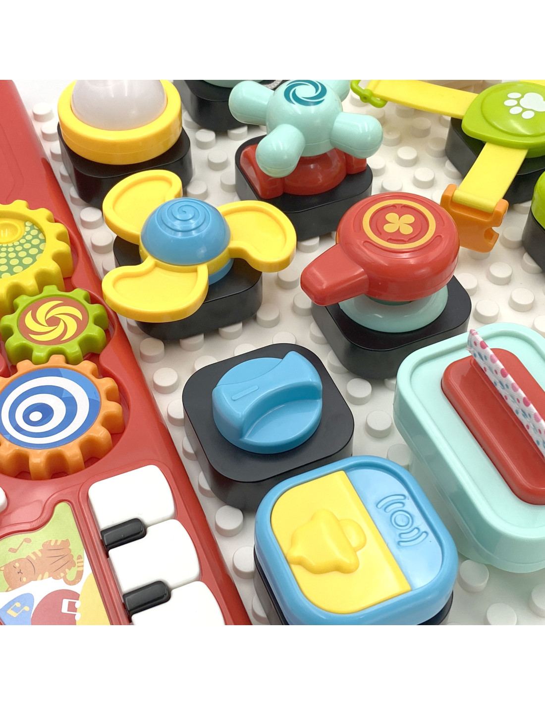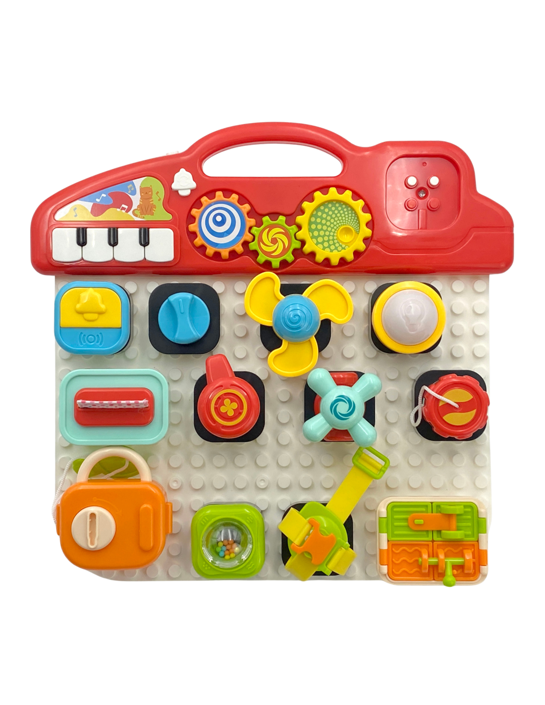 The attached blocks feature various switches, knobs, buttons, removable wipes, a padlock with a key, and latch-opening windows. They develop children's motor, cognitive, and sensory skills, as well as hand-eye coordination.