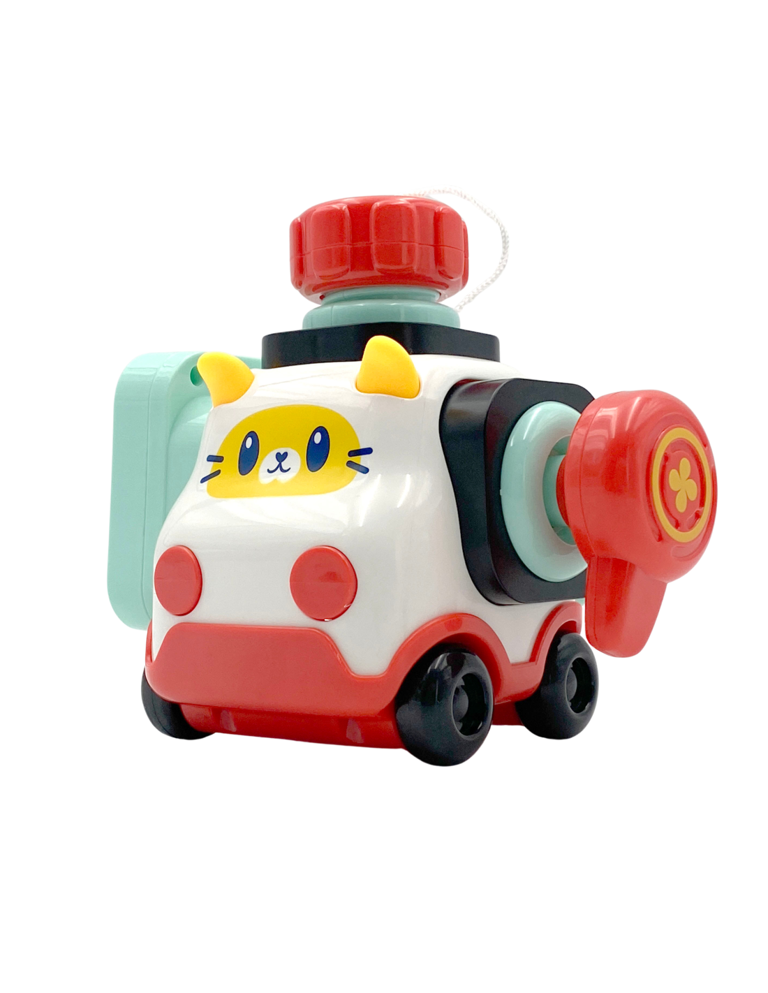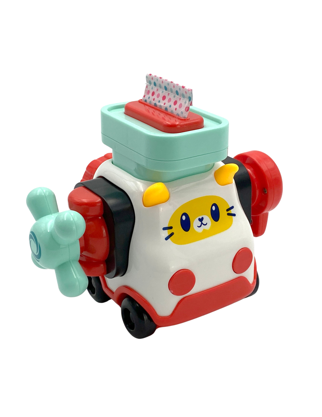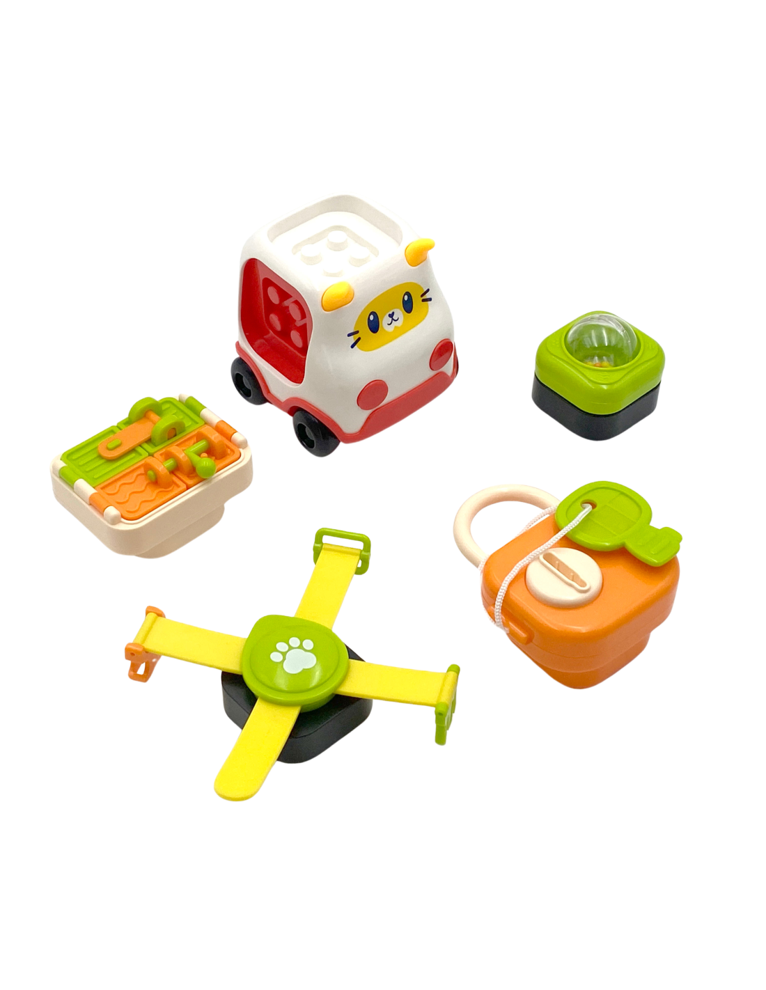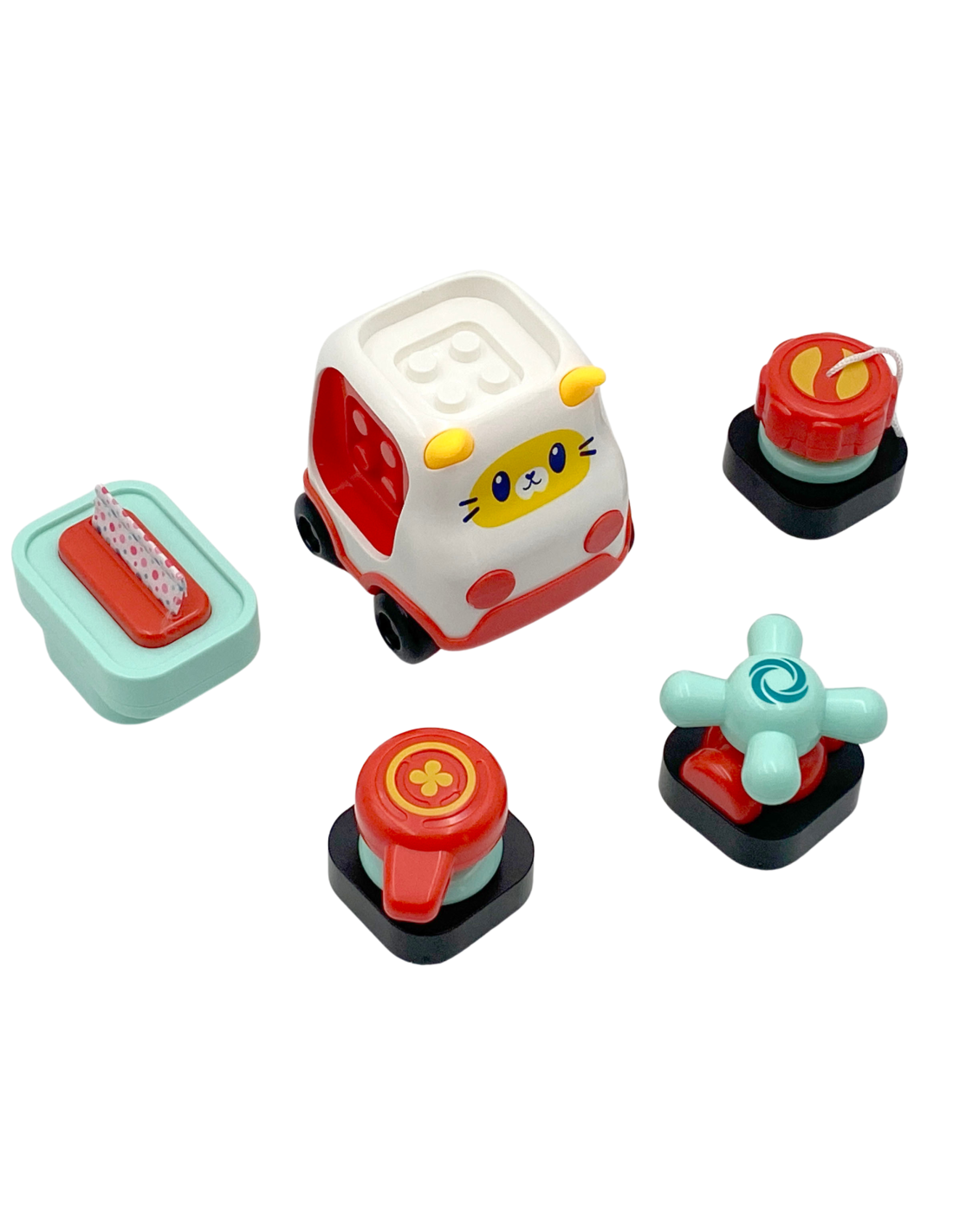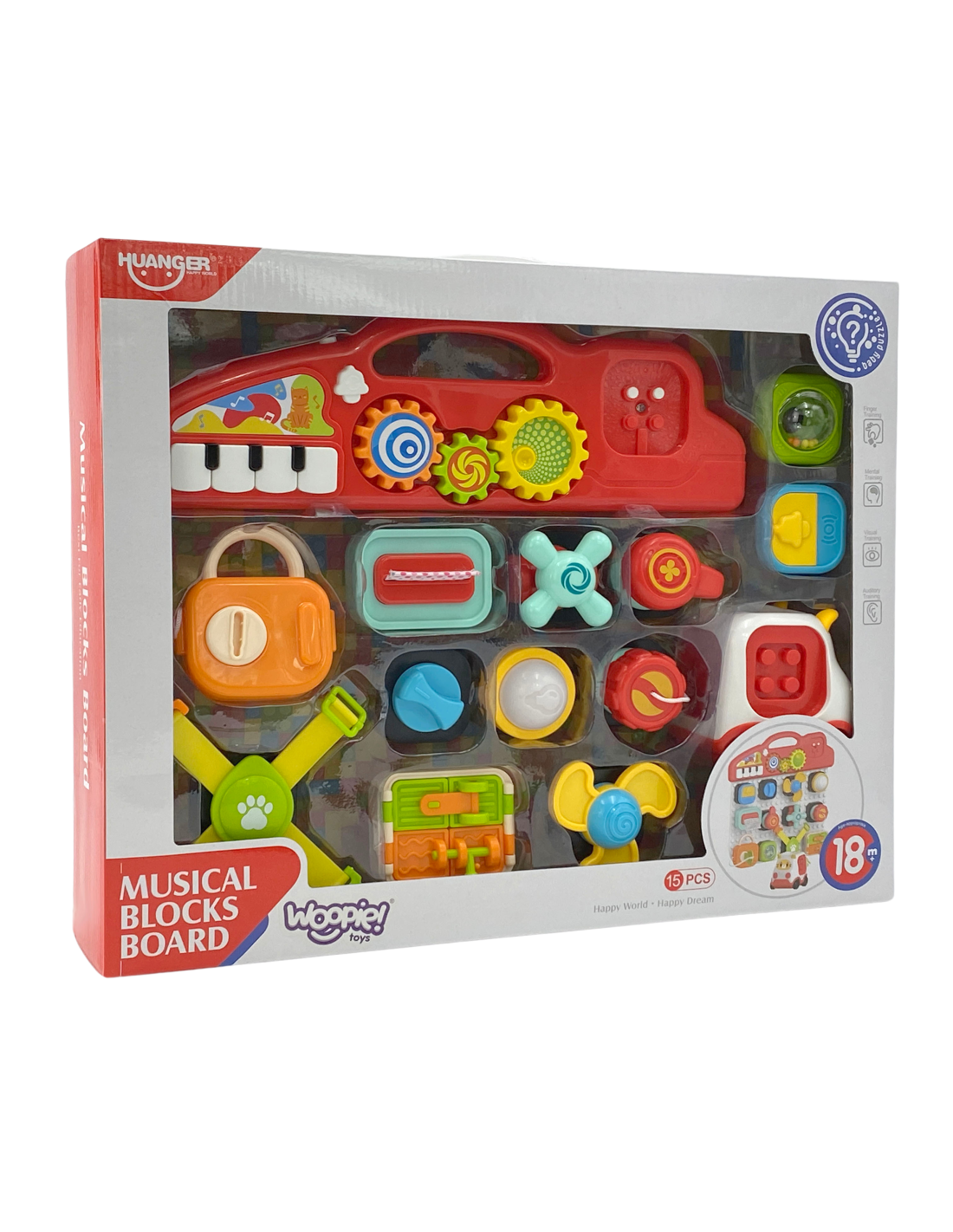 The colorful Woopie activity panel is a fascinating developmental toy designed to support children's sensory and motor development. The panel consists of a variety of interactive elements that can be attached and detached, much like building blocks. The set also includes a kitten-shaped car to which you can freely attach elements from the board.