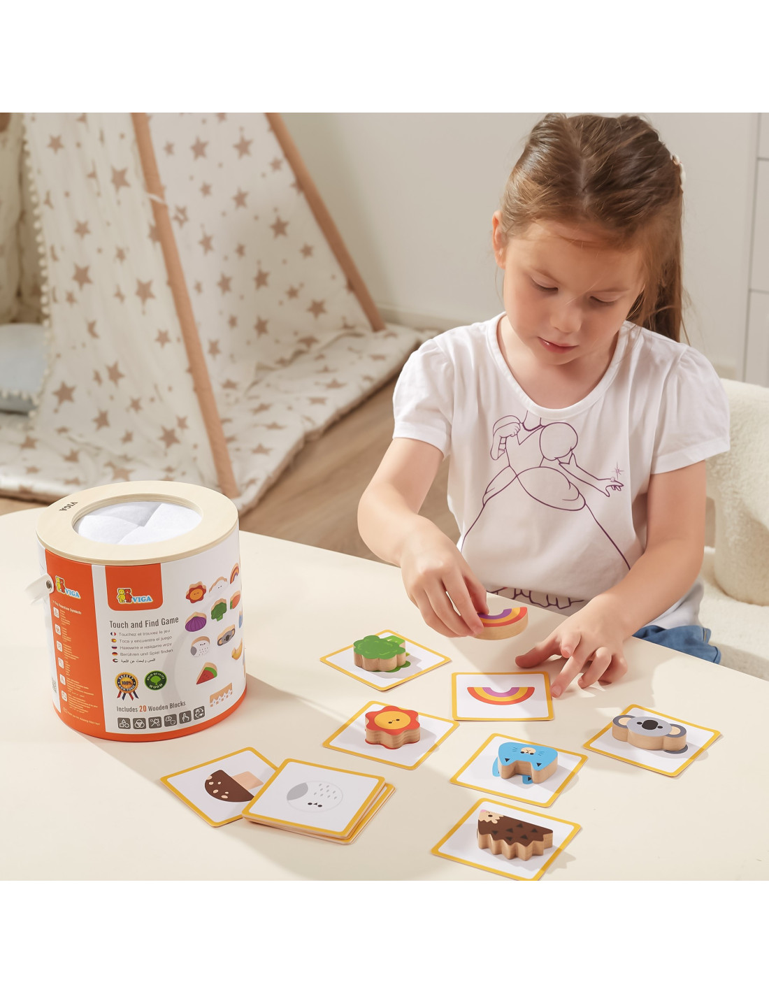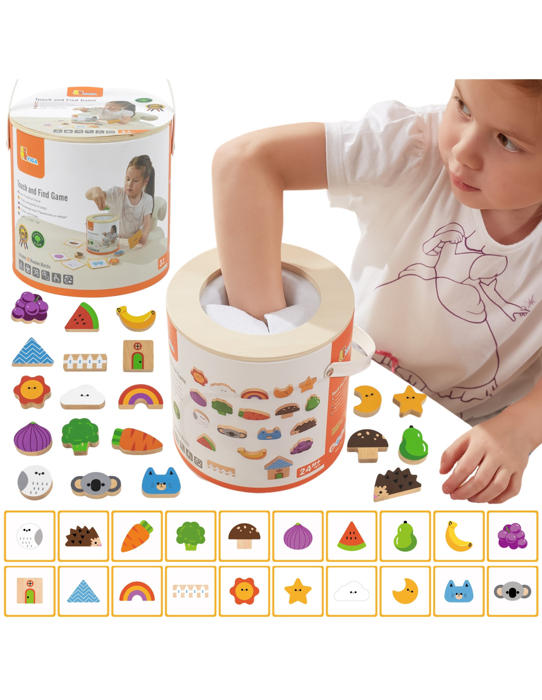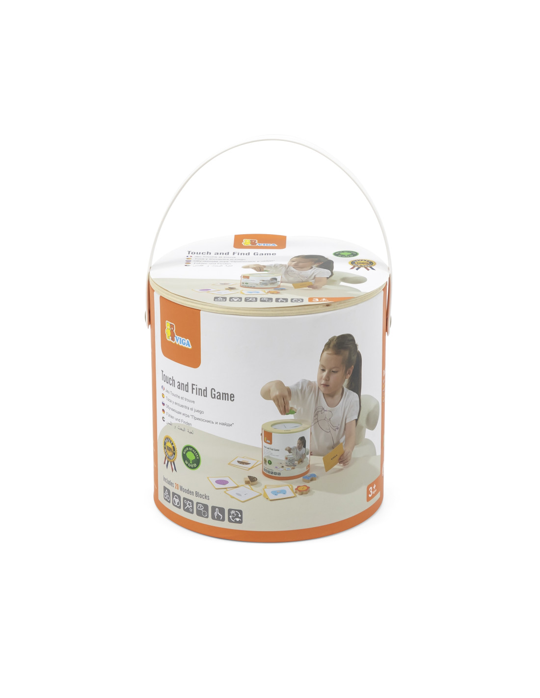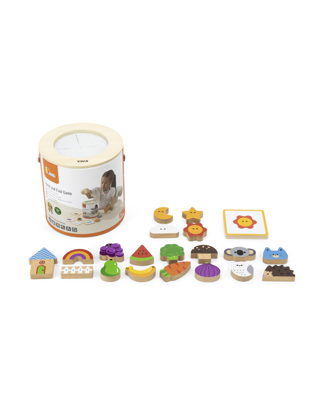 Viga 's Blind Game will not only entertain your child but also develop essential skills needed for school . The game includes 20 beautifully crafted, colorful wooden blocks, 20 playing cards, and a package with a hole cut out for the child to play "touch and feel" and also serves as storage.