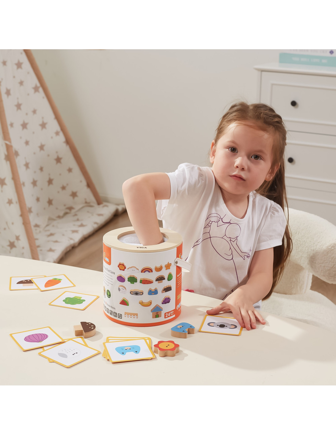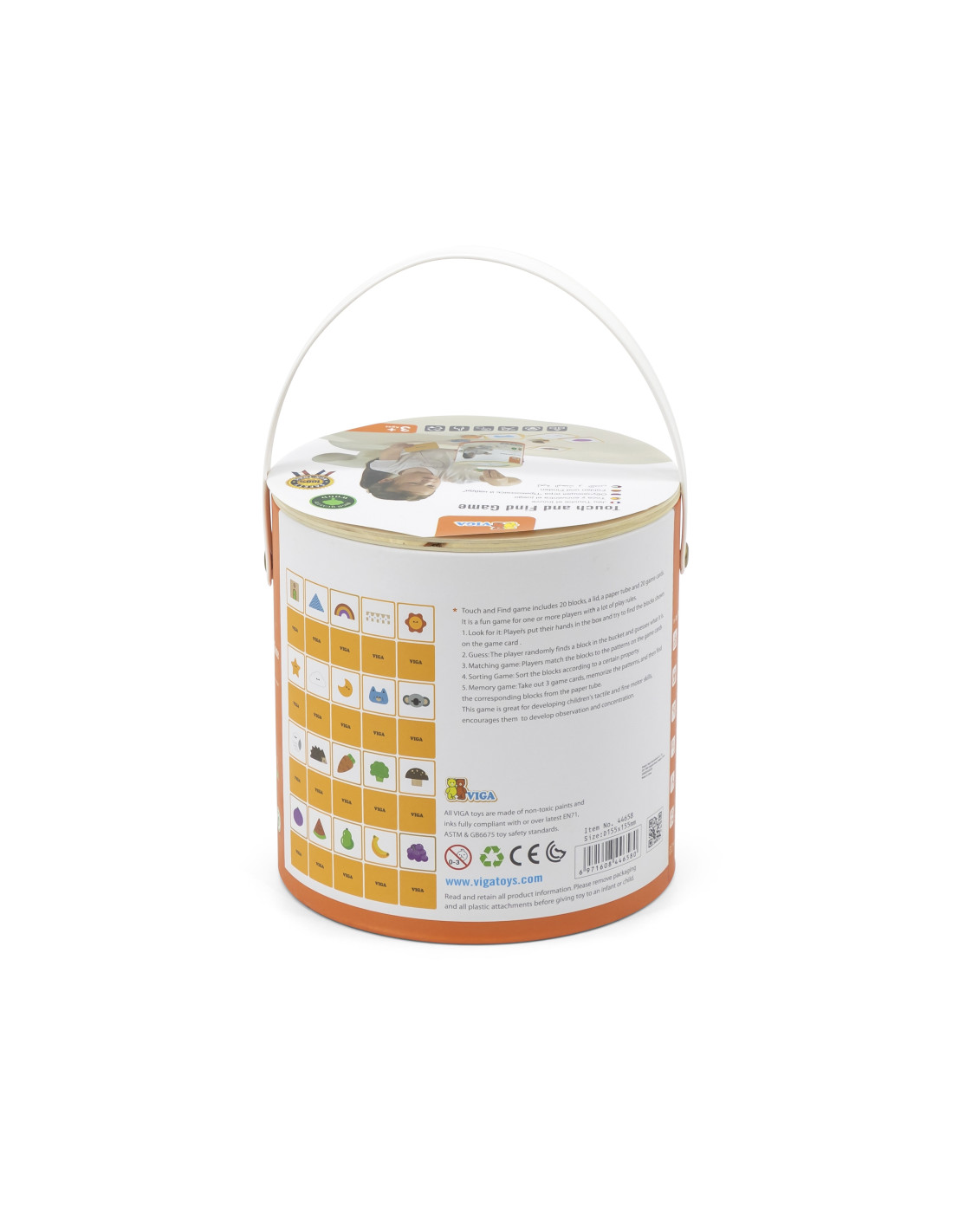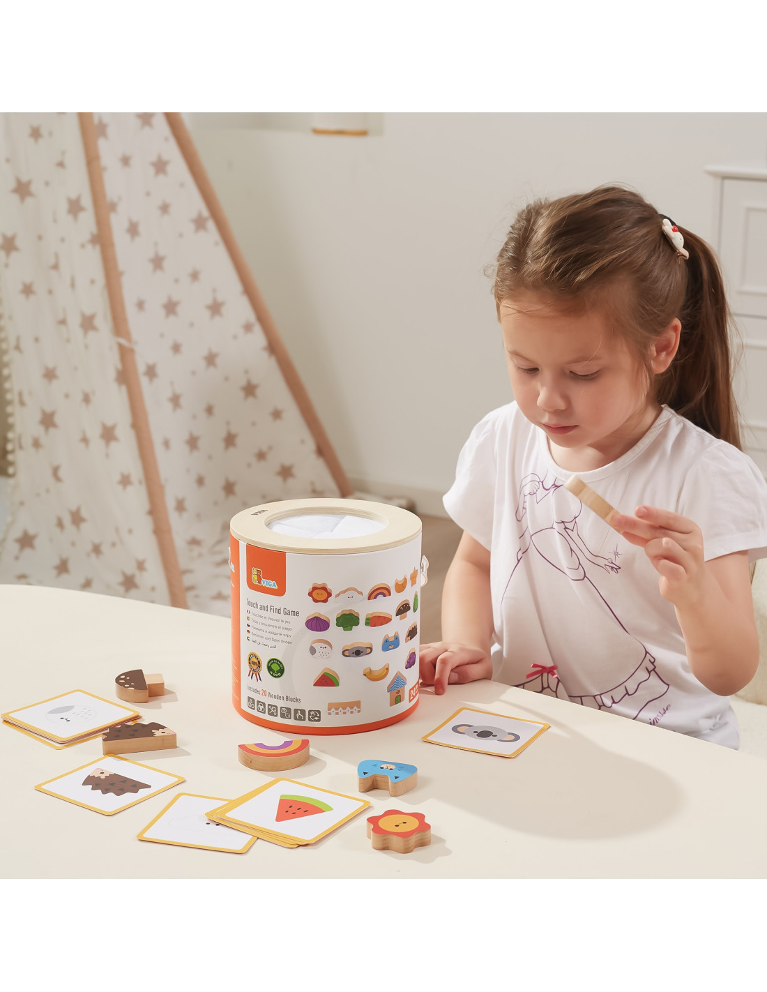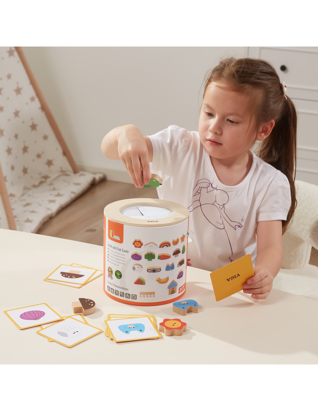 Viga 's Blind Game will not only entertain your child but also develop essential skills needed for school . The game includes 20 beautifully crafted, colorful wooden blocks, 20 playing cards, and a package with a hole cut out for the child to play "touch and feel" and also serves as storage.
