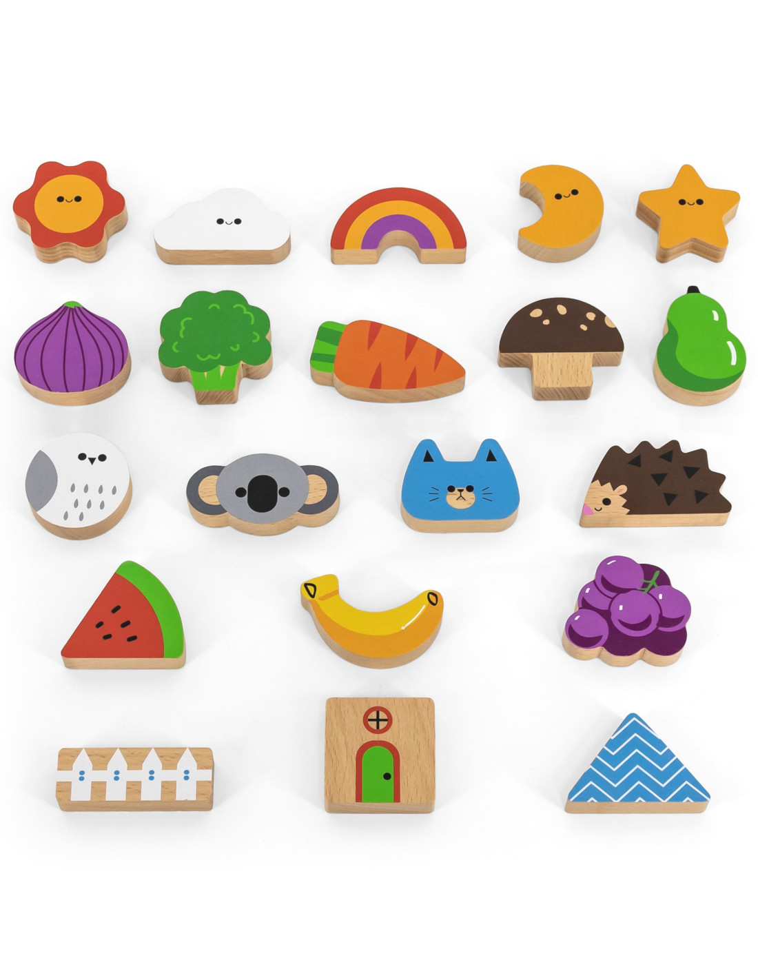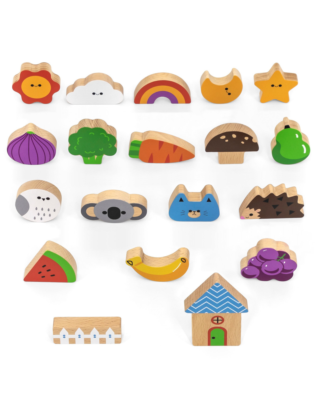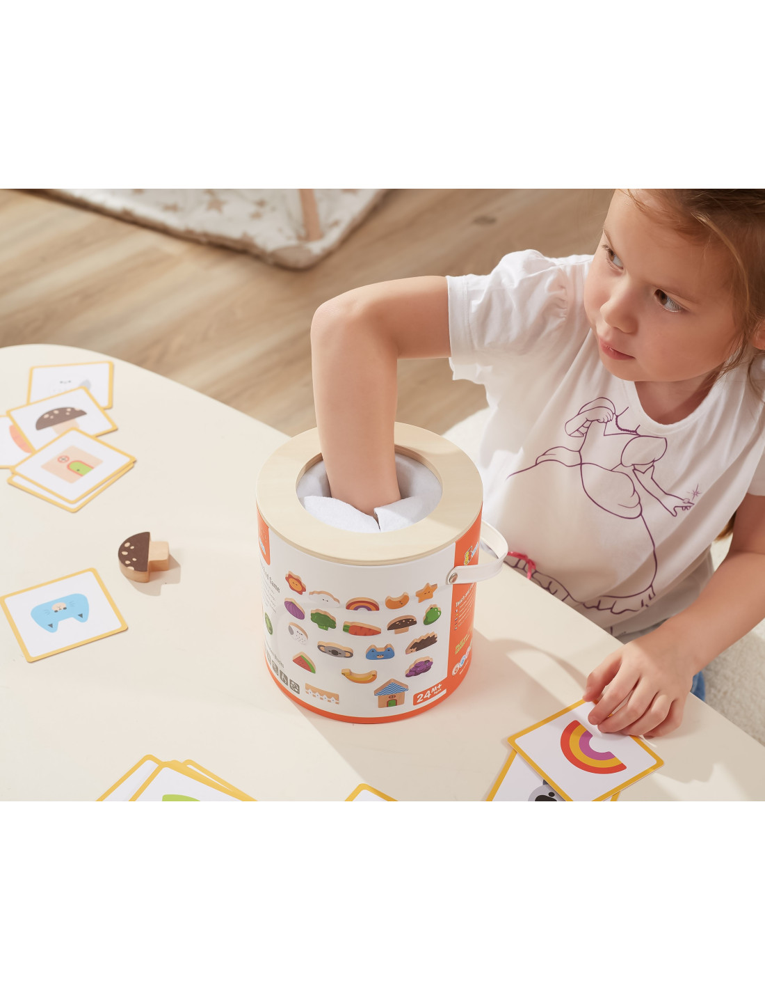 - - the set contains 20 blocks, 20 cards and a package with a hole through which the child can play "touch and feel",