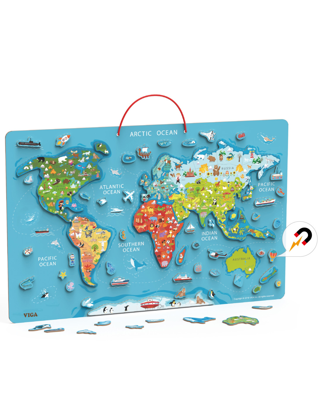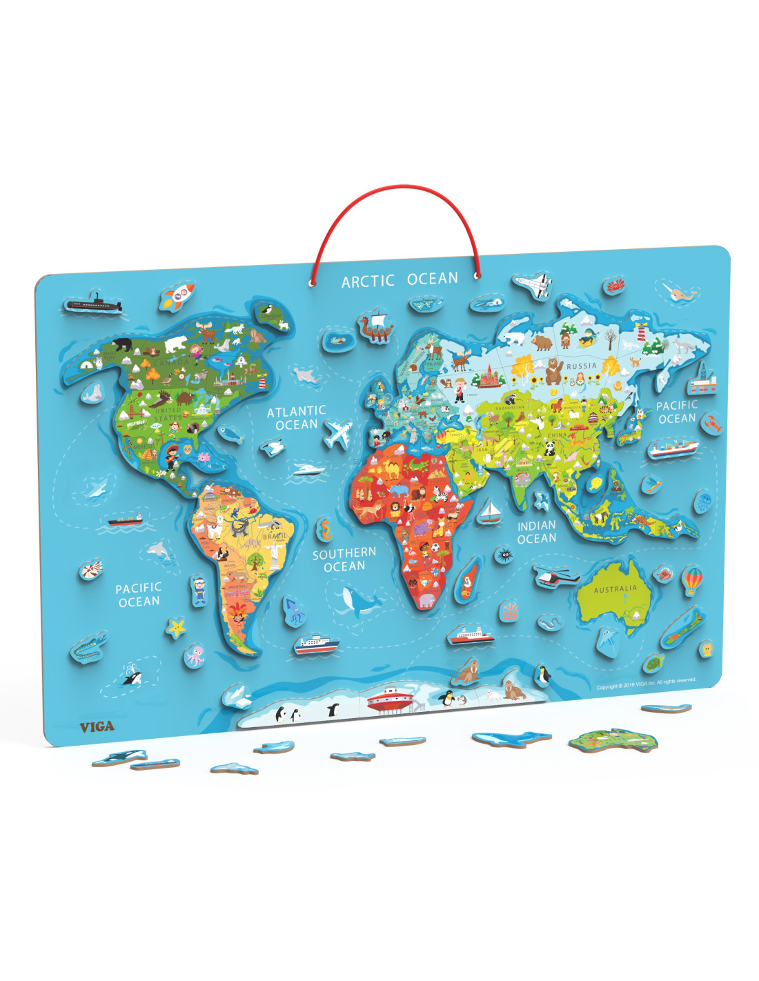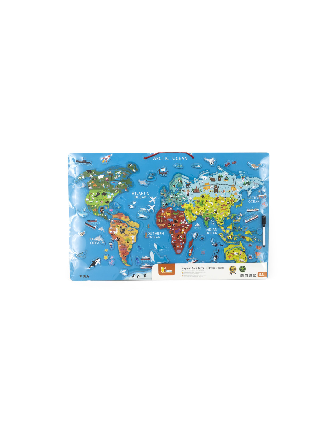 The Viga 2-in-1 Educational Board with a Magnetic World Map , which also doubles as a drawing board, is the perfect toy for young explorers curious about the world! This beautifully crafted board with magnetic elements combines educational value with fun. Add wooden elements – continents, ships, airplanes, rockets, and animals that inhabit the ocean floor. The map, labeled in English, is a perfect support for English language learning.