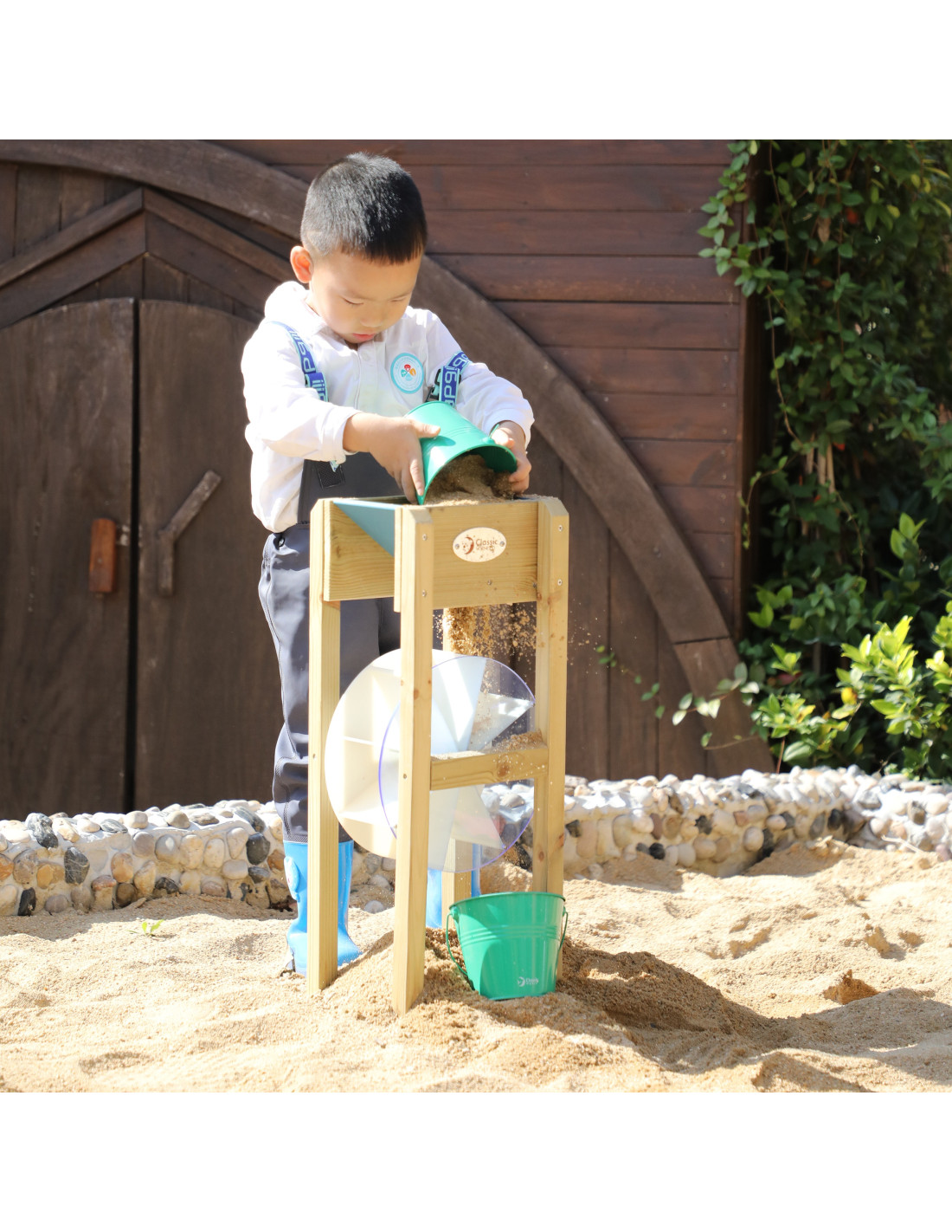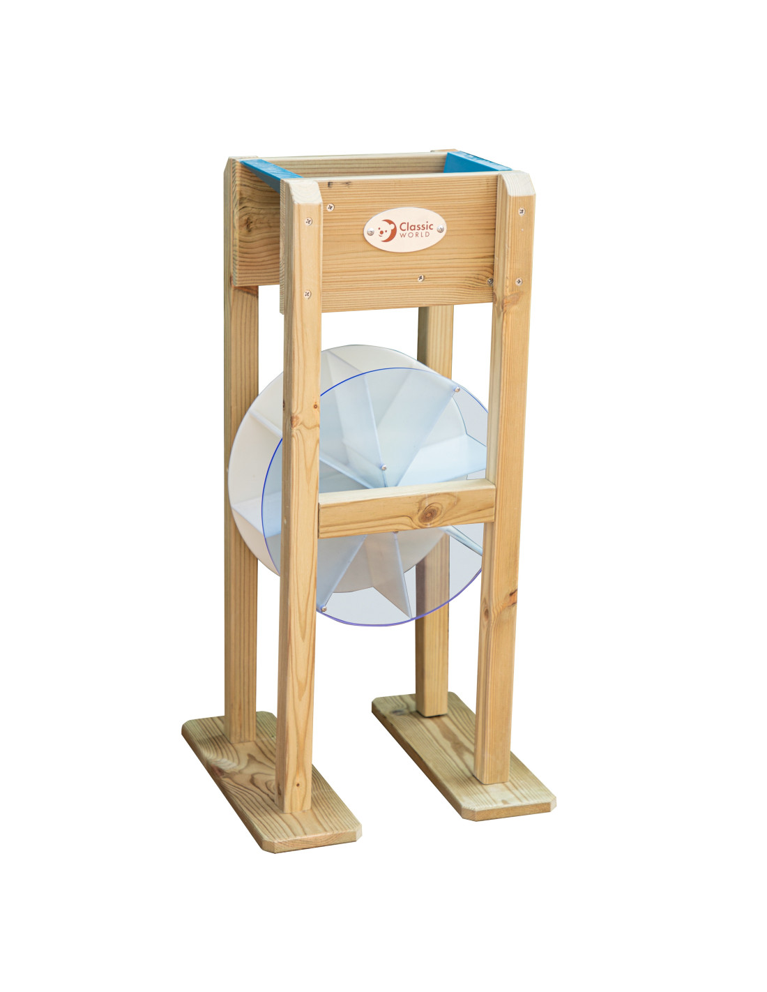 This children's sand mill from the renowned Classic World brand is the perfect addition to your sandbox! It's made of high-quality wood and painted with a non-toxic , child-safe impregnation. Simply fill the funnel with sand and watch it pour through the hole, causing the mill to spin. The fun will also serve as a learning tool for propelling and setting the wheel in motion.