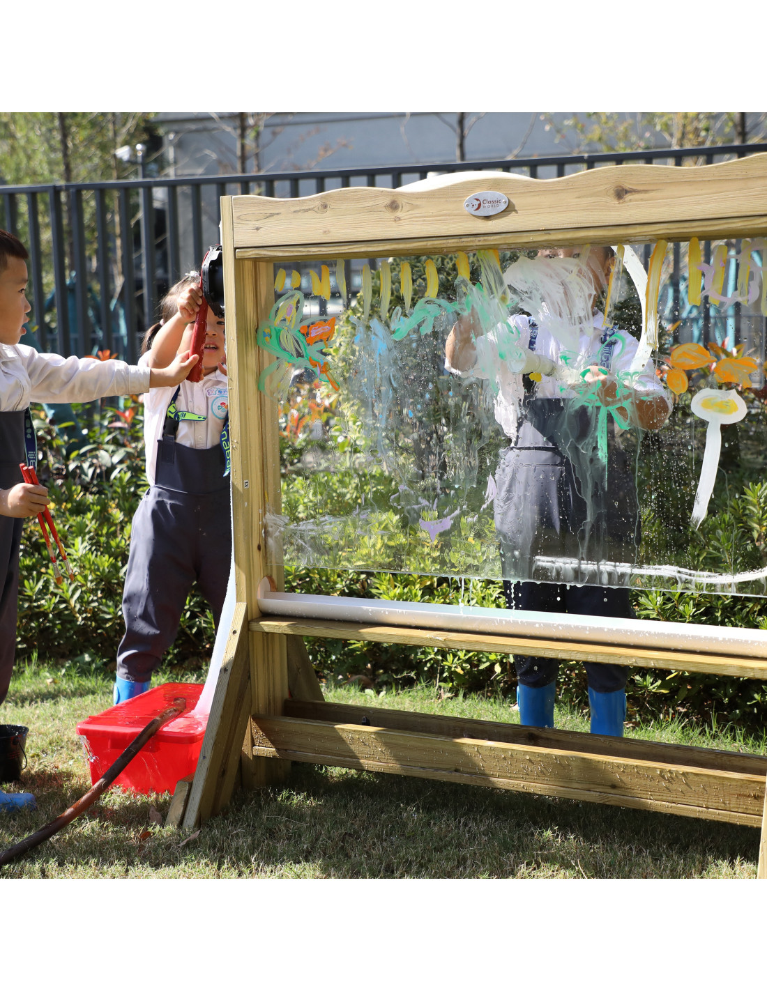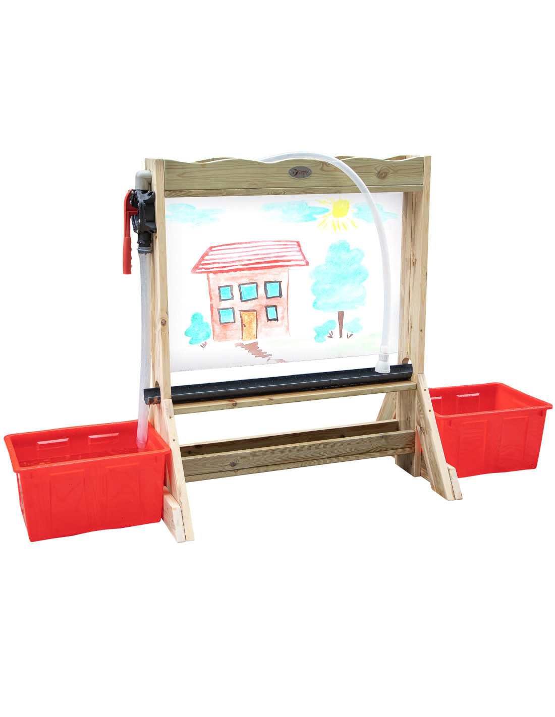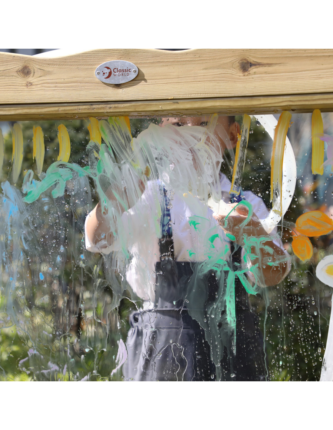 This CLASSIC WORLD board, set in a sturdy wooden frame, features a clear acrylic surface, ideal for finger and water-based paints. It's designed for two children to work together, each drawing on one side of the board. When they're finished, children can use the pump to spray water, making it easy to clean . It's perfect for both painting and water play.