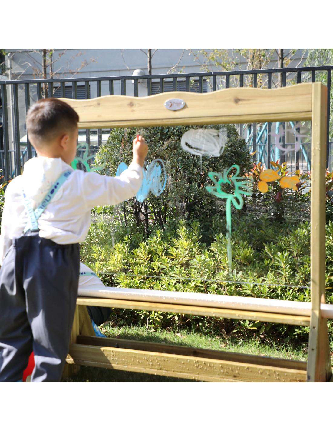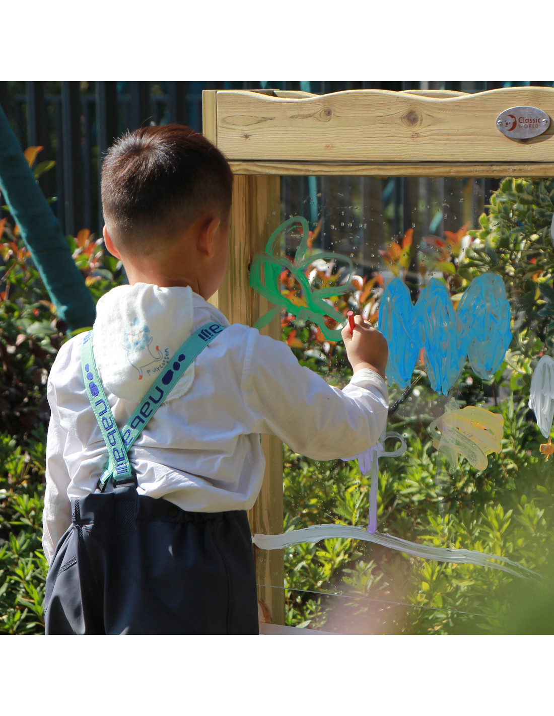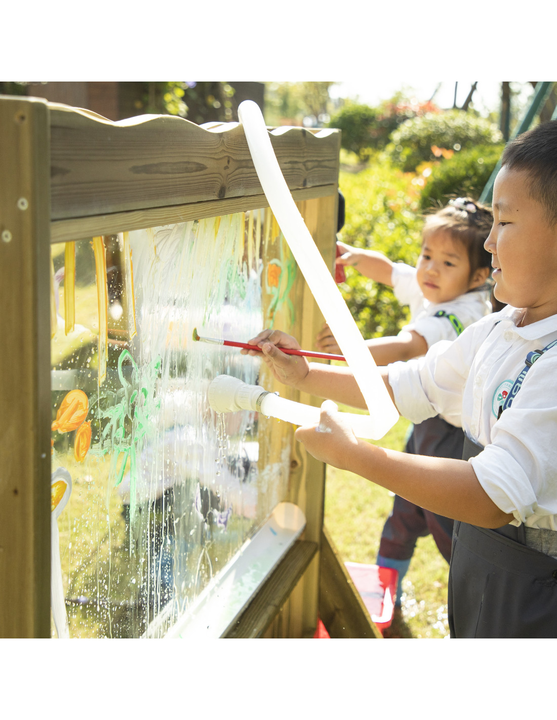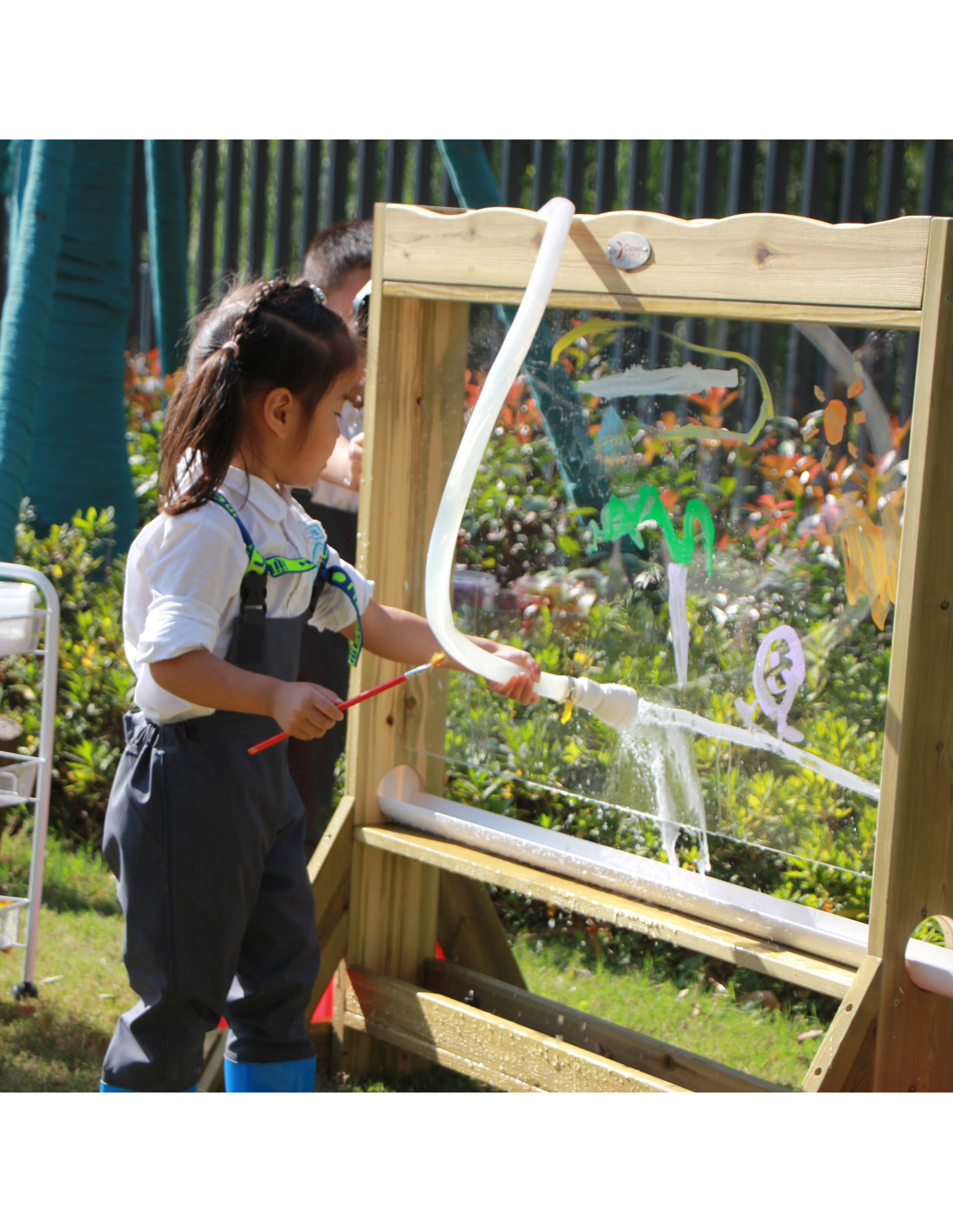 This CLASSIC WORLD board, set in a sturdy wooden frame, features a clear acrylic surface, ideal for finger and water-based paints. It's designed for two children to work together, each drawing on one side of the board. When they're finished, children can use the pump to spray water, making it easy to clean . It's perfect for both painting and water play.