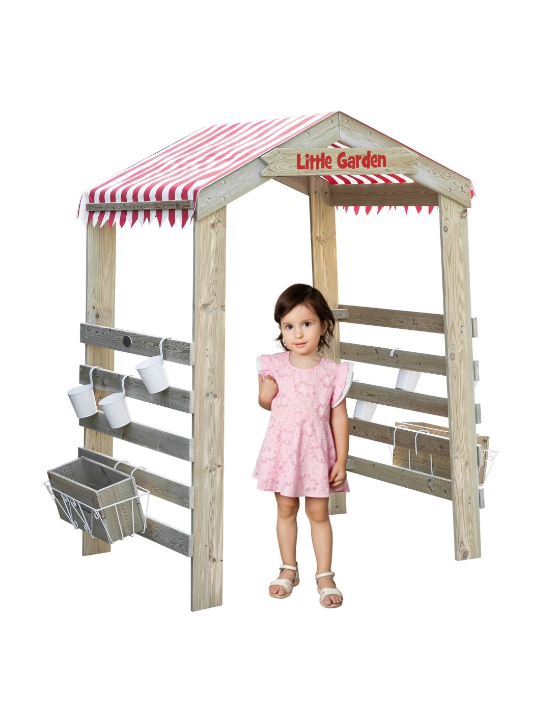 Open your child's door to a world full of nature and imagination with the CLASSIC WORLD wooden garden gate! This charming, country-inspired structure with a red-and-white striped roof is the perfect complement to any home garden, preschool playground , or learning corner . Equipped with practical shelves and hooks for tools and flowerpots, it encourages little ones to play gardener , fruit and vegetable seller, or simply provides a magical gateway to their own imaginary world. The sturdy wooden structure ensures safety and durability, guaranteeing hours of active, developing outdoor play.