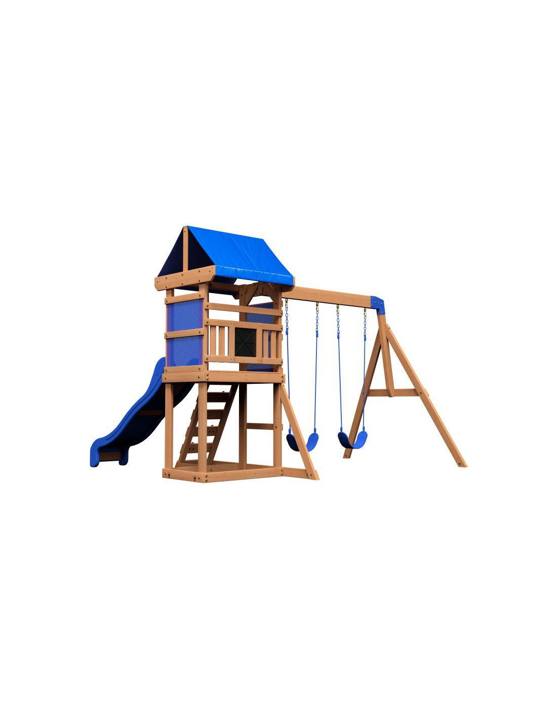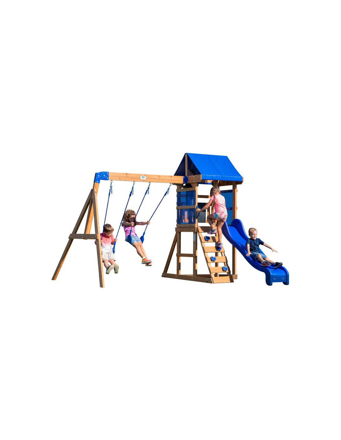 The Aurora Backyard Discovery Playground is also perfect for smaller gardens. Playing in the garden will never be boring again! The Aurora wooden playground offers a multitude of play options. It features a platform with a wavy blue slide, accessible via a safe ladder that also serves as a climbing wall . A blue roof covers the entire area, providing shade from the sun. At the bottom, you'll find a sandbox and two sturdy swings.