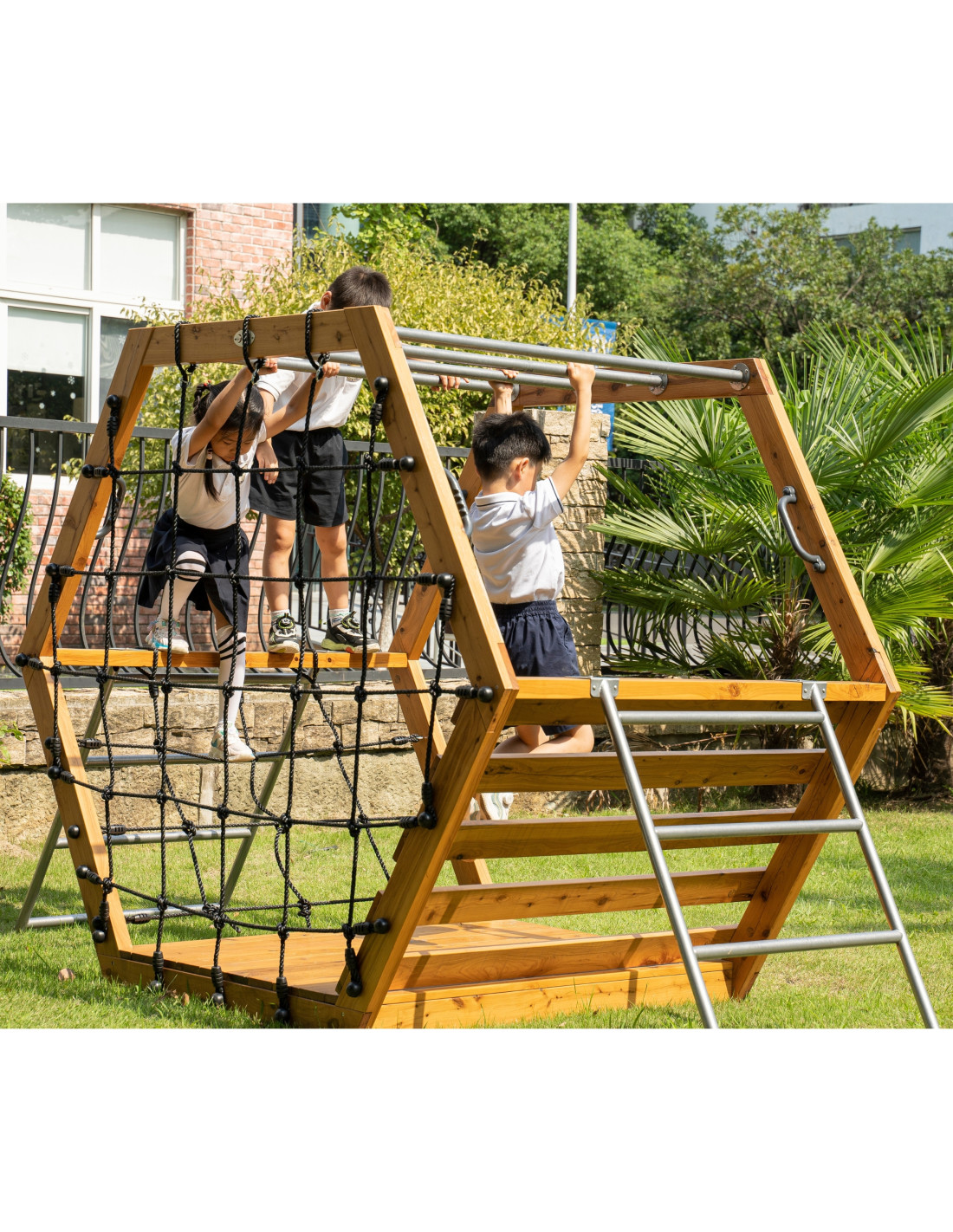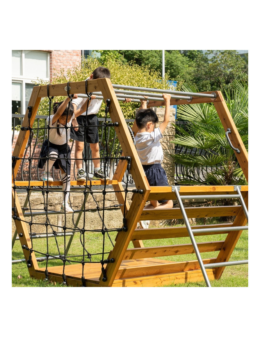 - Equipped with a metal ladder, climbing net and hanging bars