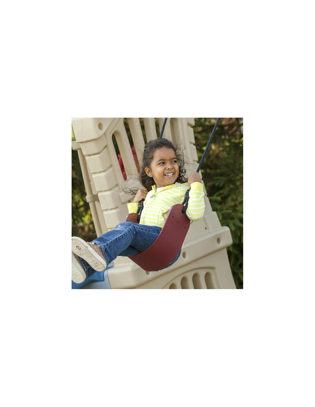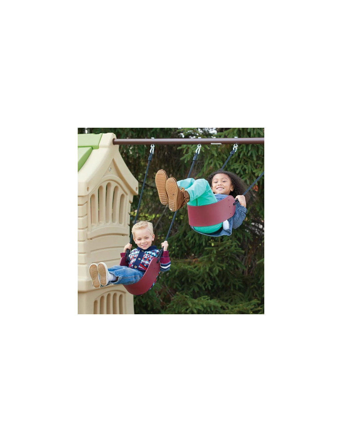 - - Two swings made of strong, flexible rubber ensure safe swinging for younger and older children.