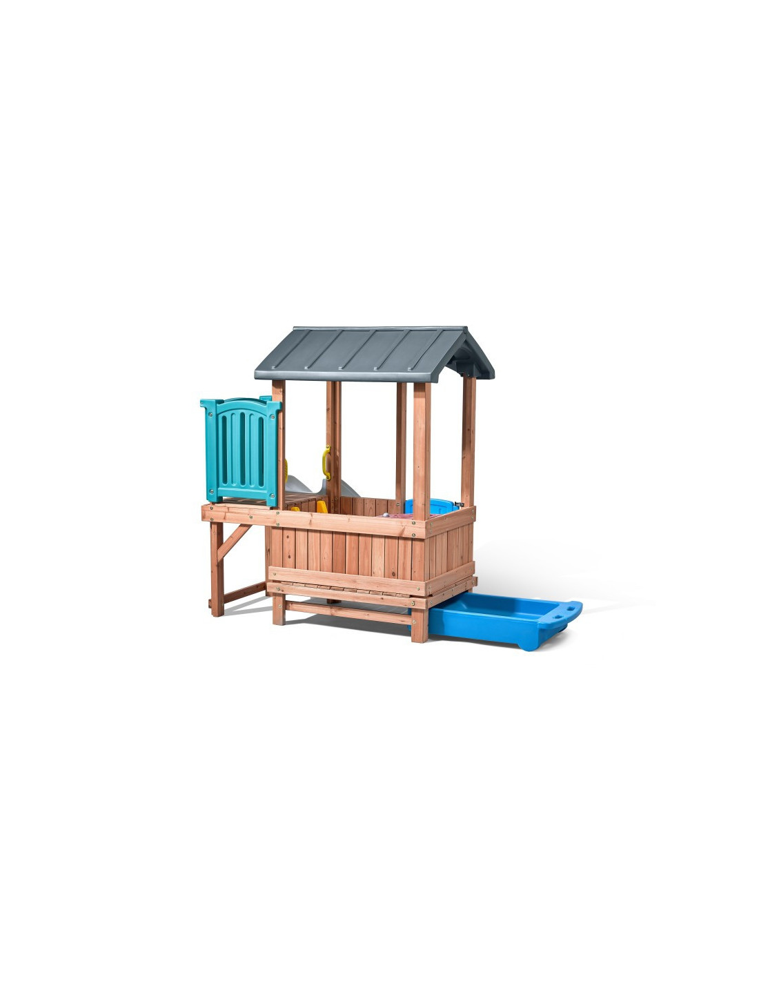 This charming playhouse and slide offers endless possibilities! It can be a castle, a hut, a pirate ship, or anything they want to imagine! This stylish backyard playset uses mixed materials for a unique look. The primarily wooden construction creates a classic look. The colorful plastic pieces are child-friendly and will last for hours of play! This wood and plastic playhouse will keep little ones entertained all day long!