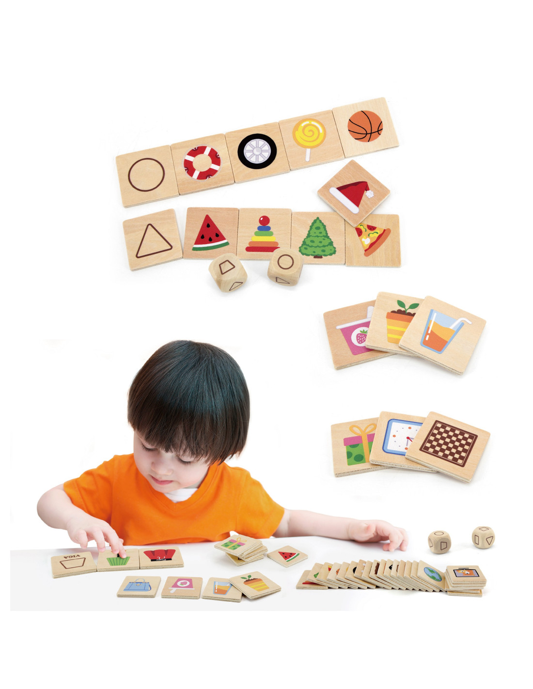 A wooden puzzle for learning and sorting shapes . The child's task is to match objects to selected shapes. The images depict many everyday objects, such as a flowerpot and a slice of pizza. Looking at the flowerpot, the child will see a trapezoid shape, while the pizza slice will be a triangle. The entire puzzle is made of wood and painted with non-toxic paints. The included instructions suggest variations for one or more players, and at varying difficulty levels.