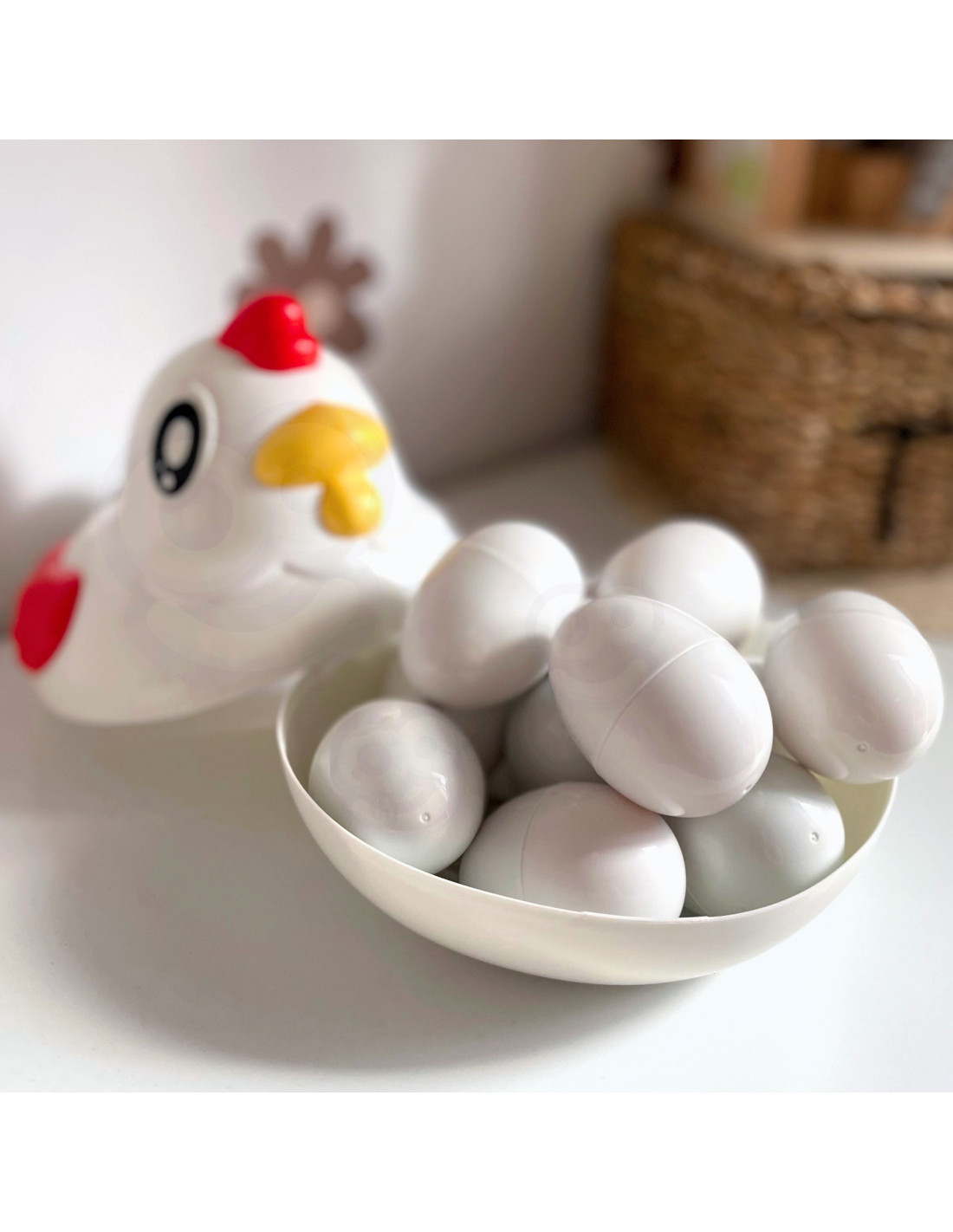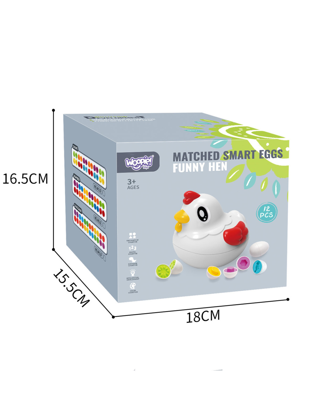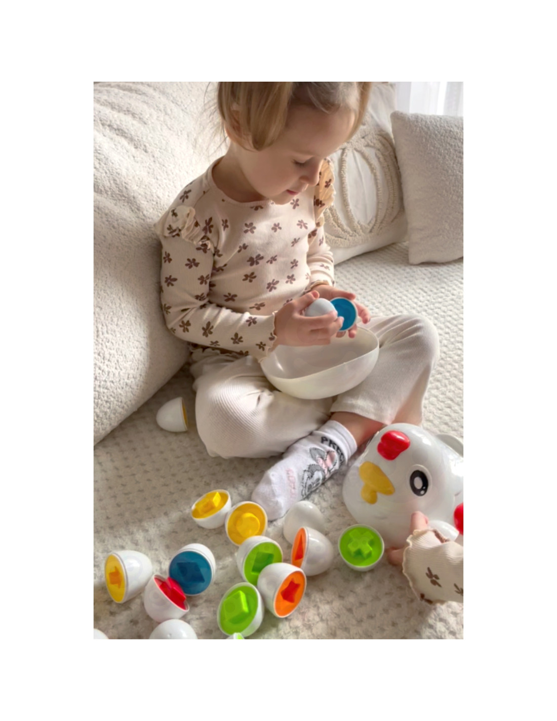 The Colorful Chicken Sorter from WOOPIE is a multifunctional educational toy that develops key skills in children through play. Inside the chicken, a set of toy eggs of various shapes must be matched to the appropriate holes, allowing toddlers to learn to recognize shapes and colors and develop their manual skills . Each of the 12 pieces has a different shape and color, making the toy not only visually appealing but also incredibly educational. The chicken opens up so toddlers can easily store all the pieces inside, which also teaches them organization and order.