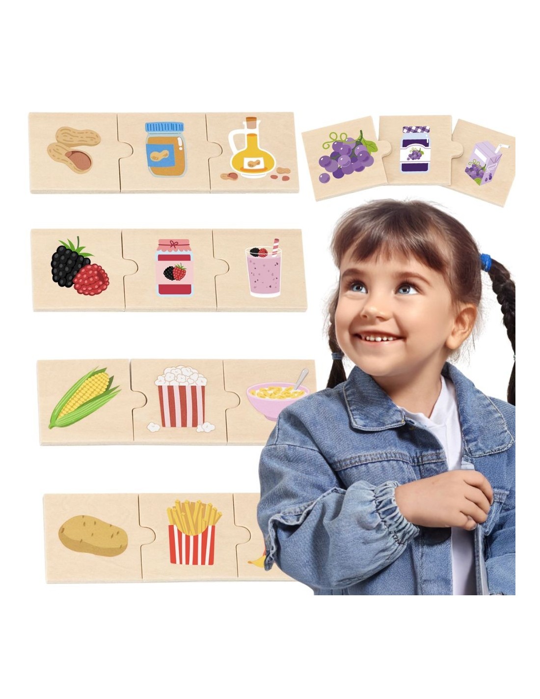 The VIGA Discover the Connection Between Nature and Food Puzzle Set teaches children in a playful way how plant-based products are transformed into delicious foods. By matching plants and harvests to products like popcorn, cereal, peanut butter, or pasta, little ones discover where these everyday delicacies come from. This type of play develops an understanding of food production processes and encourages them to explore the stages of processing crops.