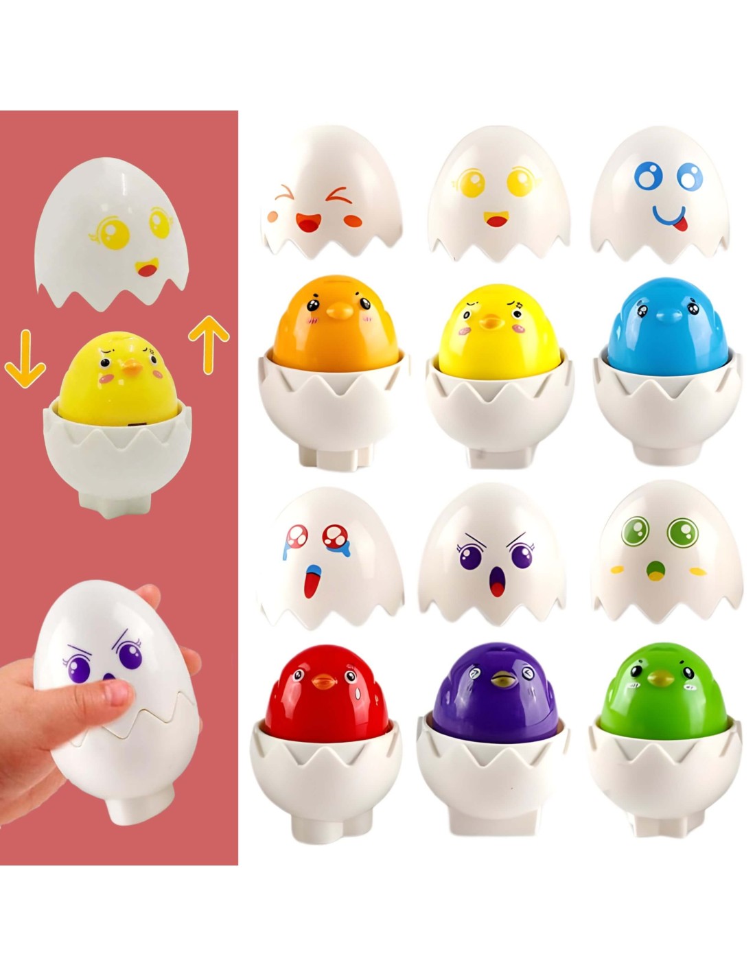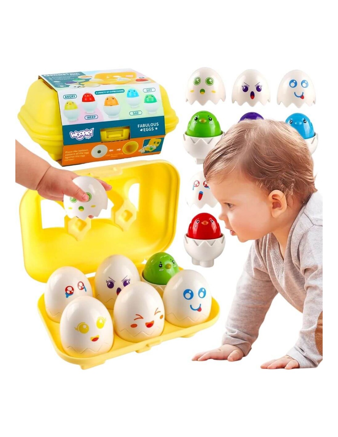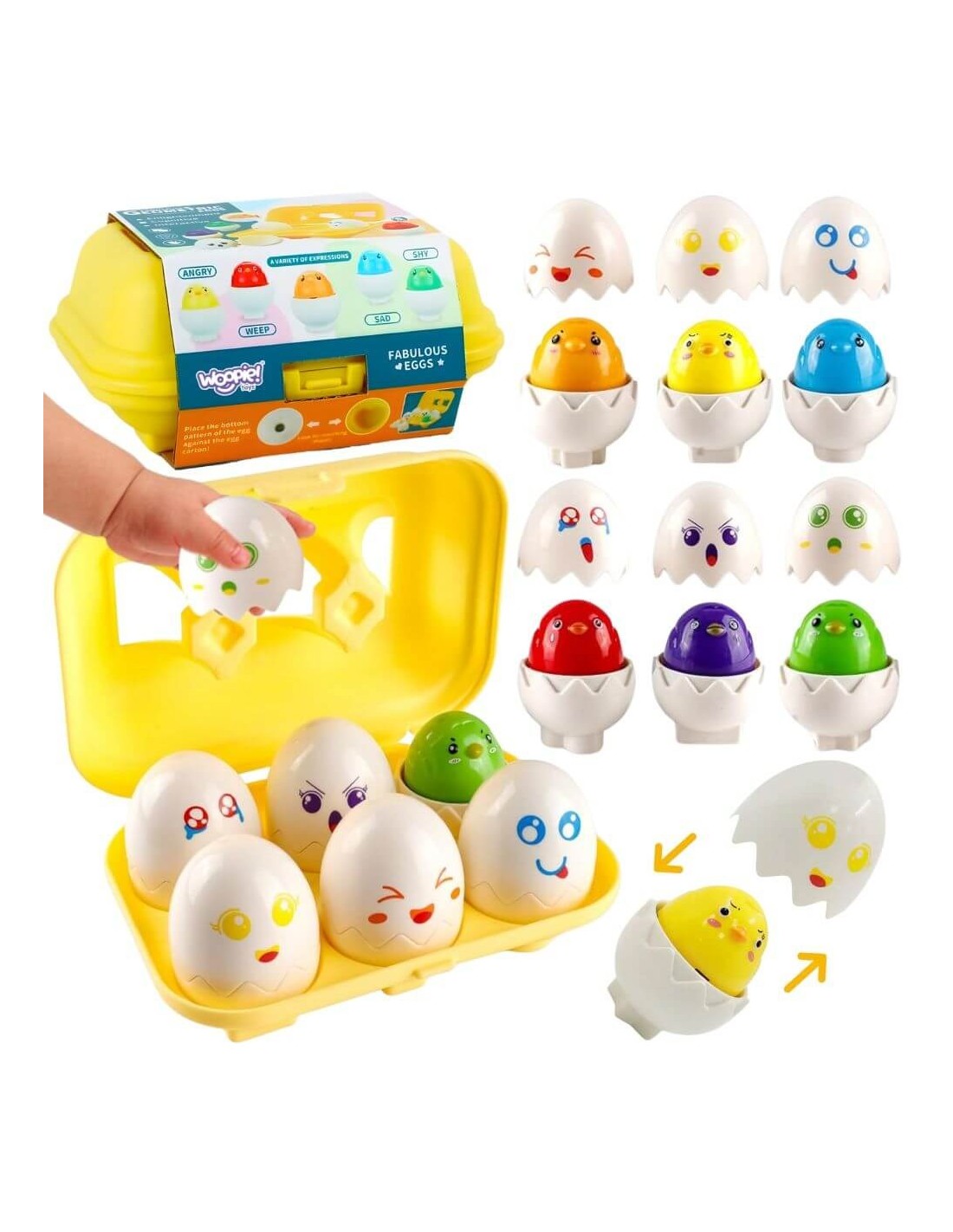 White educational eggs with colorful stickers from the Woopie brand will introduce your child to a world full of colors, shapes, and funny expressions . Each of the six adorable eggs contains a colorful chick with a different, funny expression. Pressing it will trigger a sound effect. Your little one's task is not only to match the correct shell to the egg, but also to fit it into the correct slot in the egg carton . Each egg has a unique geometric shape on the bottom, corresponding to a hole in the box. These funny expressions are a great way to teach children to recognize and label emotions. They help them easily and enjoyably understand what different feelings look like and what they mean. They're a fantastic way to develop logical thinking and coordination skills!