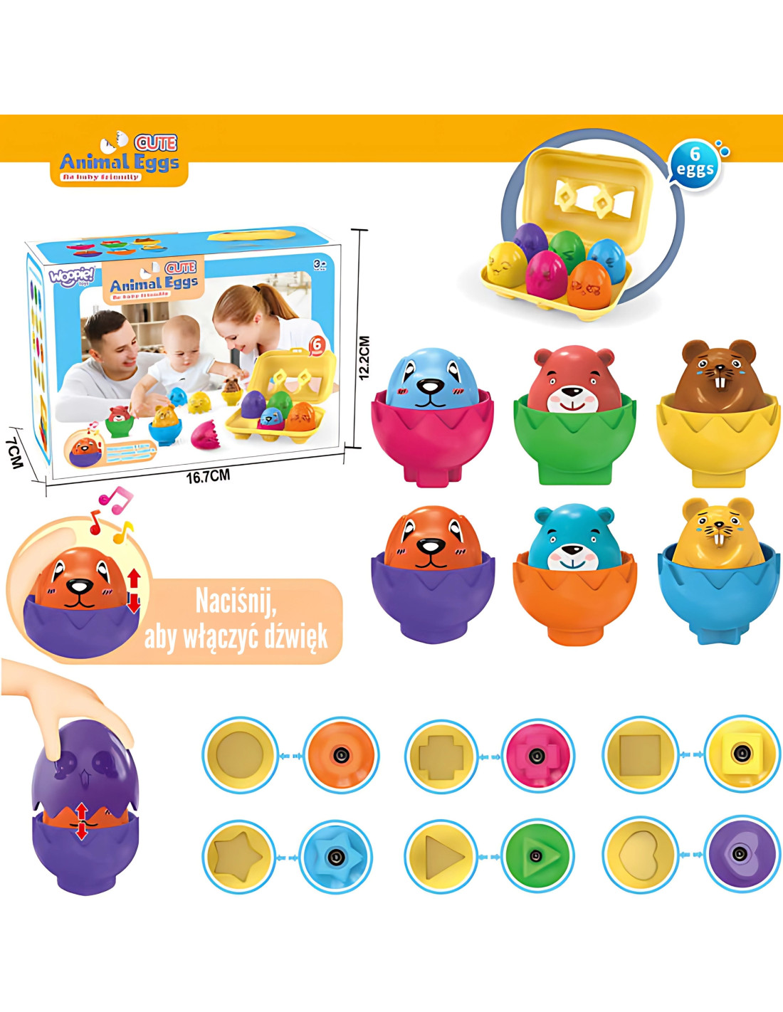 Discover the magical world of Woopie! Adorable Animal Eggs – a toy that will delight your child and open the door to fascinating learning through play! This charming set of 6 eggs , with cute animals hiding inside, is the perfect way to develop your little one's senses and fine motor skills. Your little one's task isn't just to open the egg , but above all, to fit it into the correct slot in the egg carton . Each egg has a unique geometric shape on the bottom, which corresponds to a hole in the box. Pressing on the animal figure also makes a sound effect. The fun facial expressions on the eggshells are a great way to teach children to recognize and name emotions. They help little ones easily and enjoyably understand what different feelings look like and mean. Get ready for hours of engaging and educational fun!